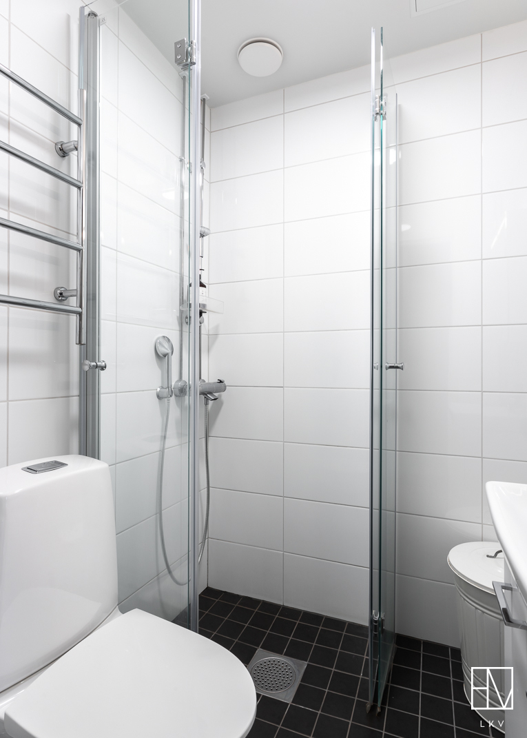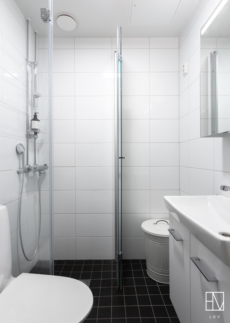 Varusteet: suihkuseinä, pesukoneliitäntä, lattialämmitys, wc-istuin, suihku, kiinteät valaisimet