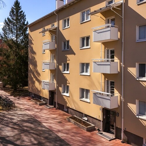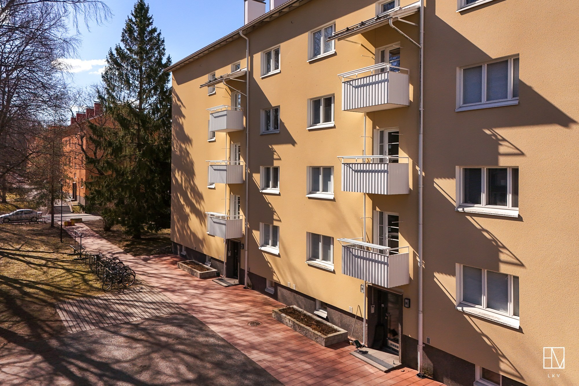 Asunnon kauniit yksityiskohdat, kuten lautalattia henkivät vanhan talon romantiikkaa. Valoisan ja läpitalon kaksion neliöt ovat käytetty tehokkaasti ja se soveltuu mainiosti niin sinkulle kuin pariskunnallekin. Hissittömän talon ylimmän 4. kerroksen huoneistossa on isot huoneet, joten etätyöpisteen saa helposti toteutettua esimerkiksi olohuoneen yhteyteen. Keittiö on erillinen, mutta käytännöllisesti olohuoneen yhteydessä. Tämän lisäksi asunnossa on hiljattain putkiremontin yhteydessä saneerattu kylpyhuone, jossa on paikka pyykinpesukoneelle sekä lattialämmitys. Säilytystilaa on hyvin, sillä huoneistossa on kaappitilaa ja tämän lisäksi asunnolle kuuluu vintti- sekä kellarikomero.