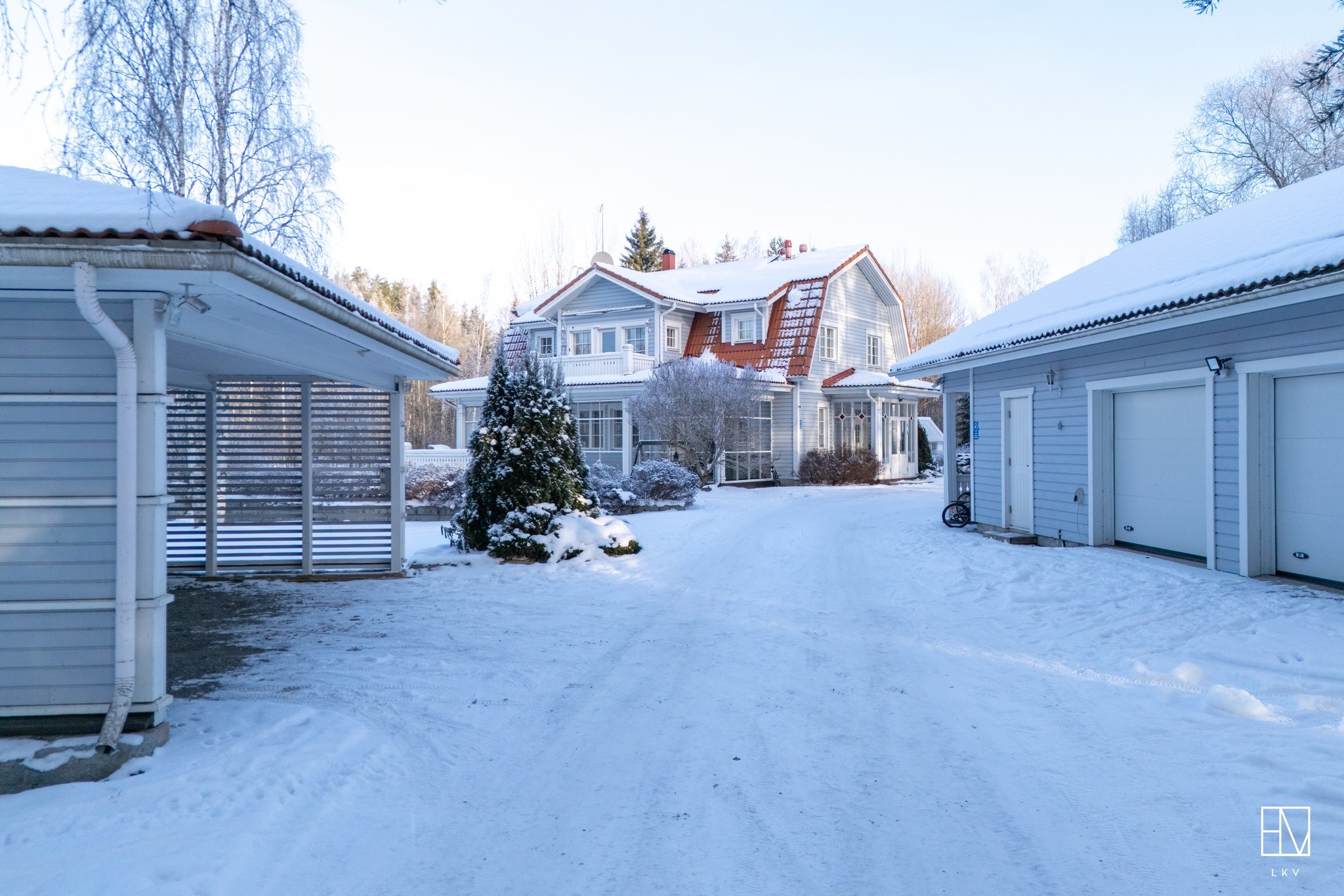 Kokonaisuuden kruuna iso lämmin autotalli/varasto, joka on monen taloa etsivän tärkeimpiä kriteerejä. Talli mahdollistaa hyvin myös esimerkiksi harraste- tai yritystoiminnan, sillä autoille on pihassa erillinen kahden auton katos.