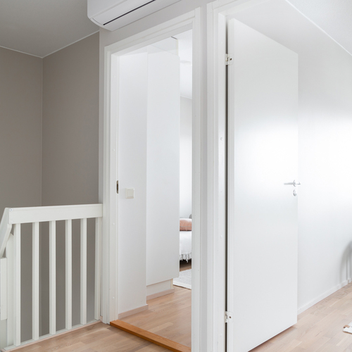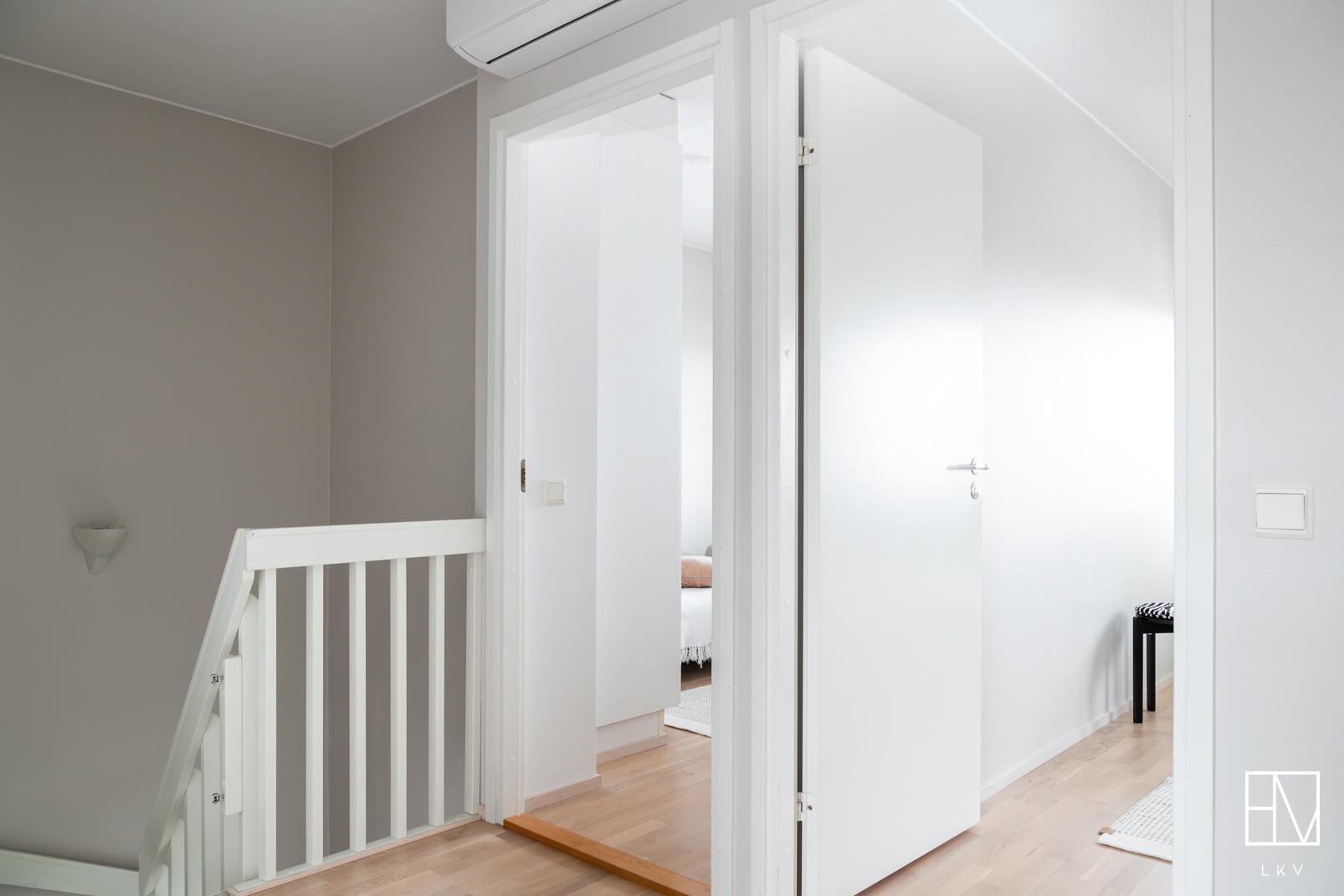 Yläkerran aula: Seinät maalattu, lattia parkettia. Yläkerran aulassa ilmalämpöpumppu.