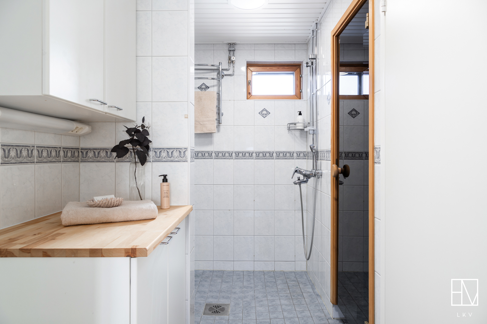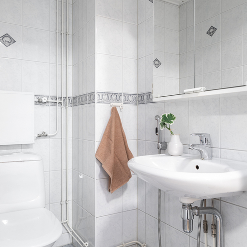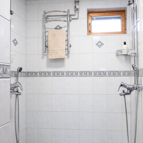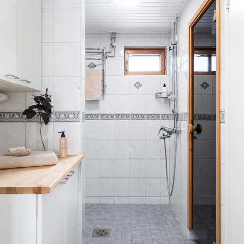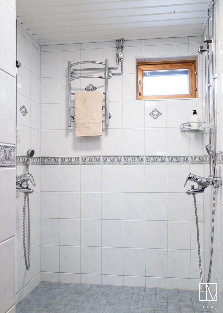 Varustus: 2 x suihku. Kylpyhuoneen yhteydessä kodinhoitotilaa, jossa kaapistot ja pesukoneliitäntä.