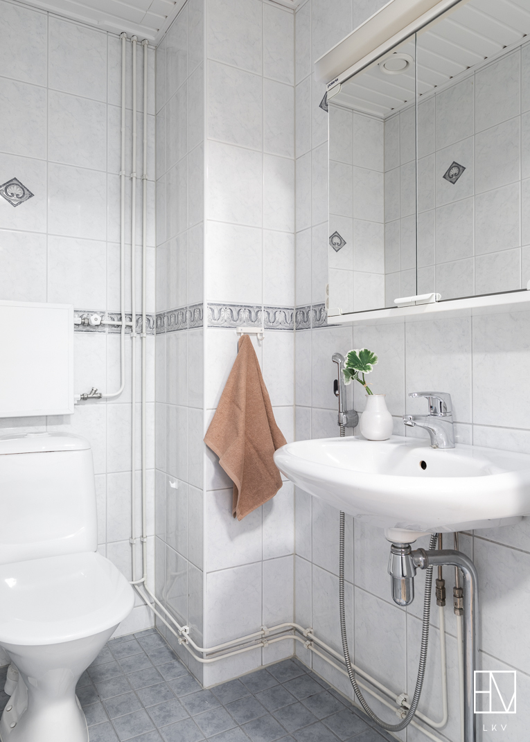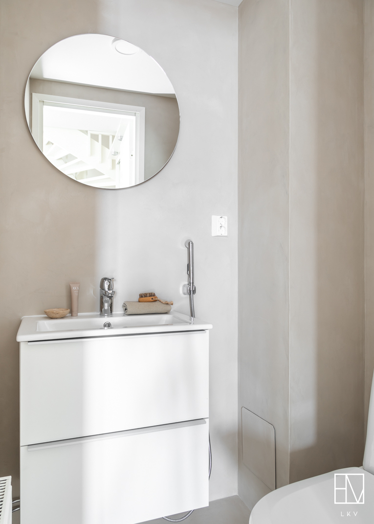 - Alakerran wc:n pinnoitus decofloorilla, valaistuksen uusiminen, allaskaapin ja peilin uusiminen.