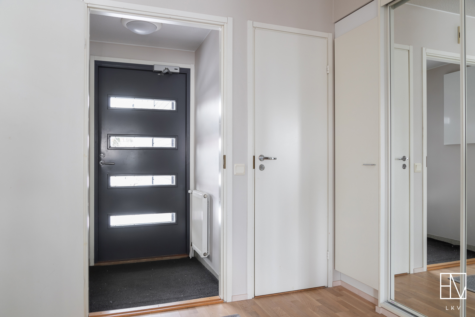 Eteinen/eteisaula: Seinät maalattu, lattia parketti. Eteisessä liukuovikaapisto.