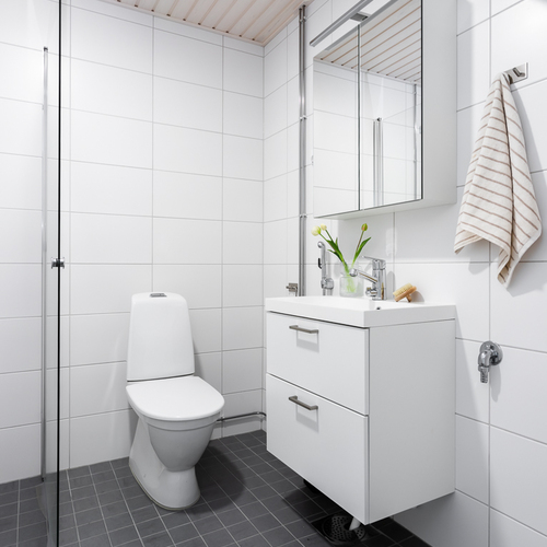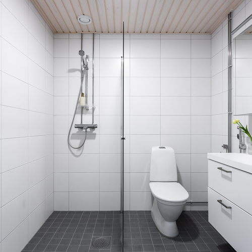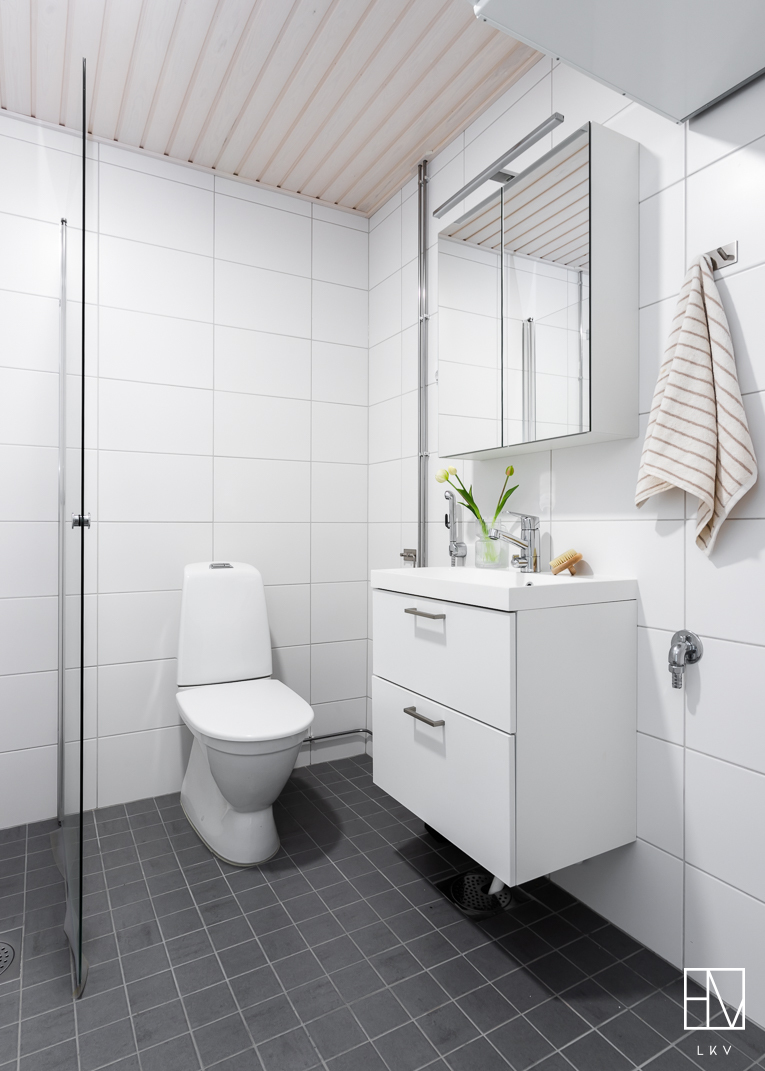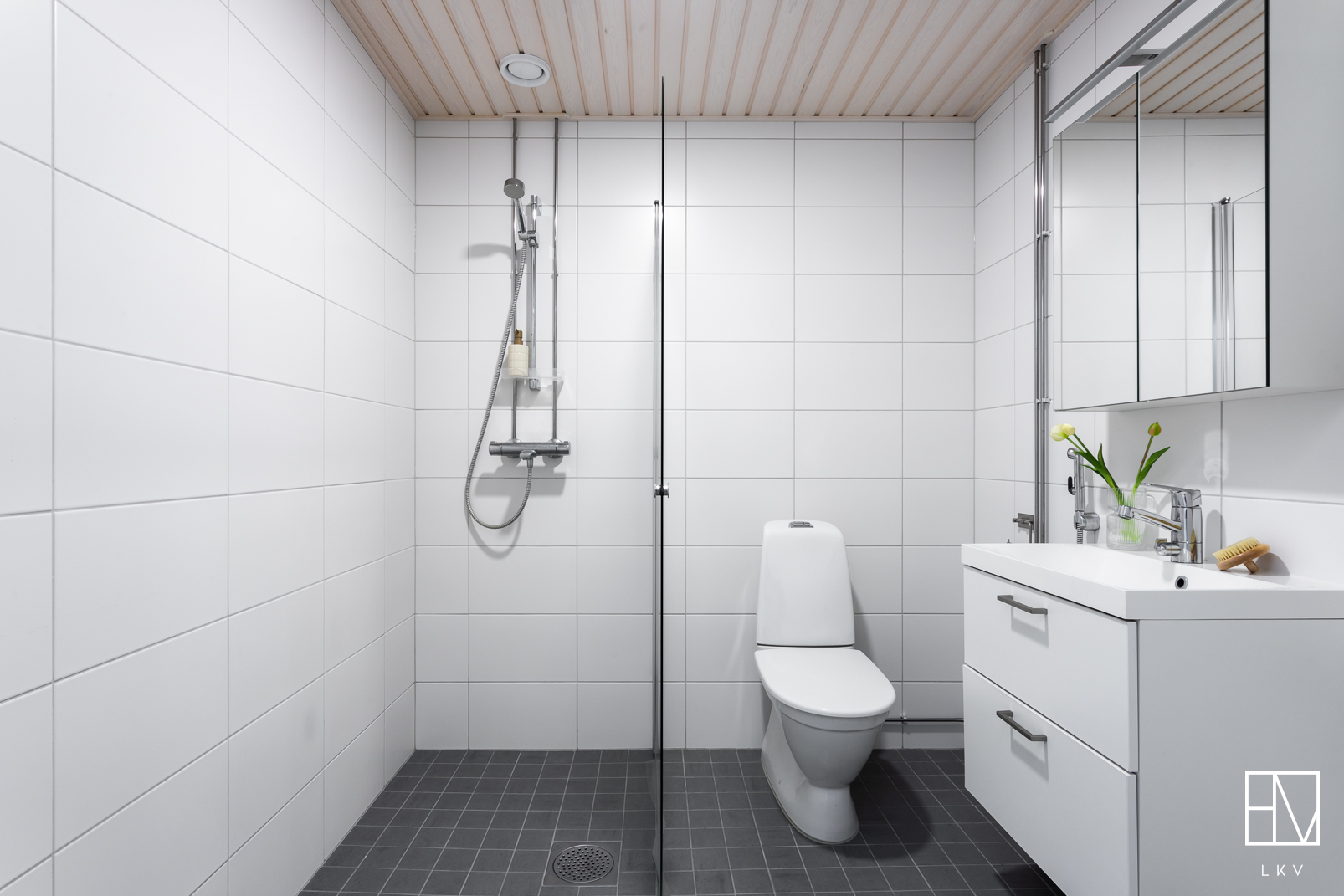 Varusteet: pesukoneliitäntä, lattialämmitys, wc-istuin, suihku, peilikaappi, kiinteät valaisimet