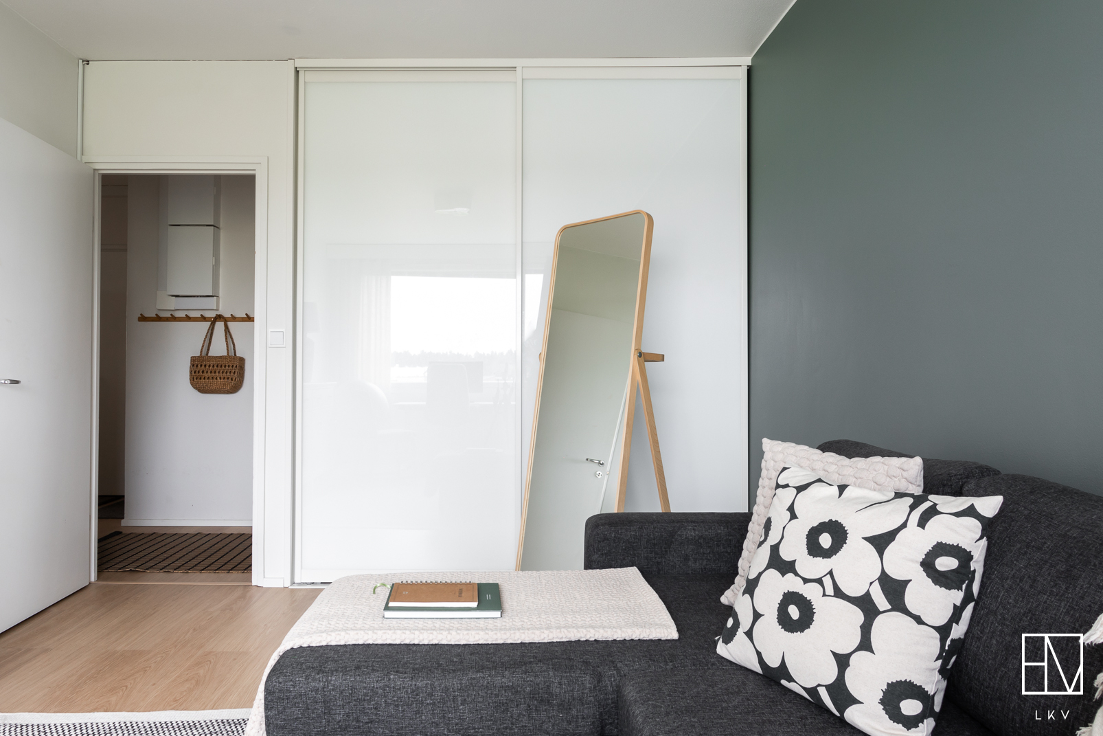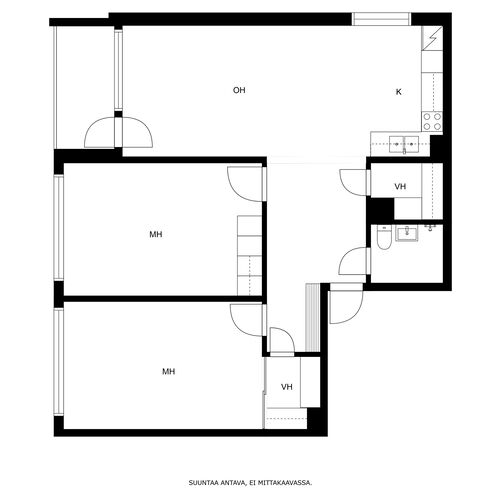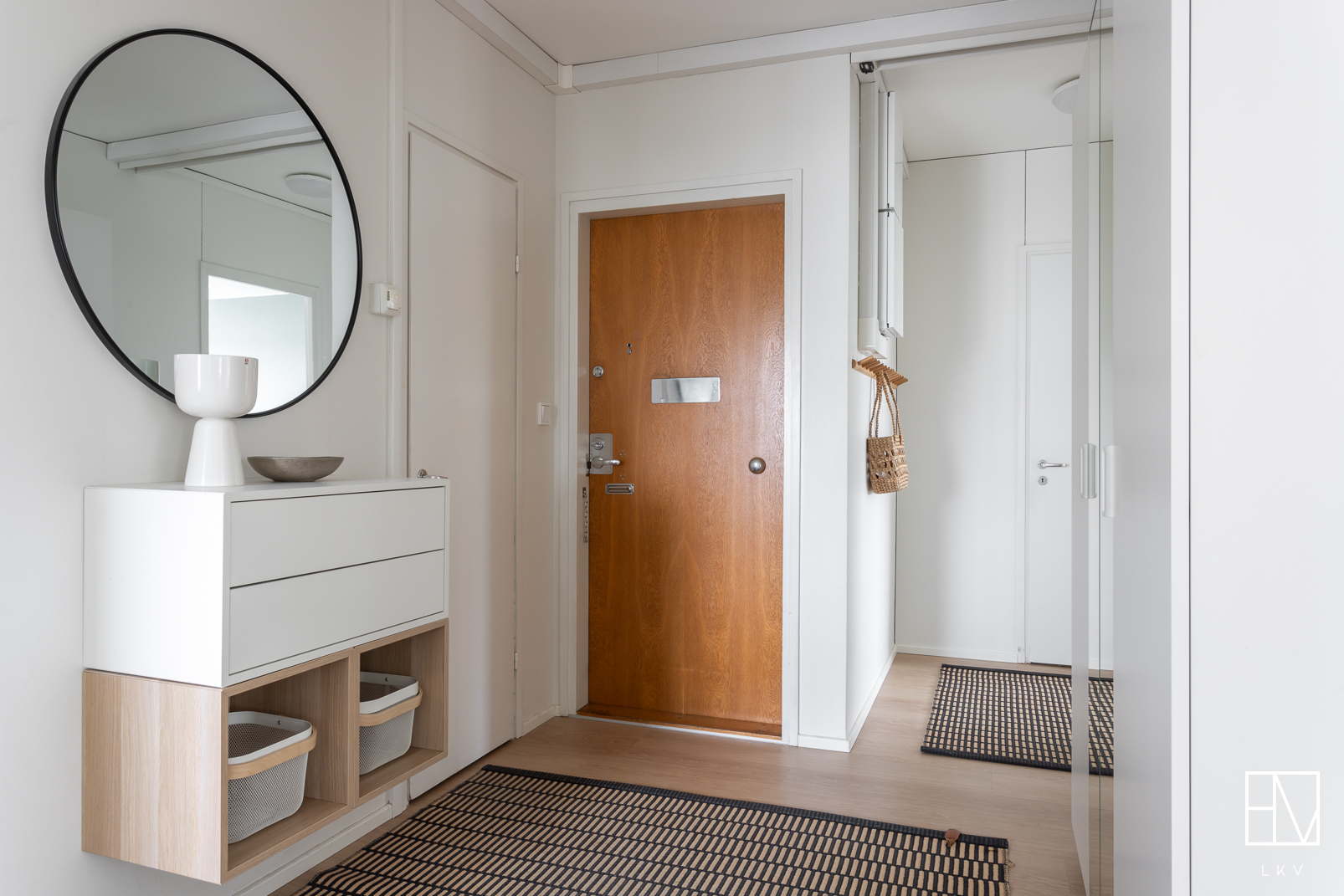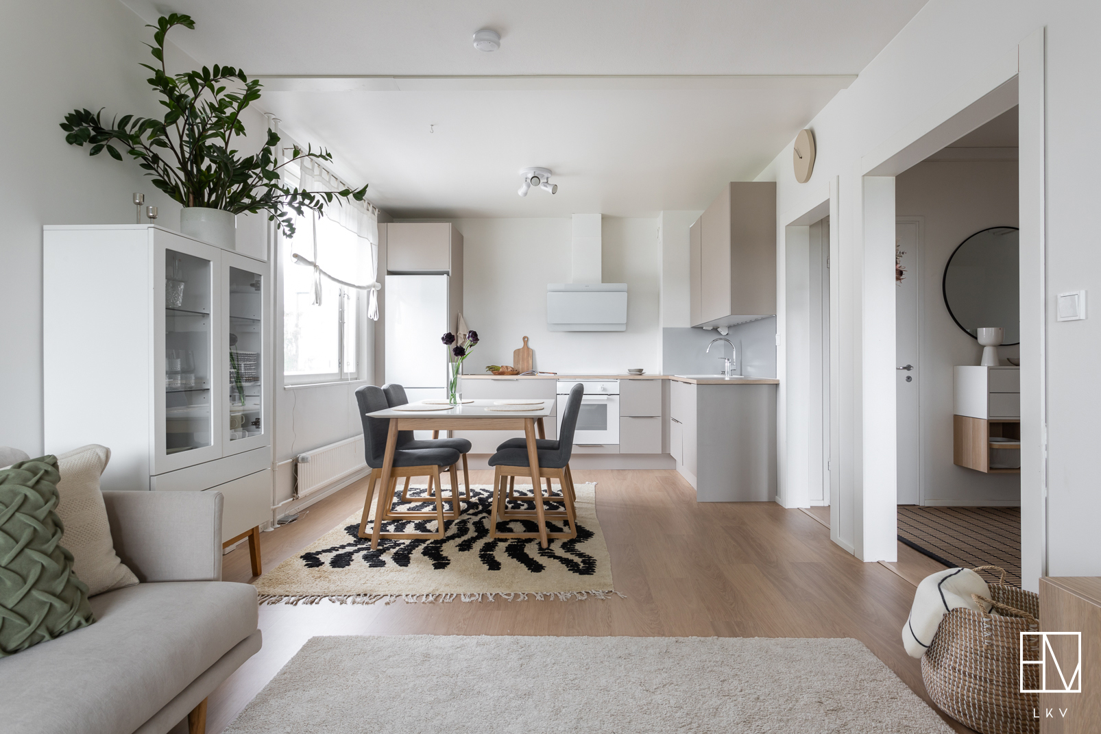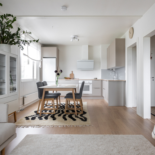 Avara ja toimiva pohjaratkaisu kahdella vaatehuoneella tekee asumisesta helppoa ja sujuvaa. Tilava olohuone yhdistyy luontevasti ruokailu- ja keittiötiloihin, mikä lisää kodin viihtyisyyttä.