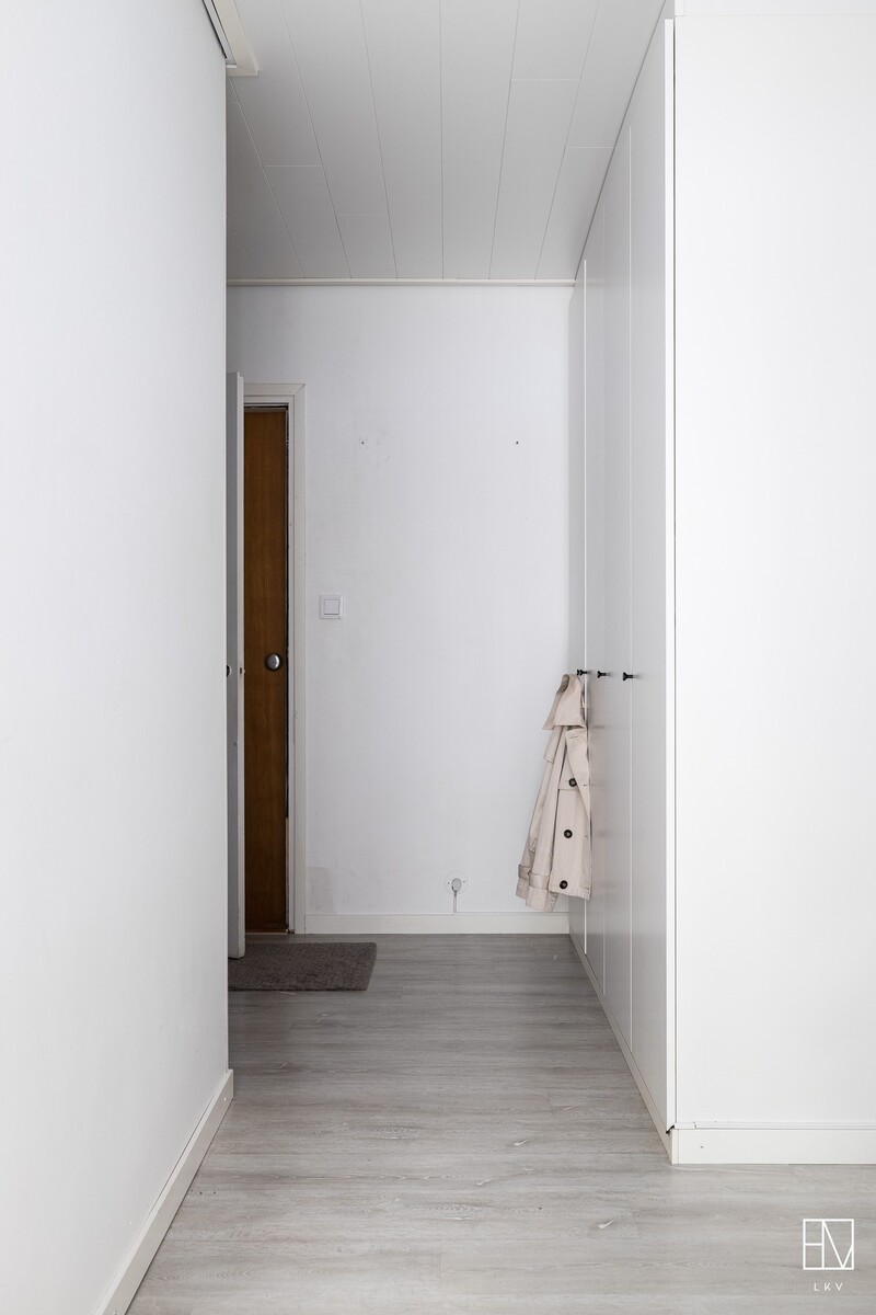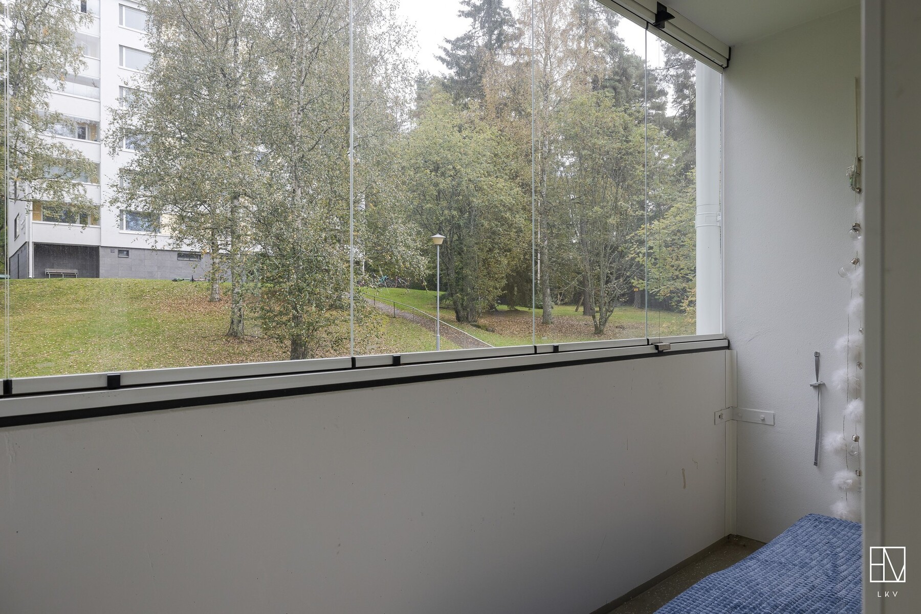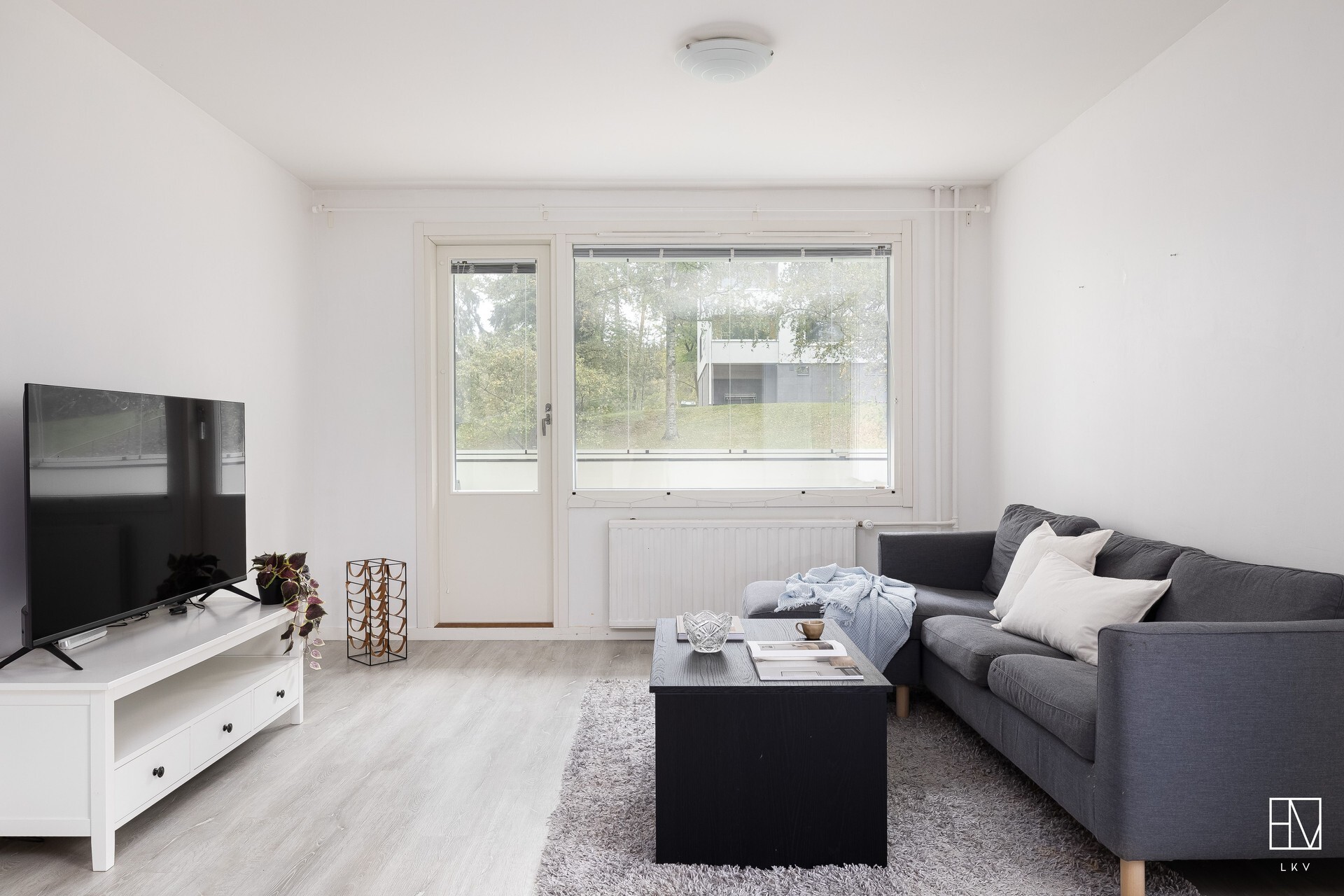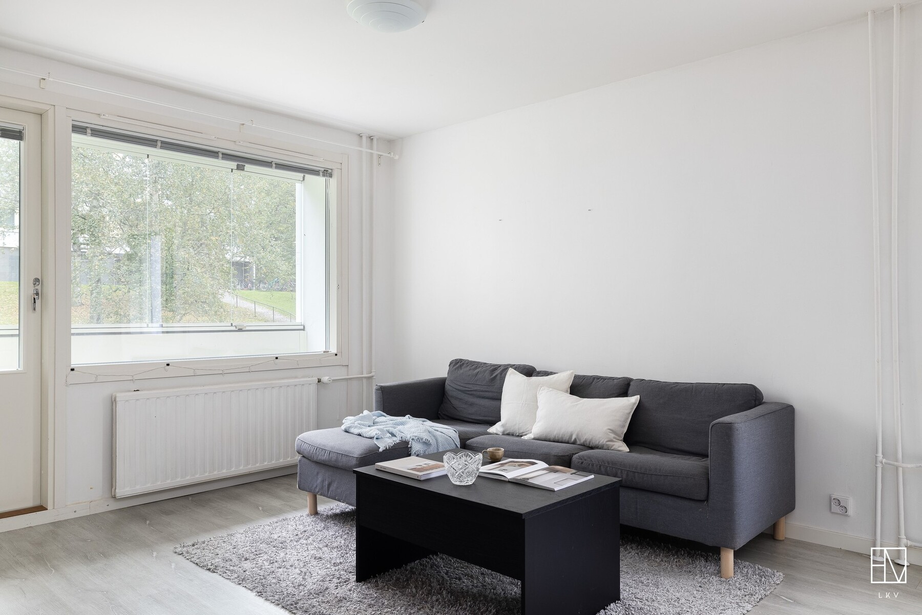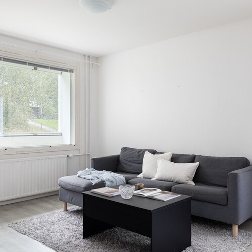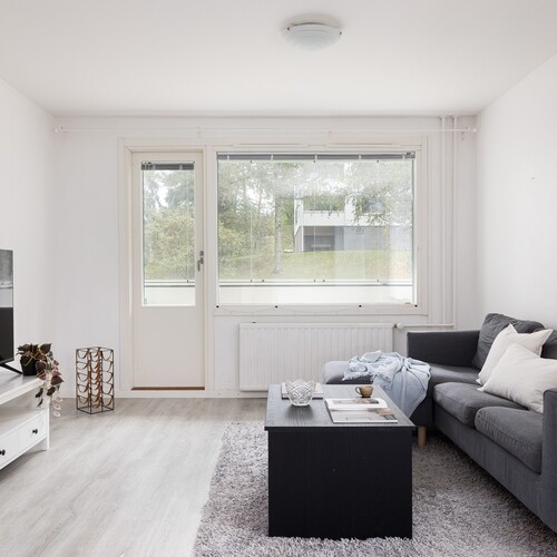 Olohuone on mukavan kokoinen, ja siitä on kulku lasitetulle parvekkeelle, joka suuntautuu puistomaiselle sisäpihalle. Olohuone yhdistyy tyylikkääseen keittiöön, jossa on hyvin tasotilaa kokkailuun. Makuuhuone on tilava, ja säilytystilaa on koko seinän levyisessä liukuovikaapistossa. Pohjaratkaisu onkin todella toimiva niin yksin asuvalle kuin pariskunnalle.