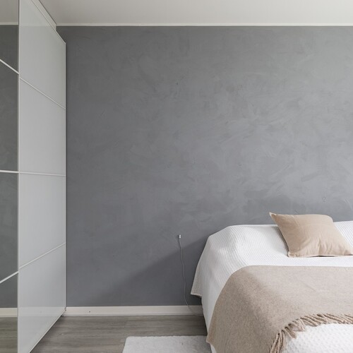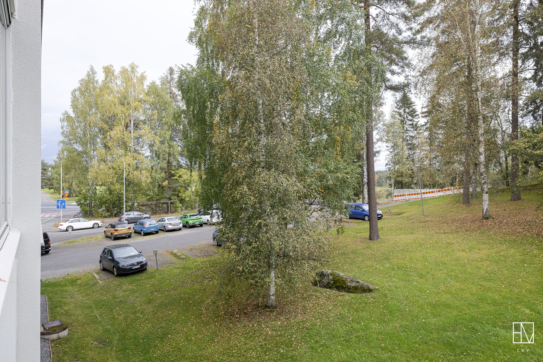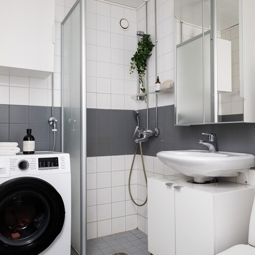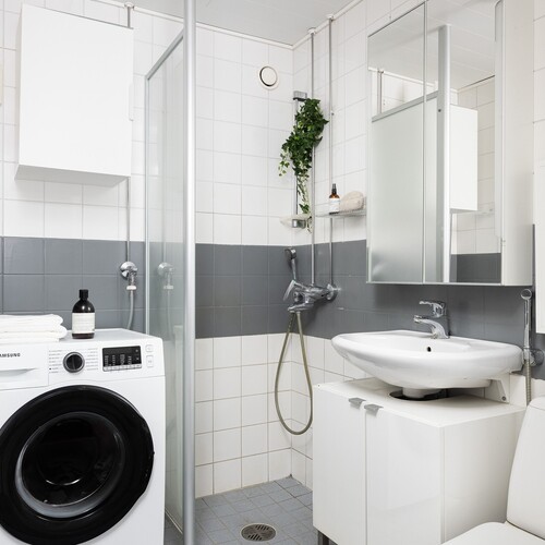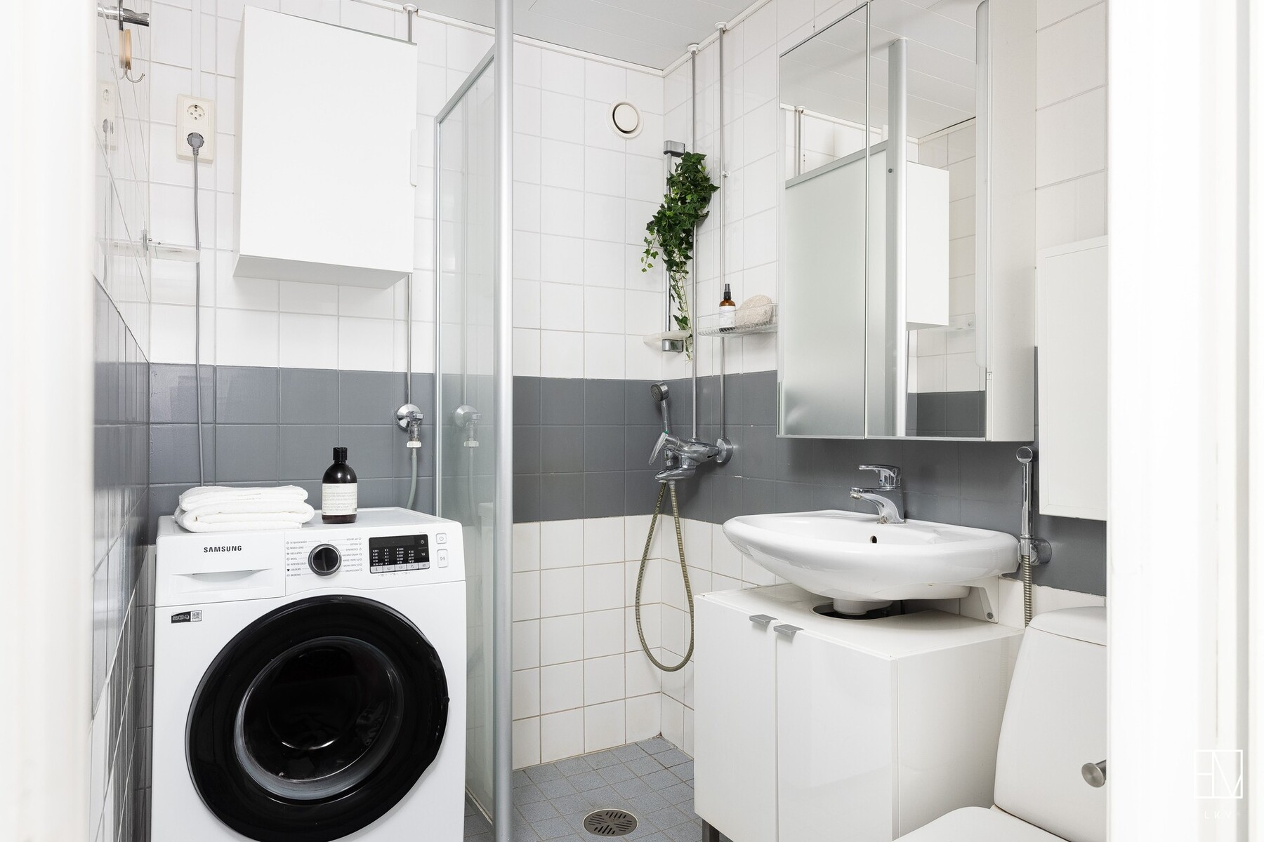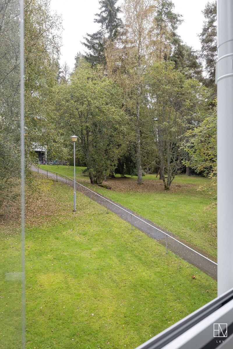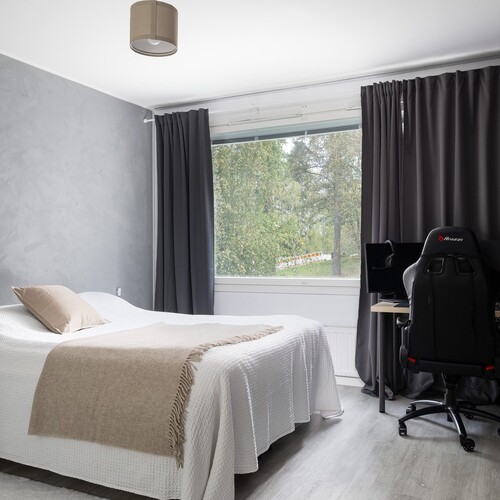 Olohuone on mukavan kokoinen, ja siitä on kulku lasitetulle parvekkeelle, joka suuntautuu puistomaiselle sisäpihalle. Olohuone yhdistyy tyylikkääseen keittiöön, jossa on hyvin tasotilaa kokkailuun. Makuuhuone on tilava, ja säilytystilaa on koko seinän levyisessä liukuovikaapistossa. Pohjaratkaisu onkin todella toimiva niin yksin asuvalle kuin pariskunnalle.