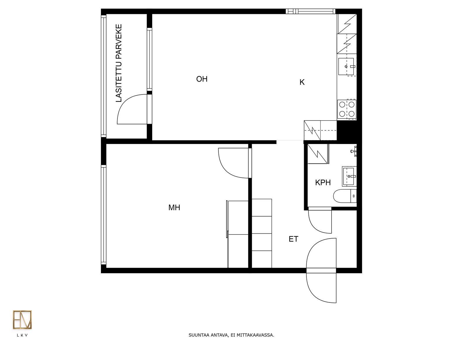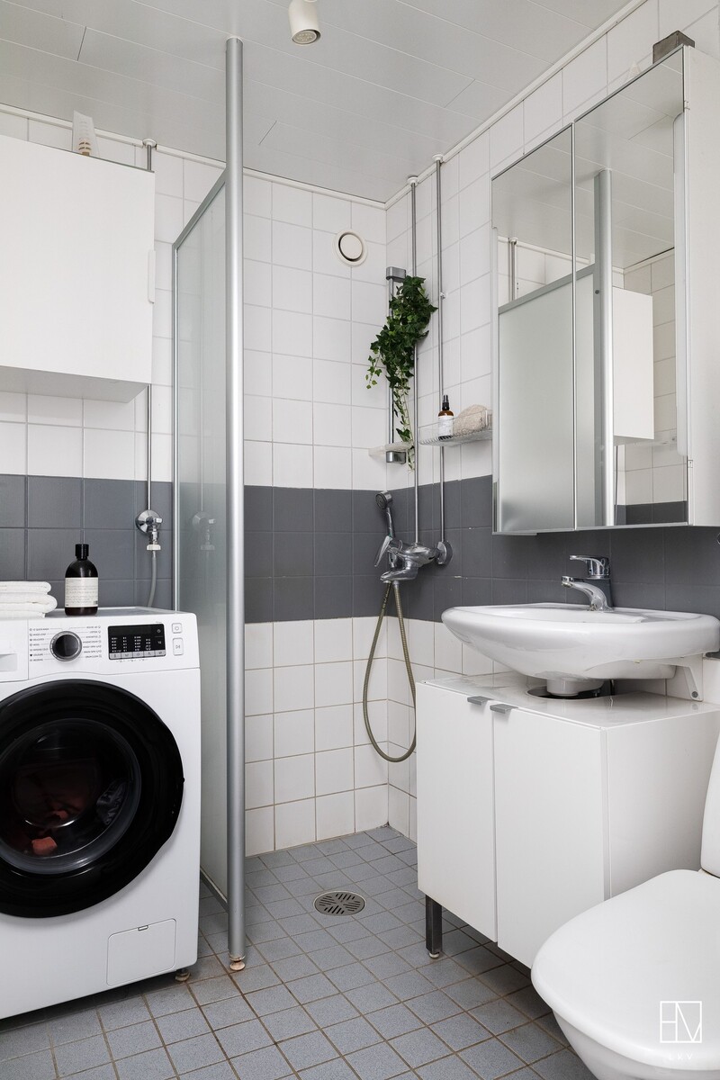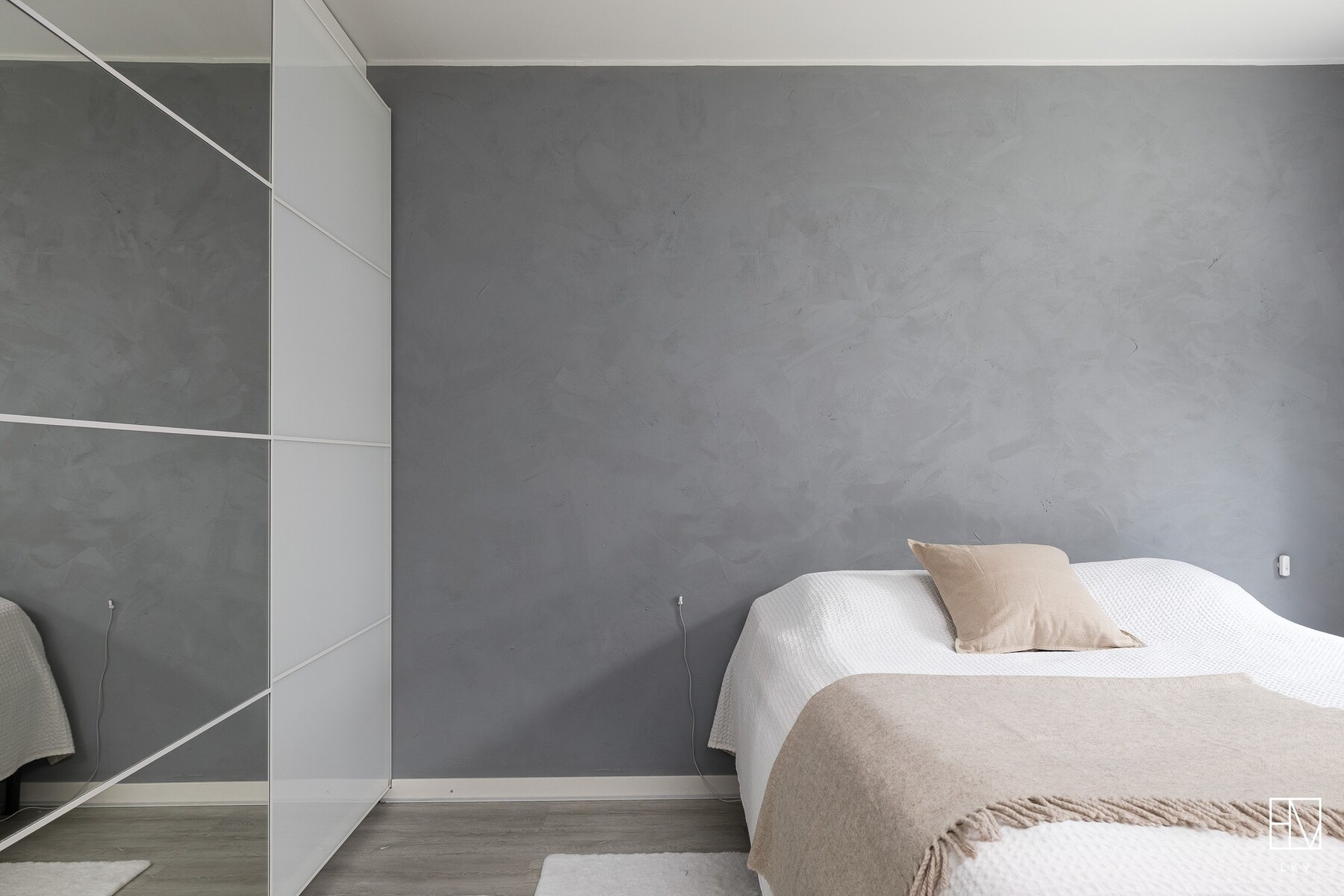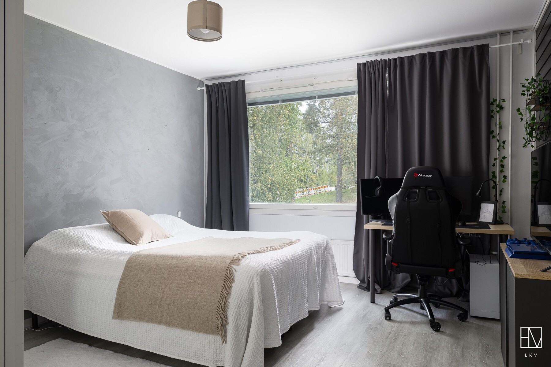 Olohuone on mukavan kokoinen, ja siitä on kulku lasitetulle parvekkeelle, joka suuntautuu puistomaiselle sisäpihalle. Olohuone yhdistyy tyylikkääseen keittiöön, jossa on hyvin tasotilaa kokkailuun. Makuuhuone on tilava, ja säilytystilaa on koko seinän levyisessä liukuovikaapistossa. Pohjaratkaisu onkin todella toimiva niin yksin asuvalle kuin pariskunnalle.