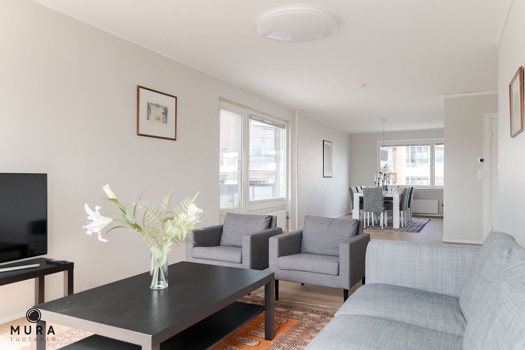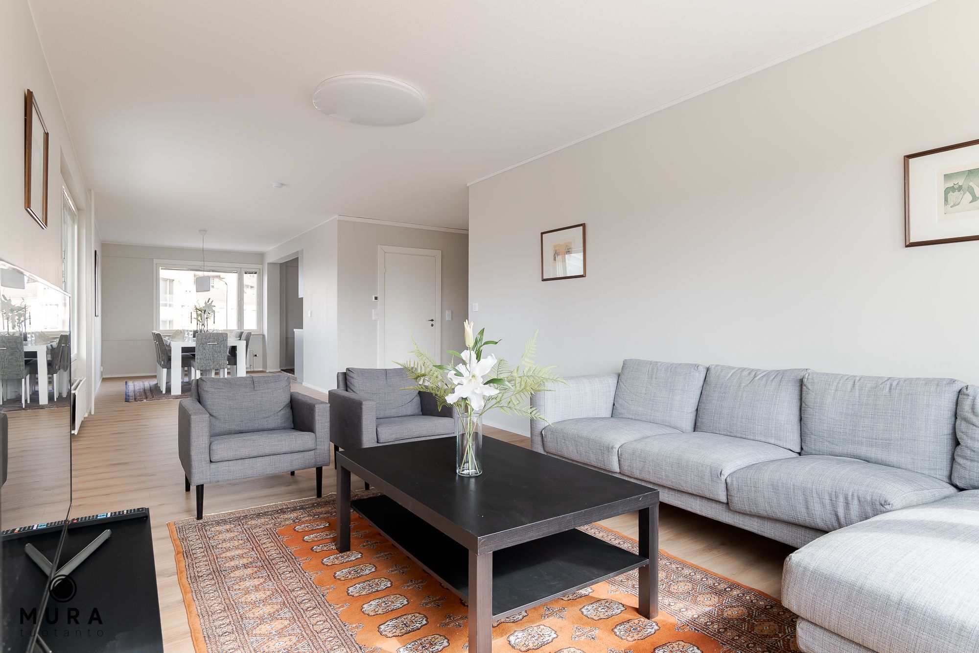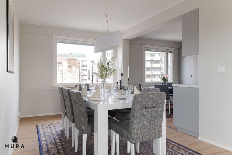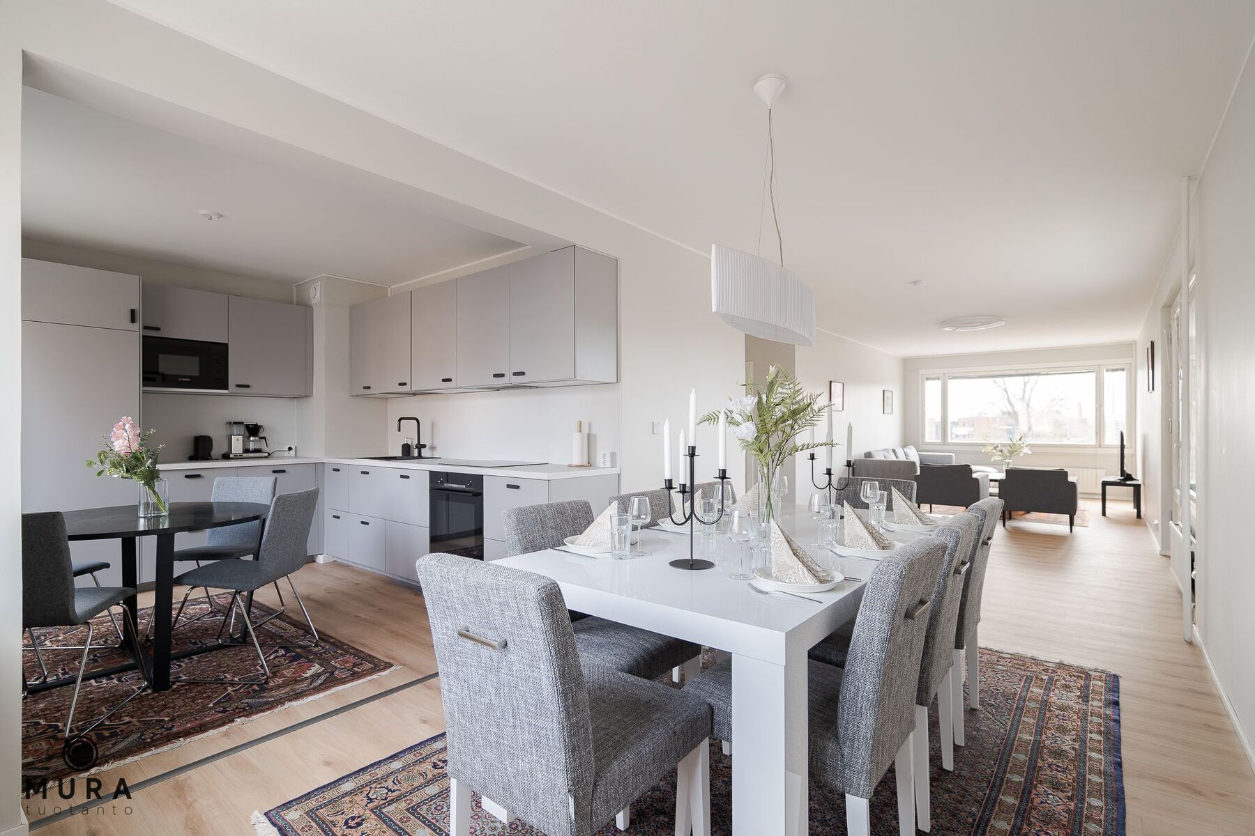 Kolme makuuhuonetta takaavat tilaa isommallekin perheelle, ja päämakuuhuone ihastuttaa erityisen avaruudellaan. Keittiö ja ruokailutila muodostavat näyttävän kokonaisuuden, ja olohuoneen kanssa ne yhdistyvät yhdeksi valtavan suureksi oleskelutilaksi – täydellinen niin arkeen kuin juhlaan! Ikkunat kolmeen eri suuntaan tuovat valoa ja avaruutta koko asuntoon.