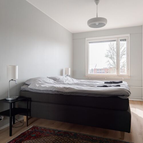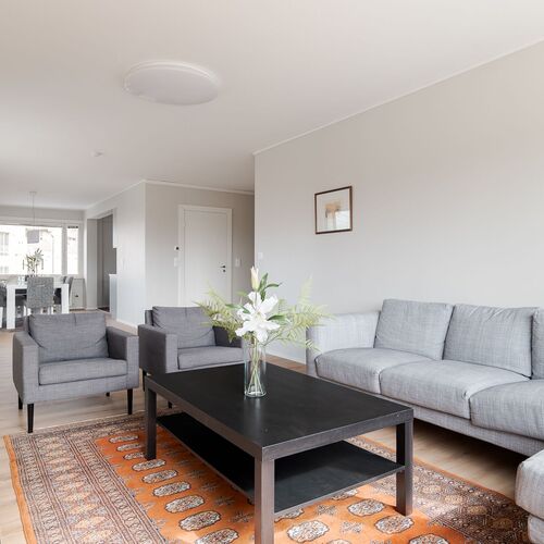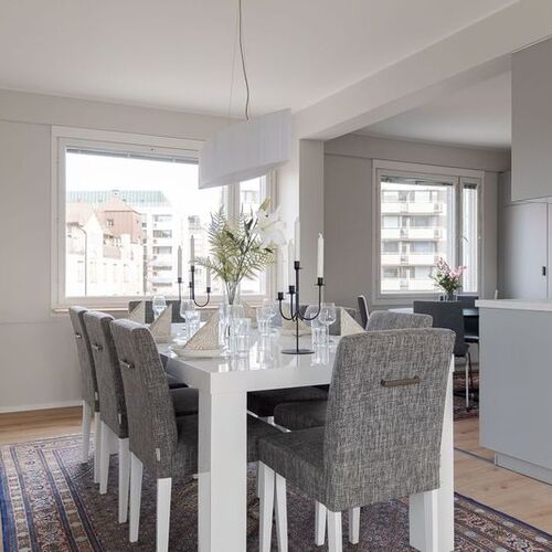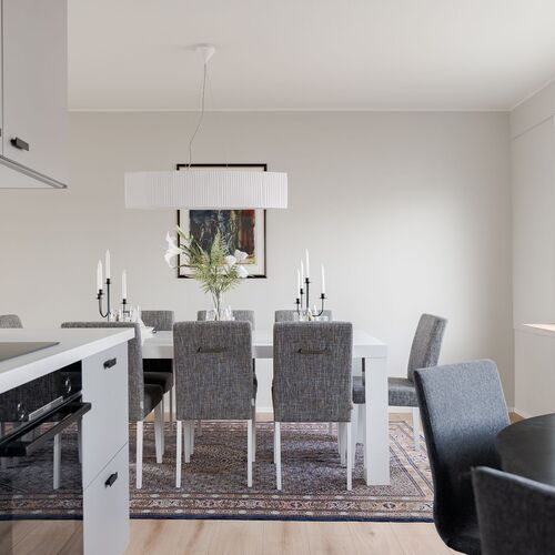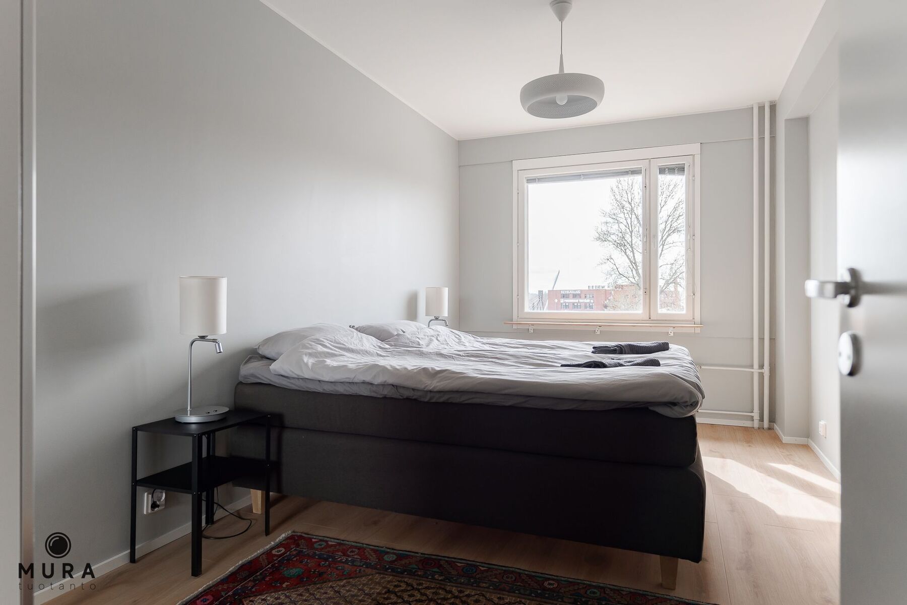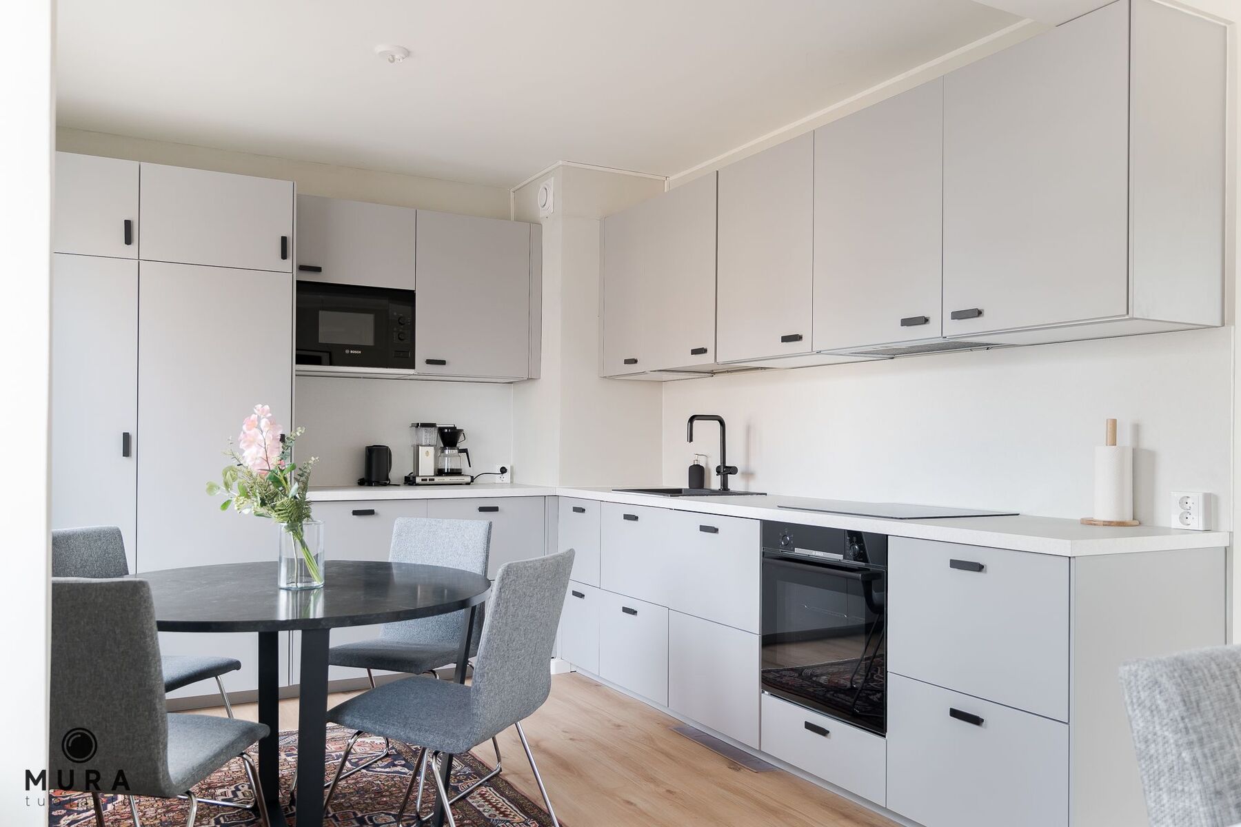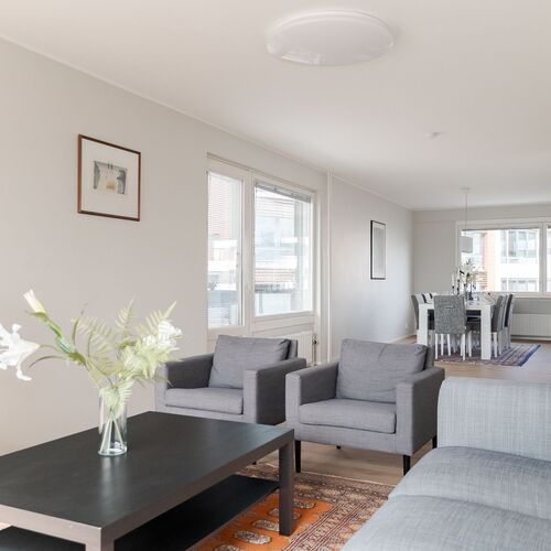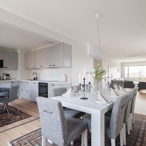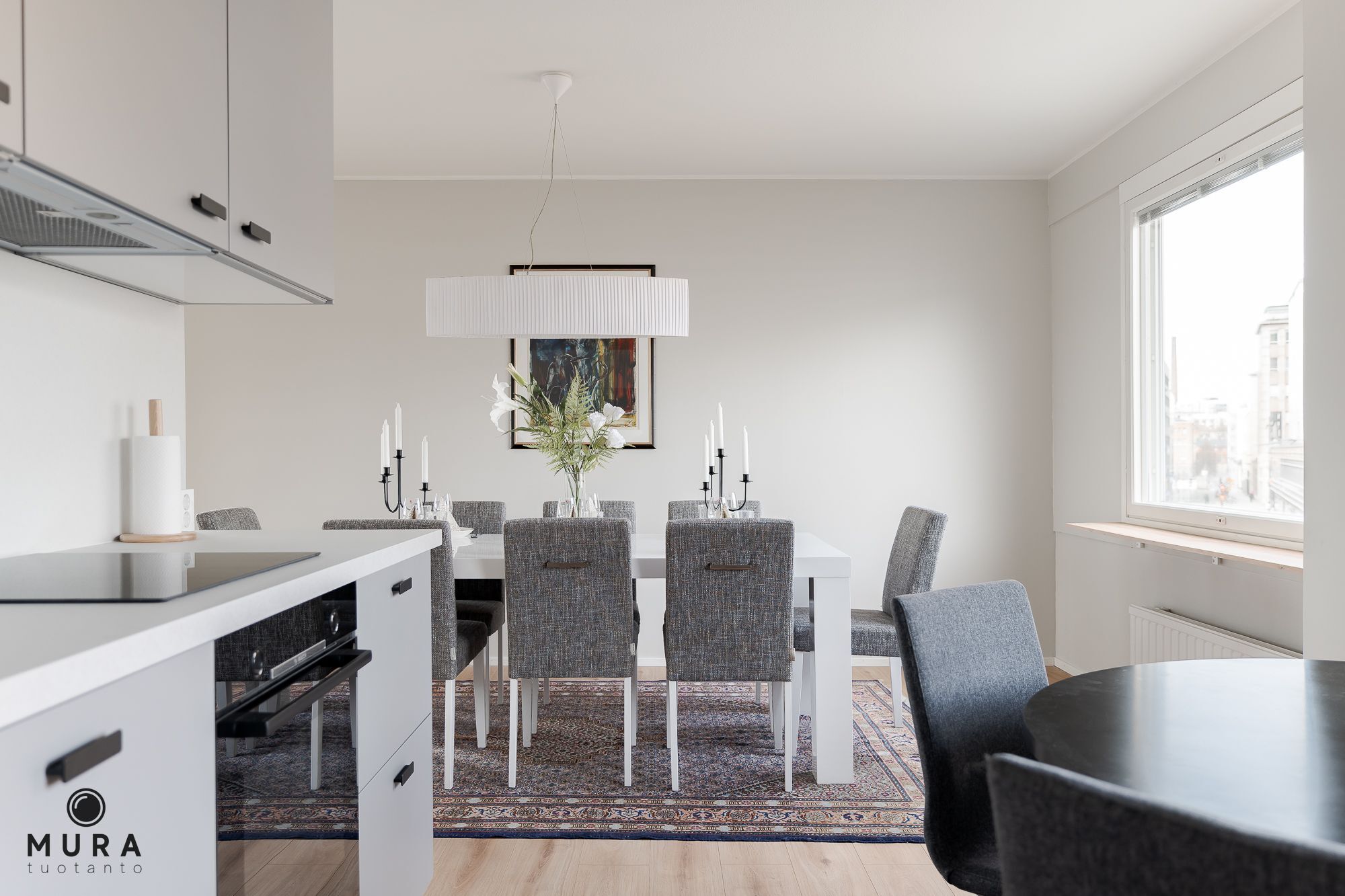 Kolme makuuhuonetta takaavat tilaa isommallekin perheelle, ja päämakuuhuone ihastuttaa erityisen avaruudellaan. Keittiö ja ruokailutila muodostavat näyttävän kokonaisuuden, ja olohuoneen kanssa ne yhdistyvät yhdeksi valtavan suureksi oleskelutilaksi – täydellinen niin arkeen kuin juhlaan! Ikkunat kolmeen eri suuntaan tuovat valoa ja avaruutta koko asuntoon.