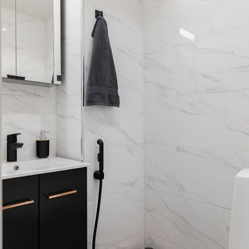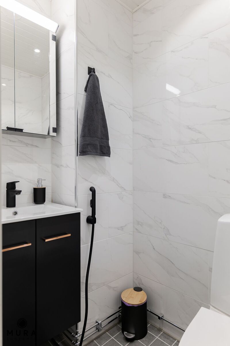 Varusteet: suihkuseinä, pesukoneliitäntä, lattialämmitys, wc-istuin, suihku, peili, kiinteät valaisimet