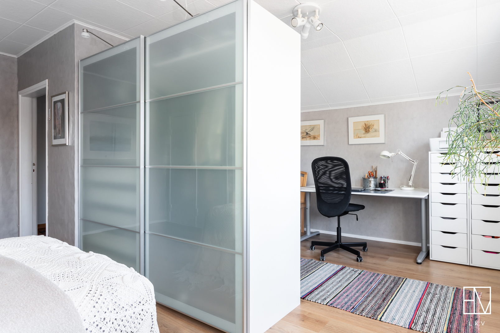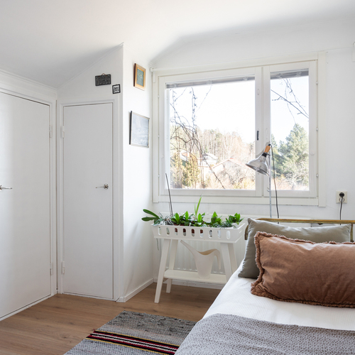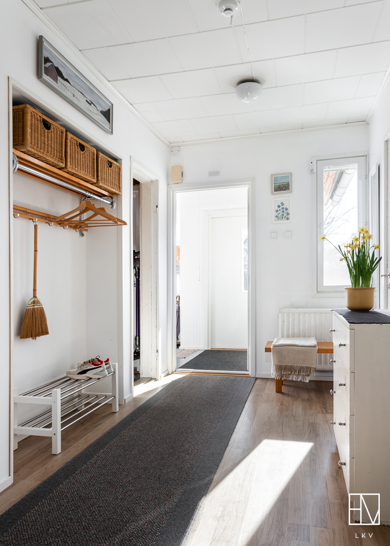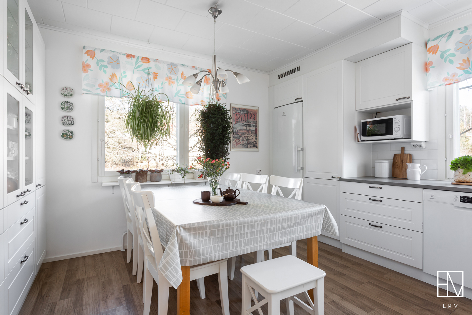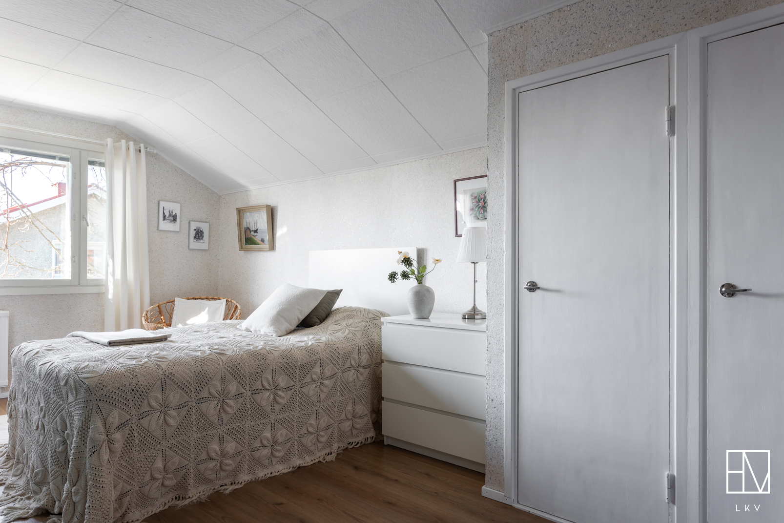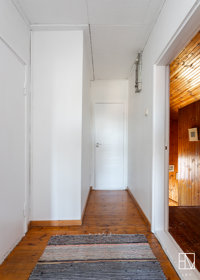 Kodissa on toimiva ja selkeä pohjaratkaisu. Keskikerroksessa sijaitsevat tyylikäs keittiö sekä kaksi huonetta. Yläkerrassa on kaksi makuuhuonetta, joista toinen on poikkeuksellisen tilava ja helposti jaettavissa kahdeksi erilliseksi makuuhuoneeksi tarpeen mukaan.