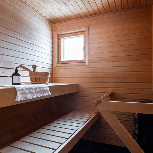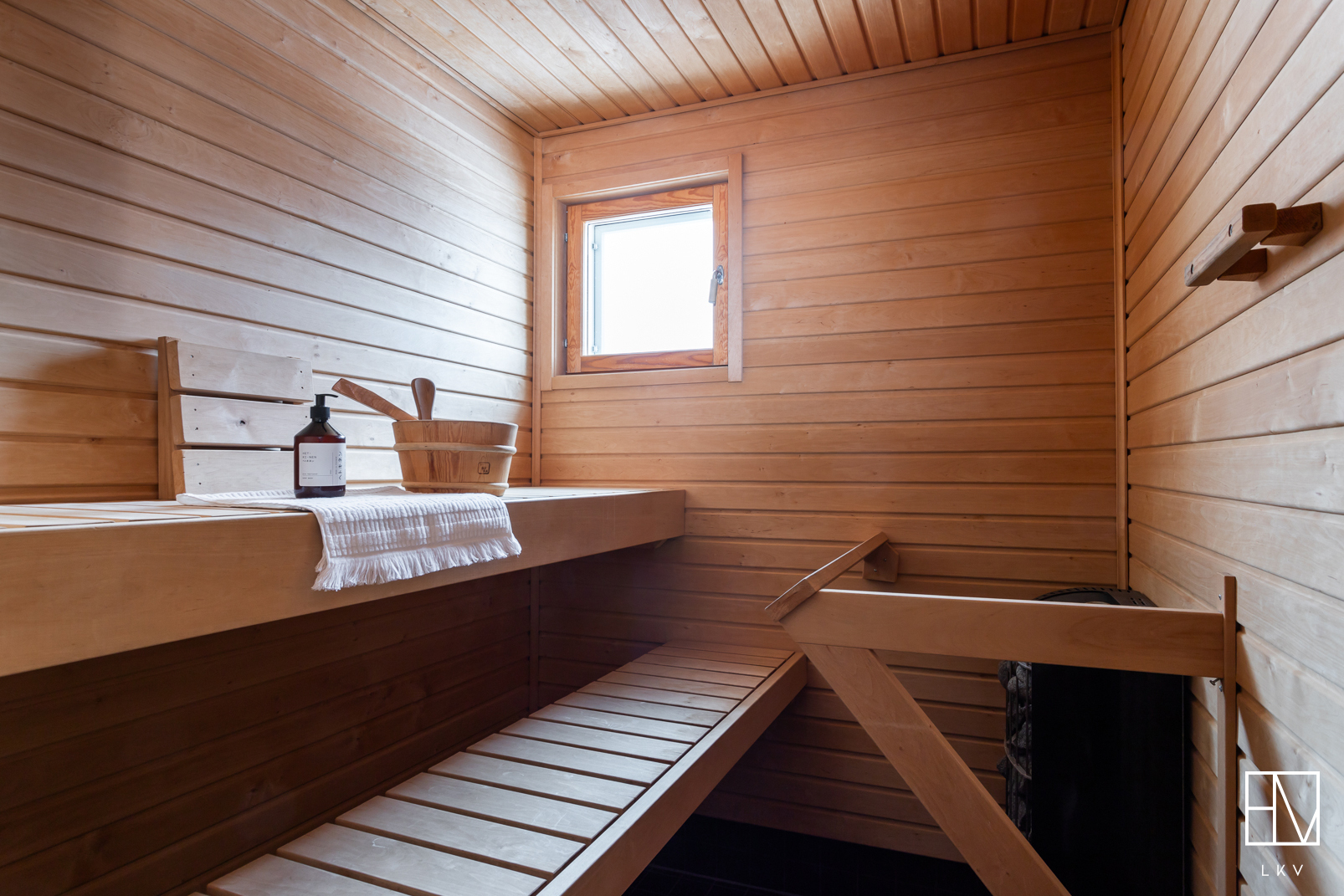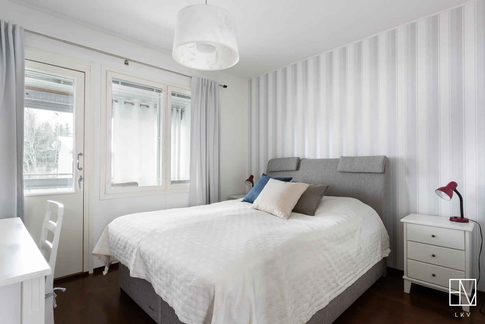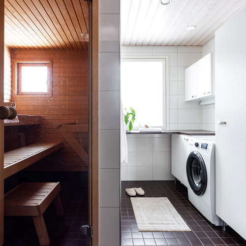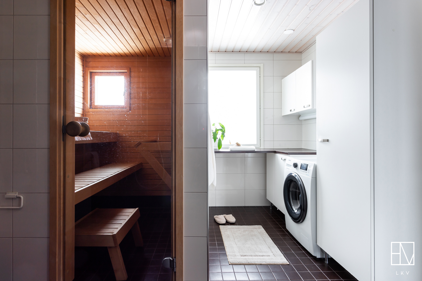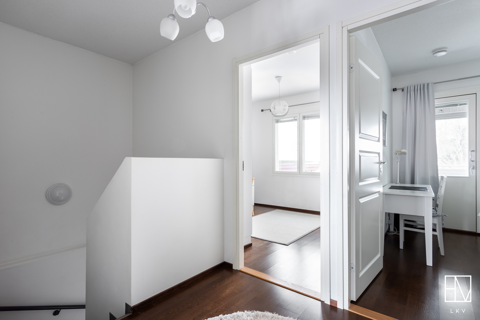 Yläkerrassa on aulan lisäksi kolme makuuhuonetta sekä kylpyhuone, jossa on kaksi suihkua. Yhdessä makuuhuoneessa on oma vaatehuone ja samasta huoneesta on käynti lasitetulle parvekkeelle. Kylpyhuoneen vieressä sijaitsee erittäin toimiva kodinhoitotila, jossa on hyvin tilaa pyykkihuollolle ja myös pesutornille. Oma sauna kruunaa yläkerran kokonaisuuden.