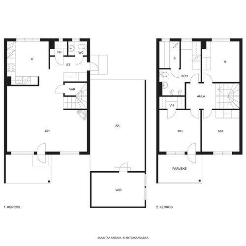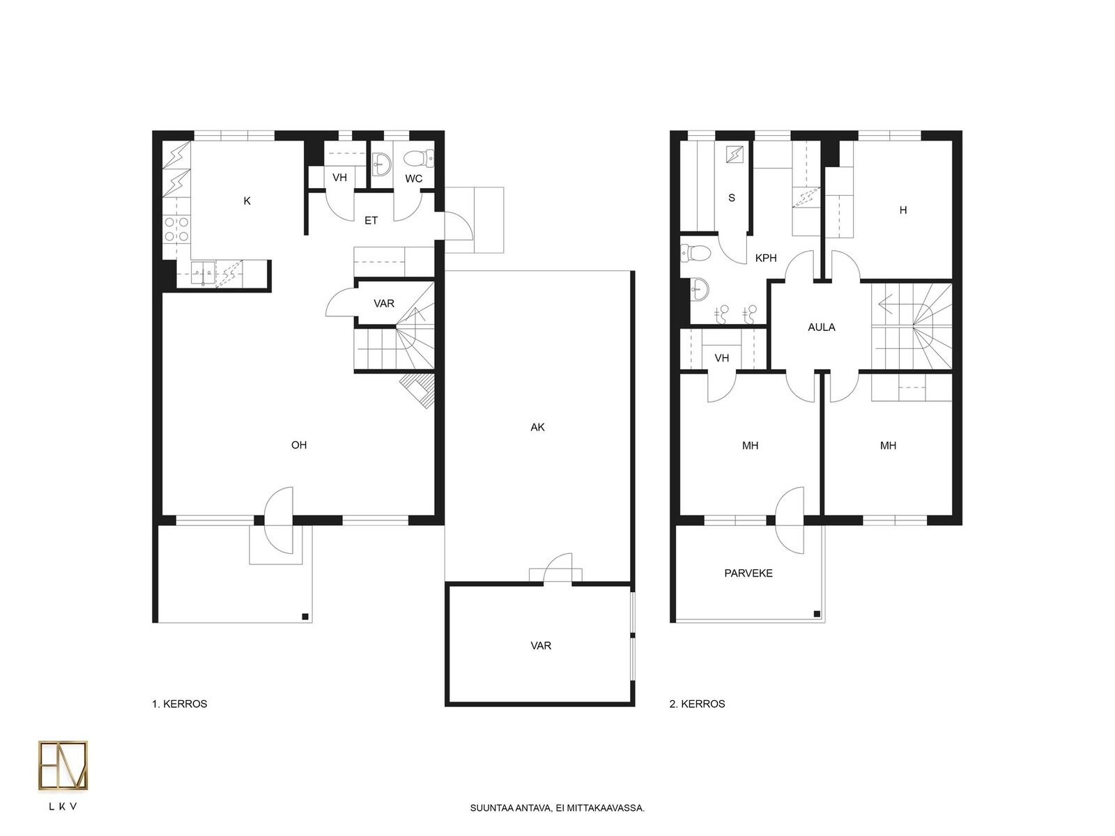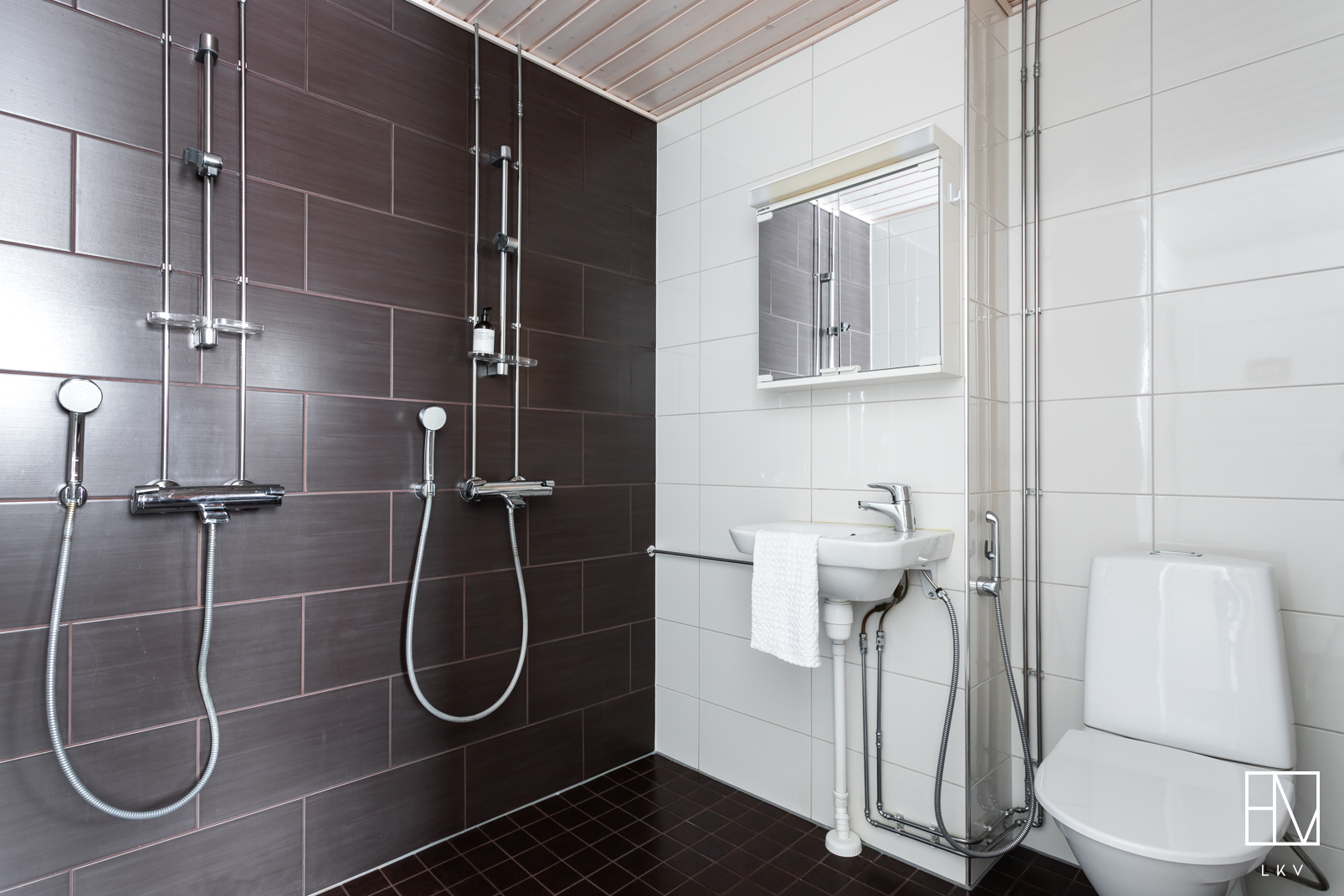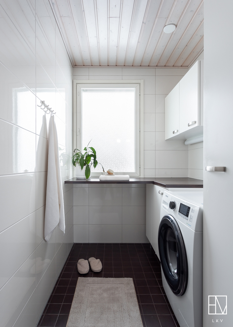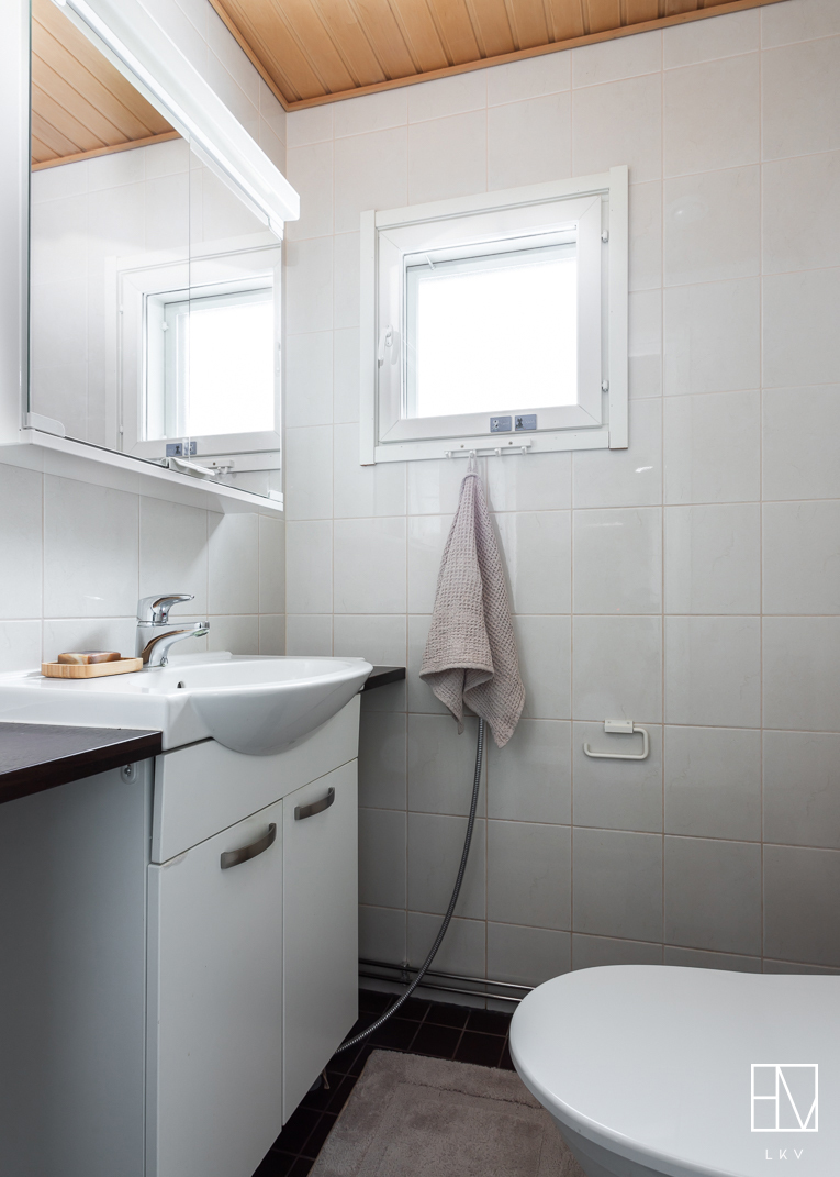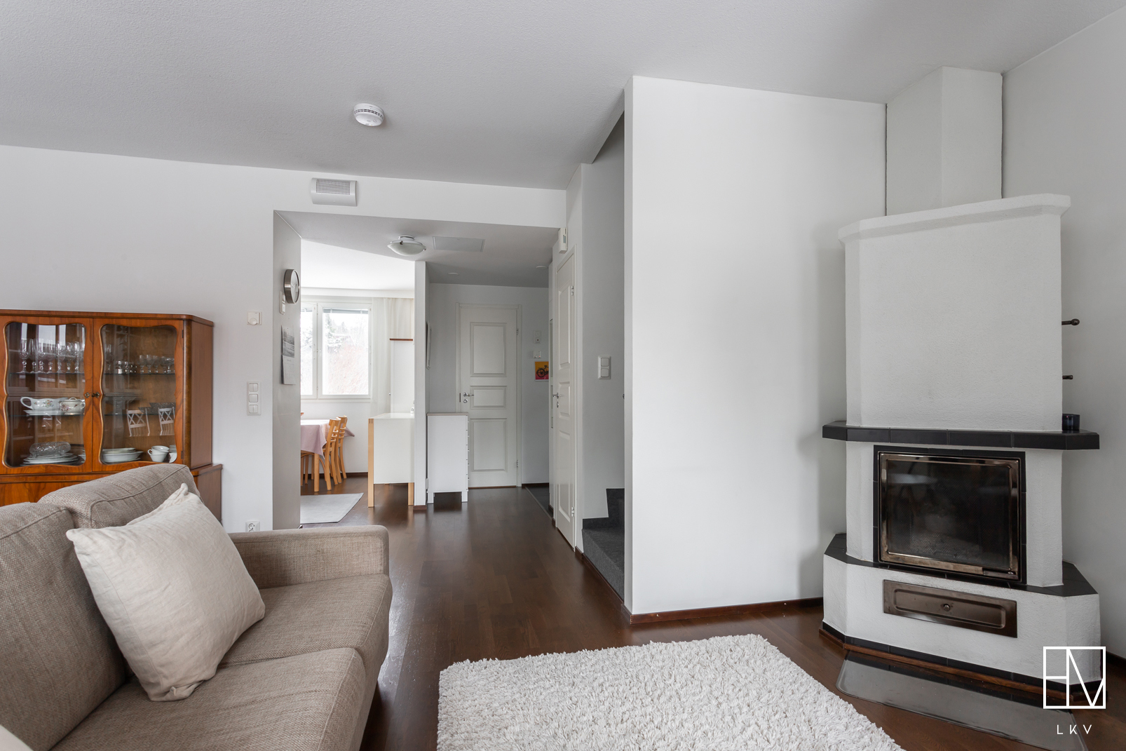 Alakerrassa avautuu todella tilava olohuone, jonka sydämenä on kaunis varaava takka tuomassa lämpöä ja tunnelmaa. Lisäksi alakerrassa on erillinen keittiö, johon mahtuu hyvin ruokailuryhmä. Säilytystilaa alhaalla on kaapistojen lisäksi vaatehuoneen, sekä portaiden alla sijaitsevan varaston muodossa.