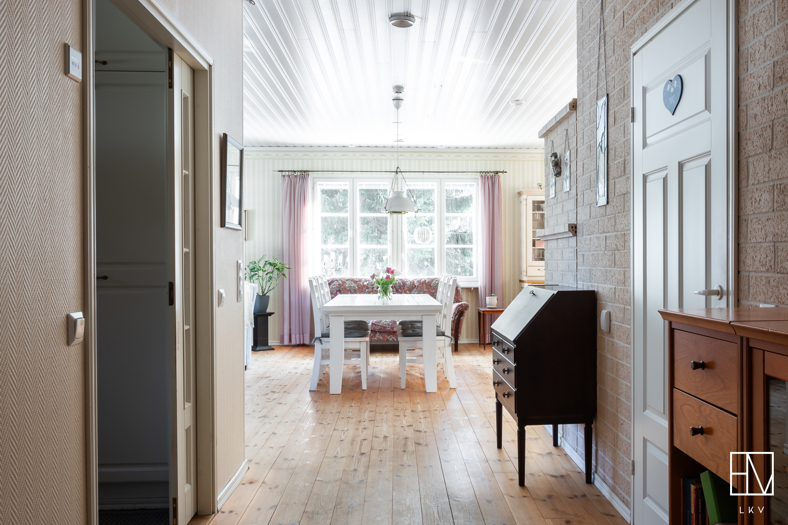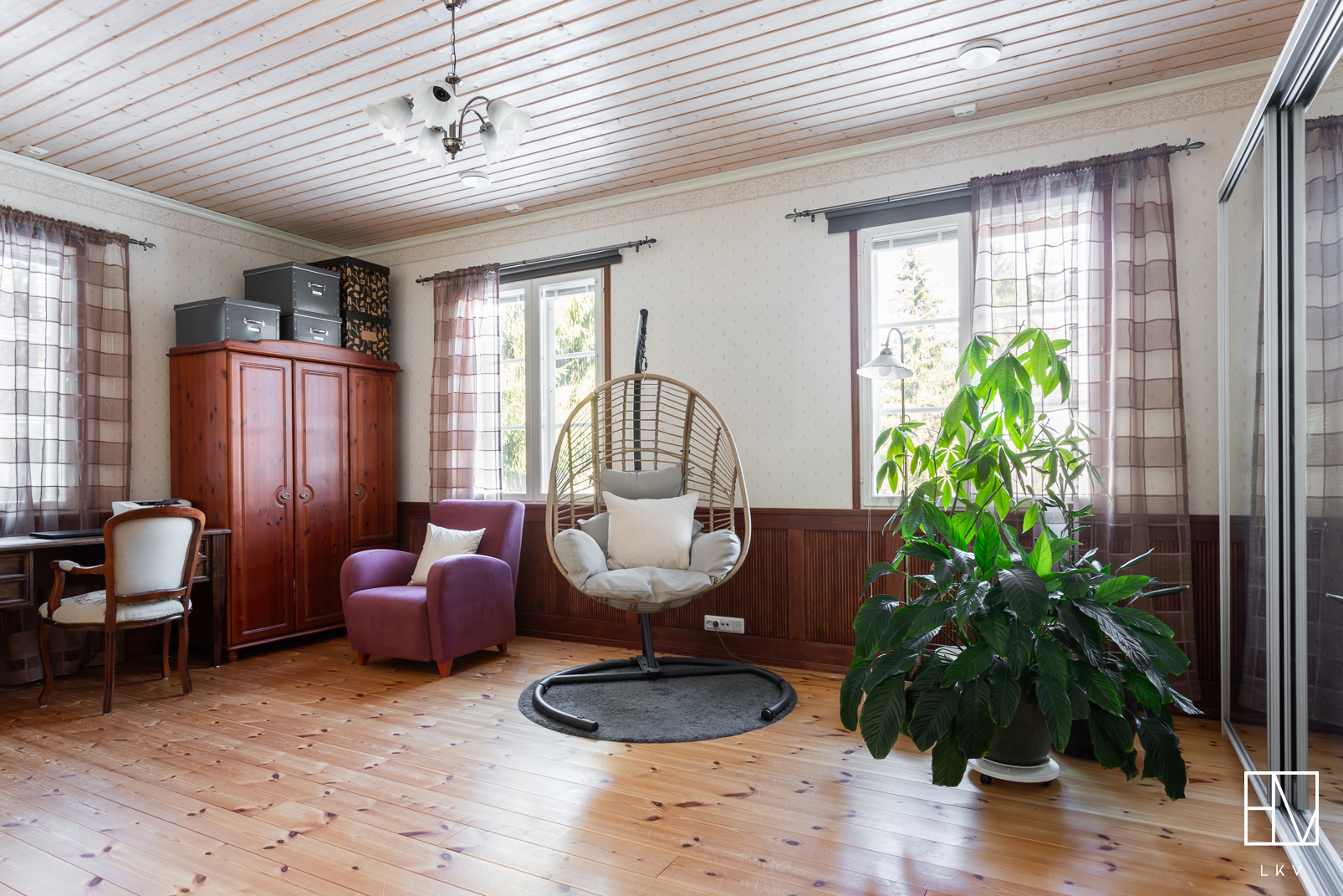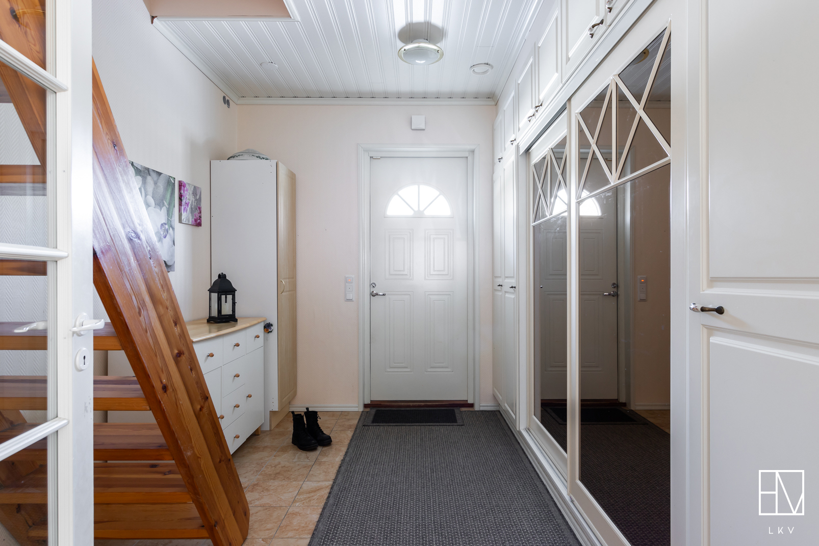 Heti sisään astuttaessa huomio kiinnittyy kodin näyttävään huonekorkeuteen ja avaraan tunnelmaan. Tilava eteinen tekee arjesta sujuvaa ja antaa heti laadukkaan ensivaikutelman. Kodin sisätilat ovat tyylikkäät ja huolella toteutetut, mikä luo viihtyisän ja harmonisen kokonaisuuden. Kaikki huoneet ovat tilavia ja yhden makuuhuoneista voisikin hyvin jakaa kahdeksi huoneeksi.