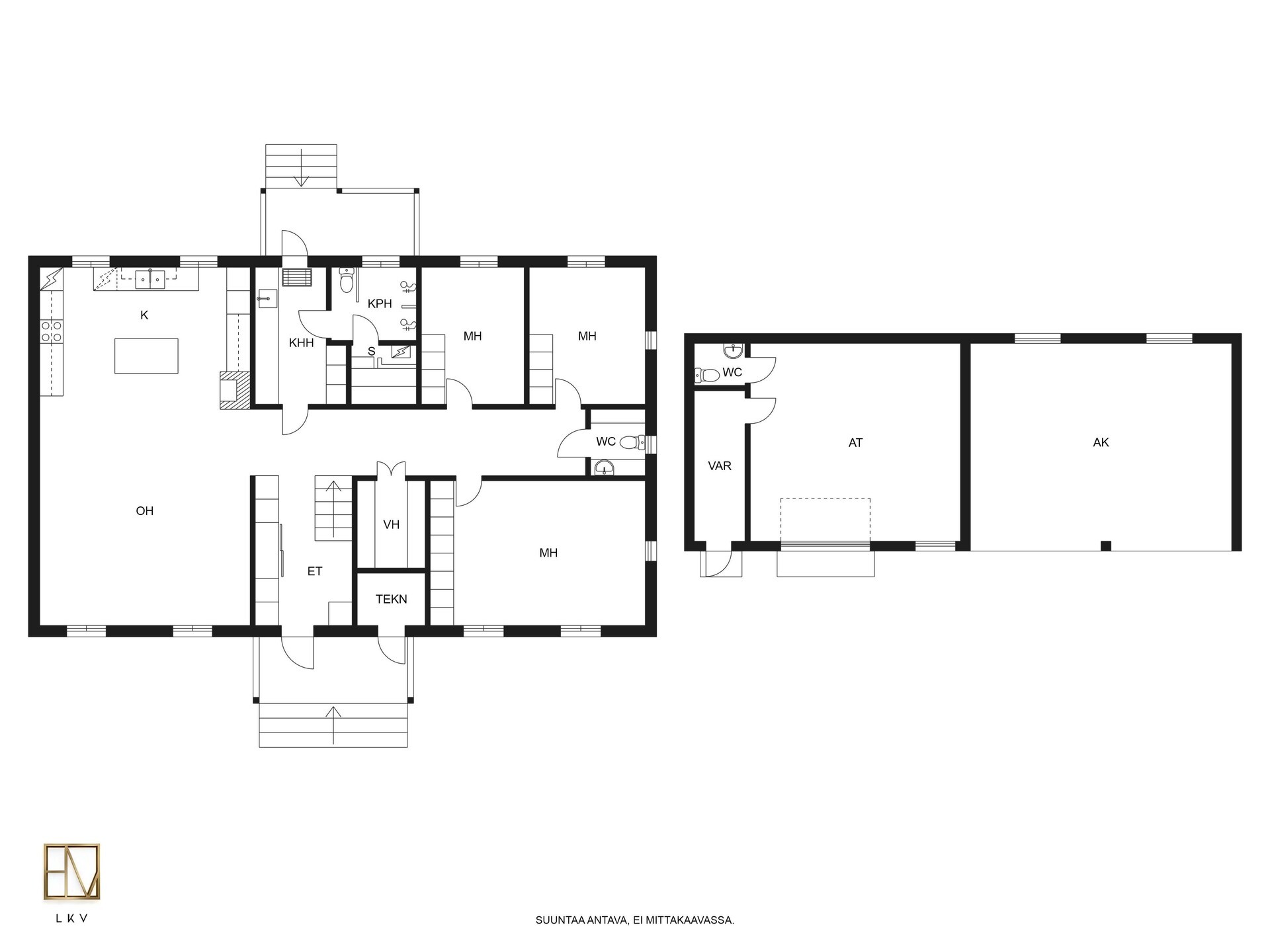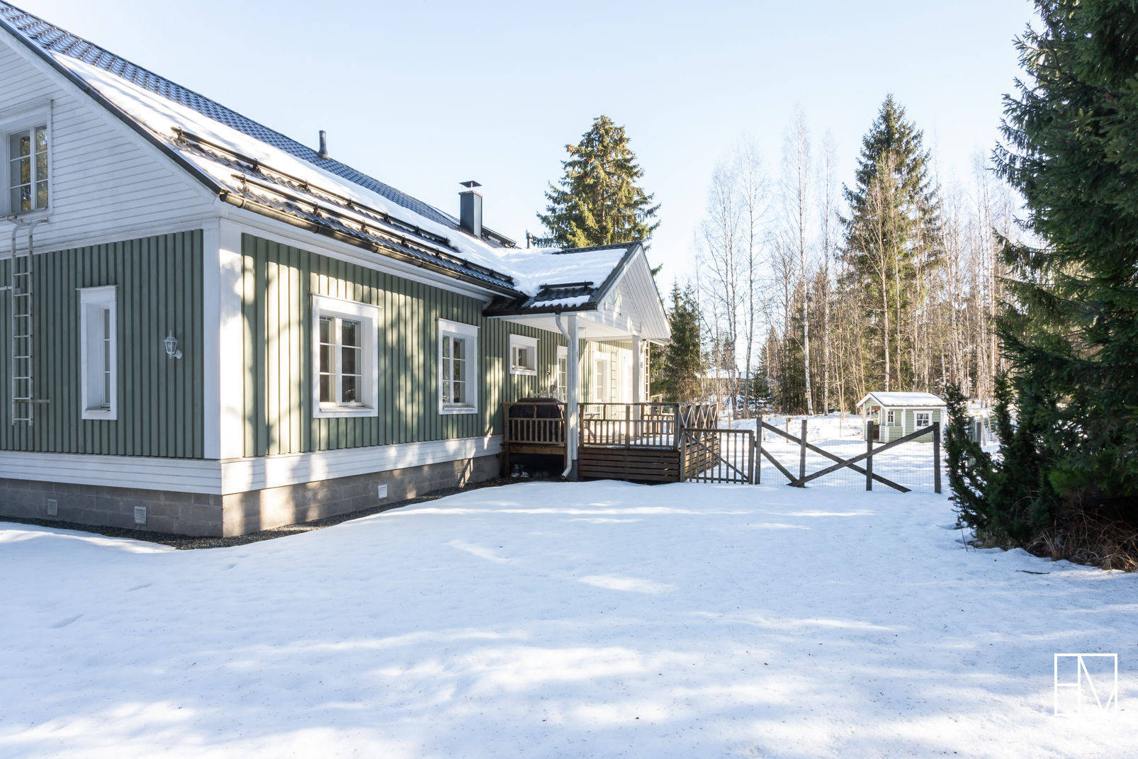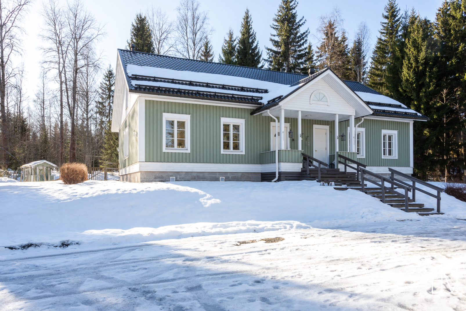 Varusteet: kiinteät valaisimet, ilmalämpöpumppu, matontamppausteline, jätesäiliö, istutukset