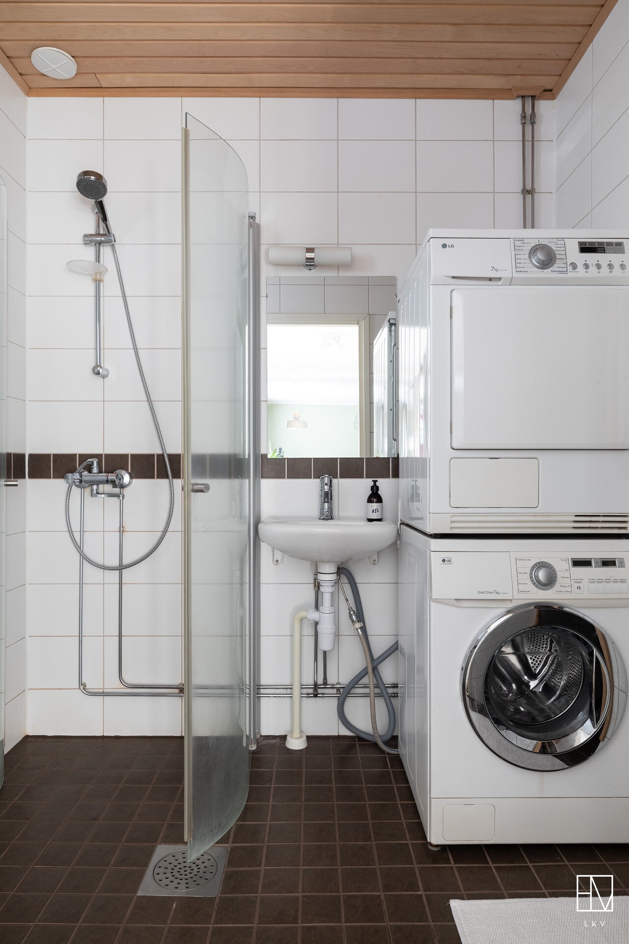 Varusteet: suihkuseinä, pesukoneliitäntä, lattialämmitys, suihku, peili, kiinteät valaisimet
