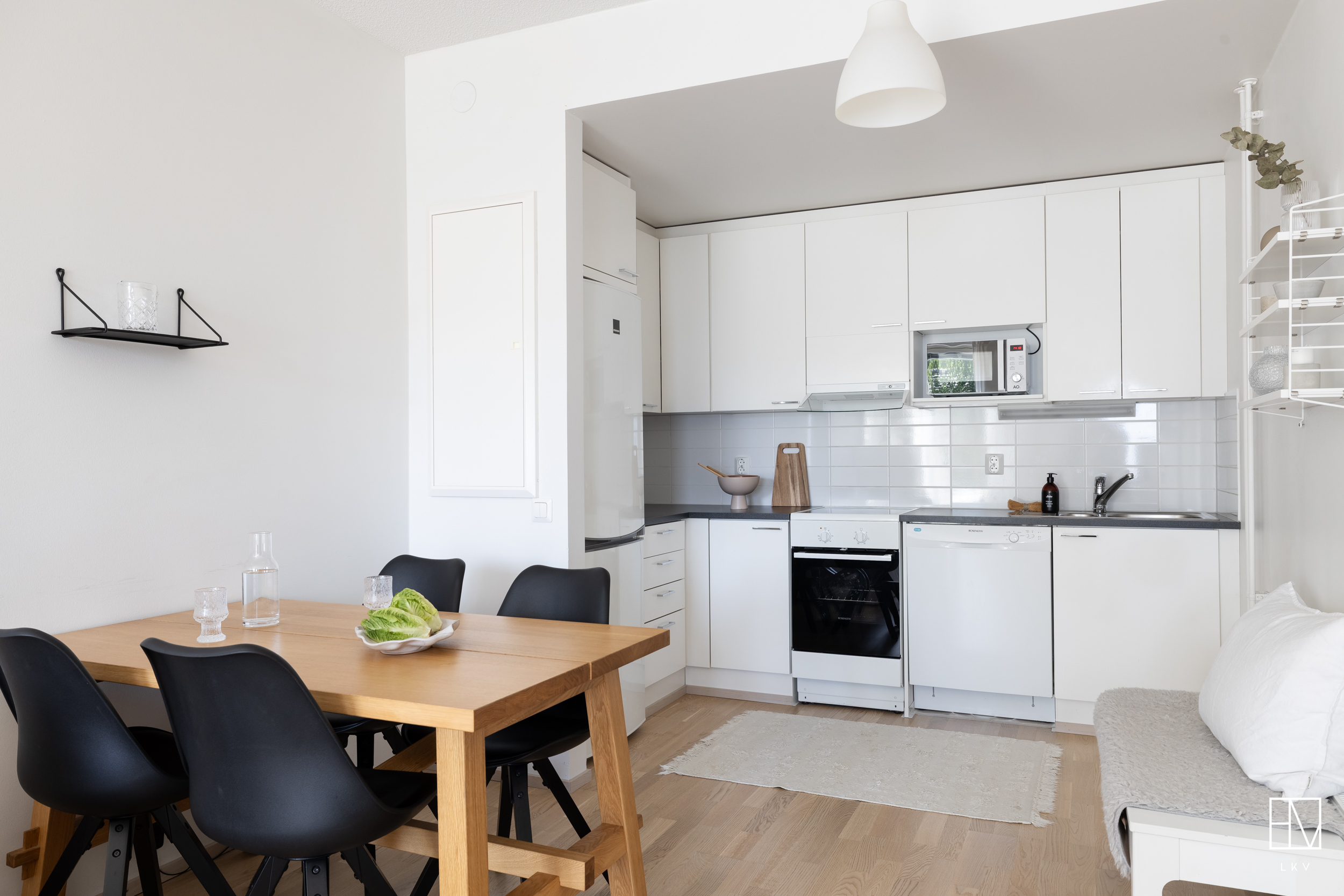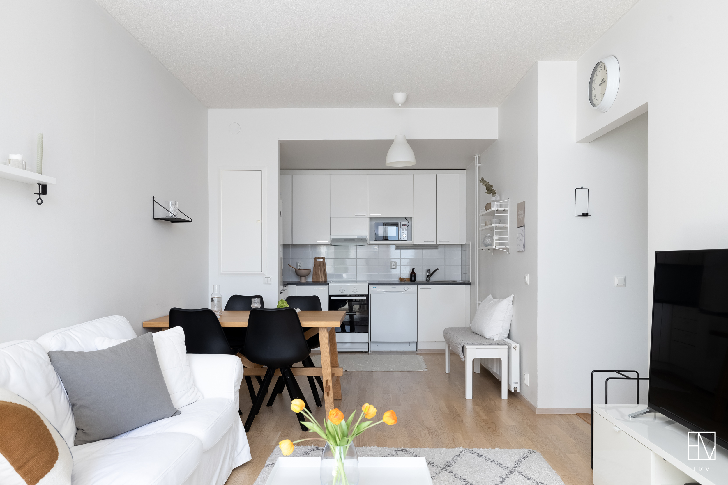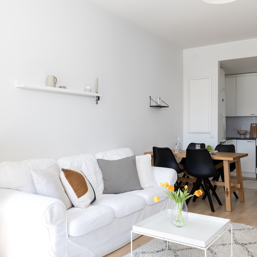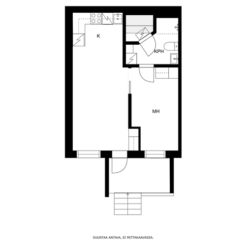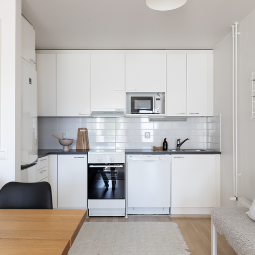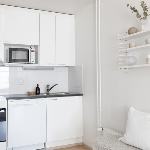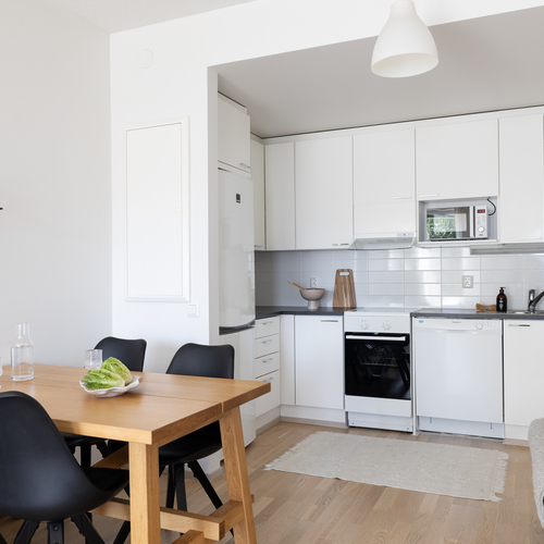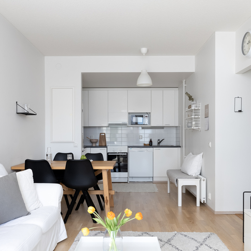 Tämän kodin pohjaratkaisu on toteutettu todella hyvin ja ilman turhia hukkaneliöitä. Keittiö ja olohuone luovat nykyaikaisesti yhtenäisen tilan. Keittiössä on hyvin kaappi- ja laskutilaa sekä paikka ruokapöydälle. Makuuhuone on varsin hyvän kokoinen ja sinne saa tarvittaessa mahtumaan työpisteen. Kylpyhuoneessa on paikka pesutornille ja oma sauna tarjoaa sitä kuuluisaa arjen luksusta.