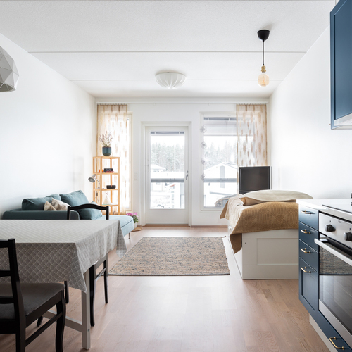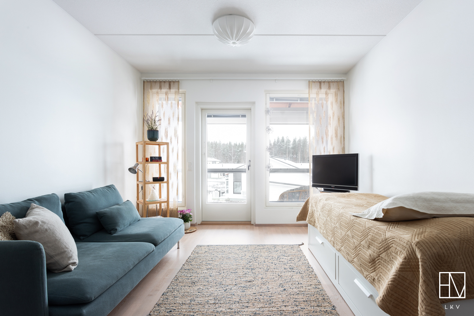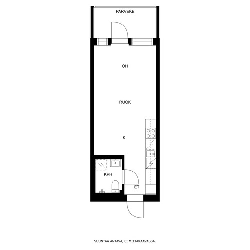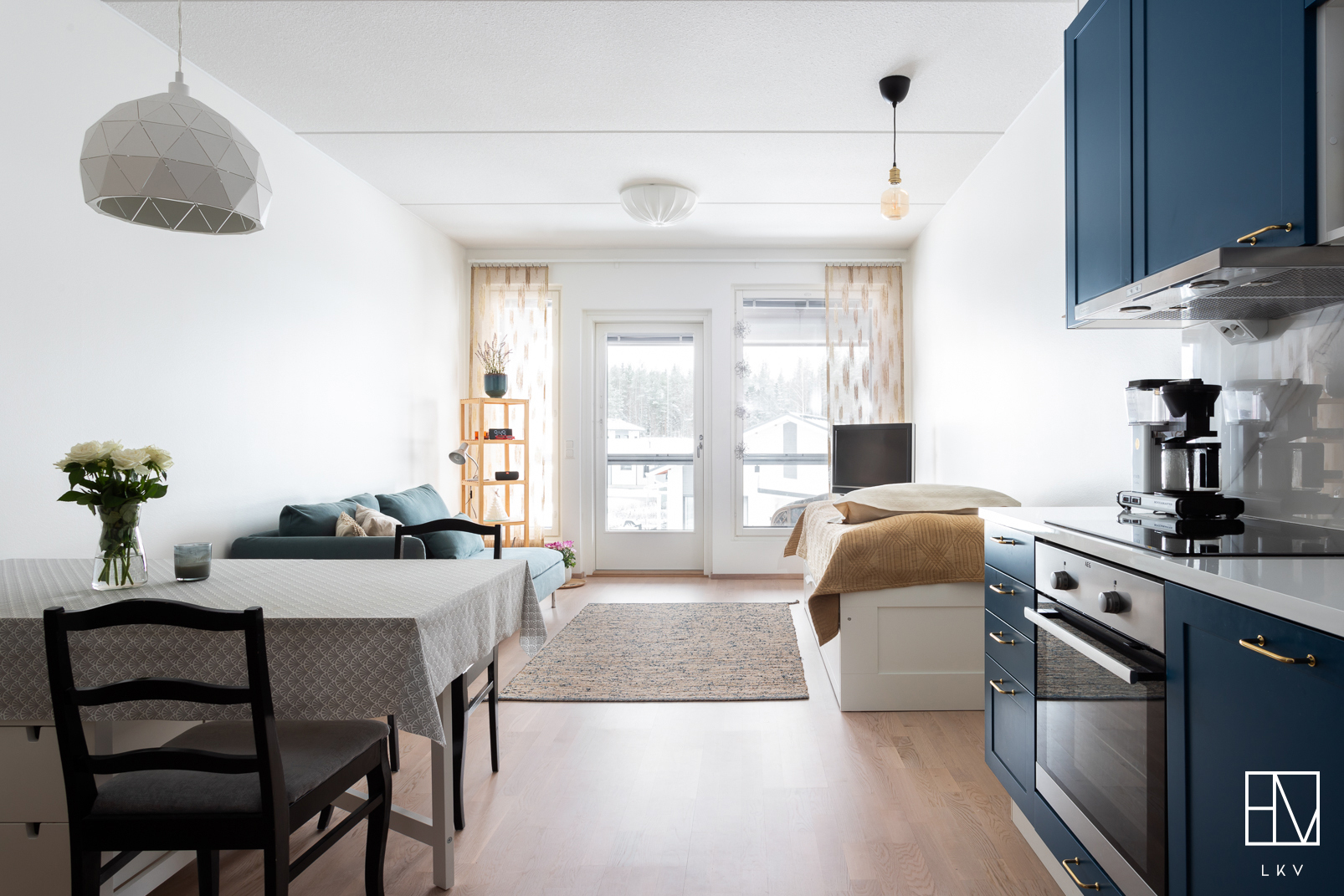 Eteisessä on käytännölliset kaapistot ja eteisen lattia on laattaa. Keittiössä on tarvittavat kodinkoneet ja mukavasti kaappitilaa. Avara tila on mahdollista kalustaa monin eri tavoin. Huoneen perältä on käynti koko asunnon levyiselle lasitetulle parvekkeelle.