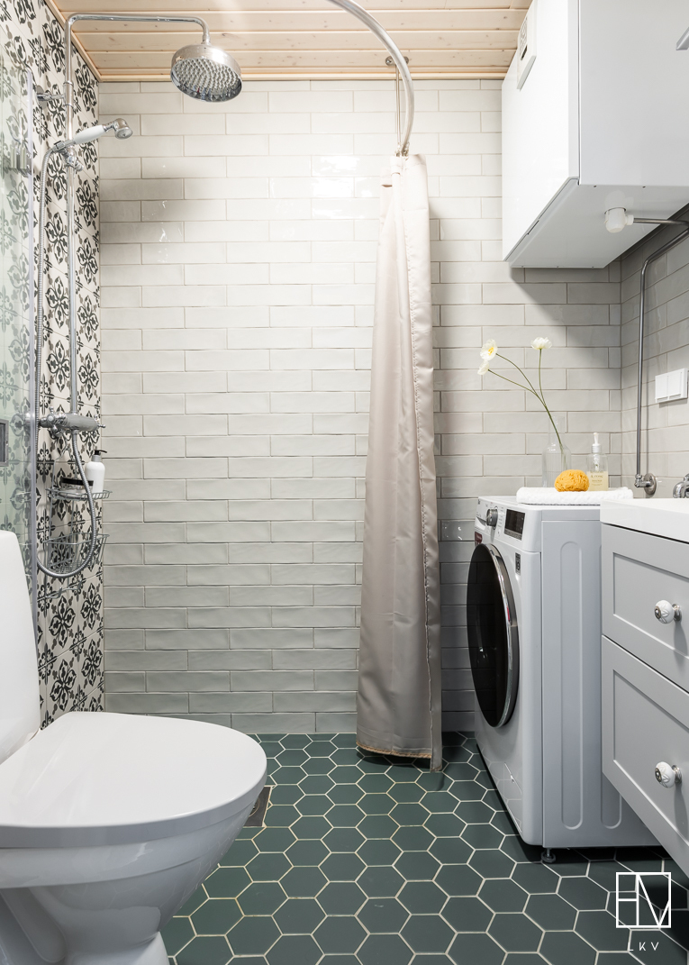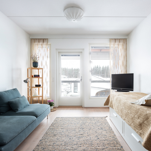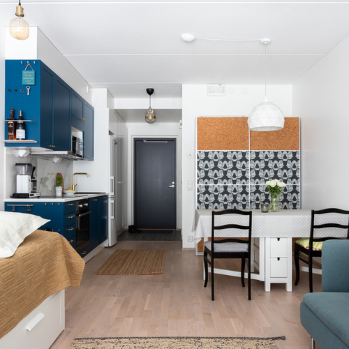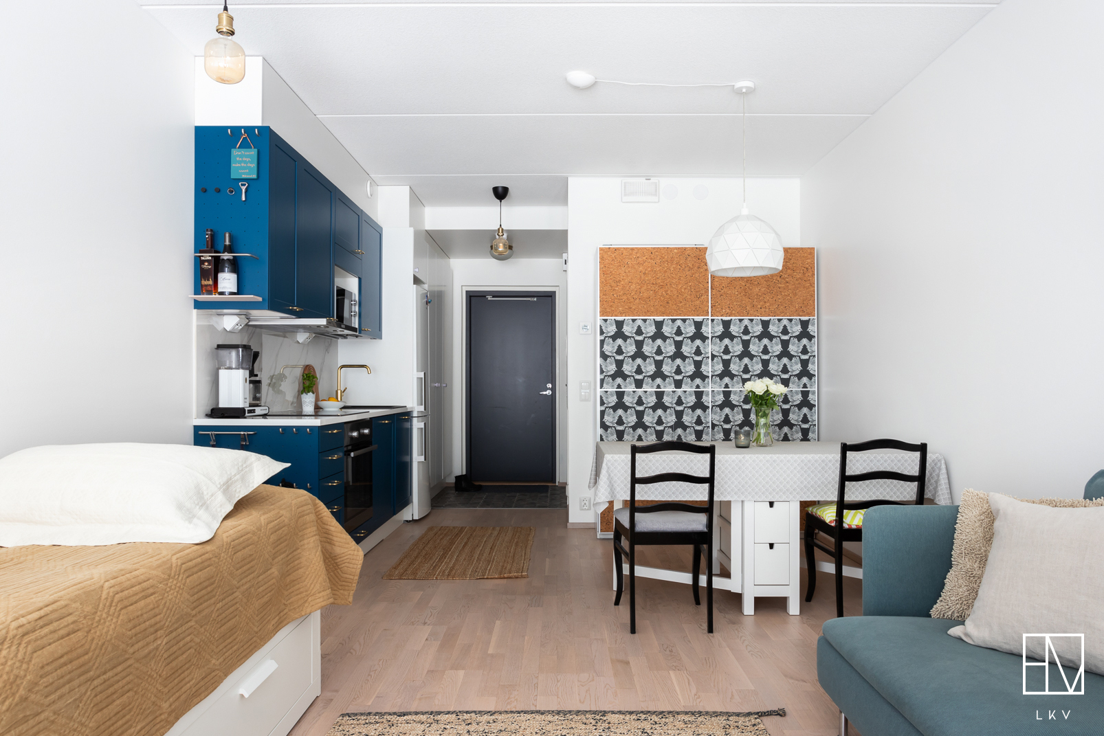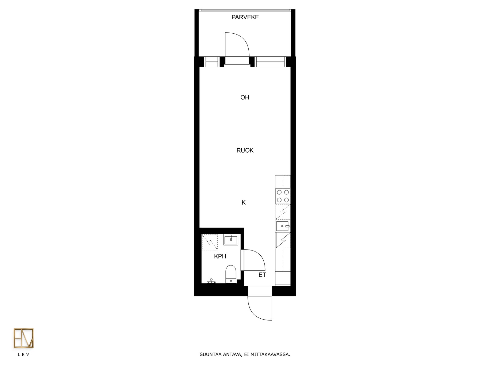 Eteisessä on käytännölliset kaapistot ja eteisen lattia on laattaa. Keittiössä on tarvittavat kodinkoneet ja mukavasti kaappitilaa. Avara tila on mahdollista kalustaa monin eri tavoin. Huoneen perältä on käynti koko asunnon levyiselle lasitetulle parvekkeelle.