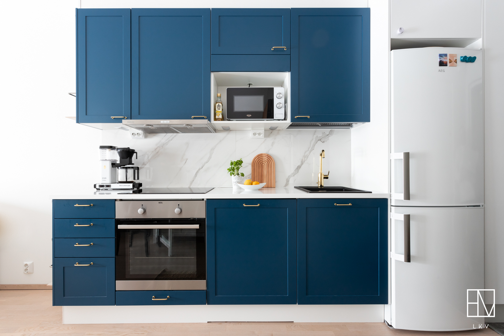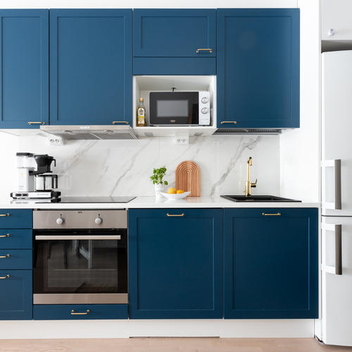 Erillisuuni, induktioliesi, liesituuletin, integroitu astianpesukone, jääkaappipakastin ja paikka mikrolle.