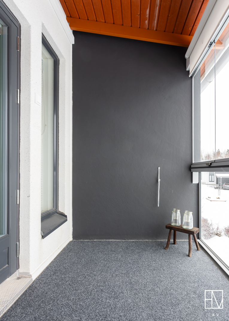 Pintamateriaalit: Asuintilassa valkolakattu tammiparketti. Eteisessä laattalattia.