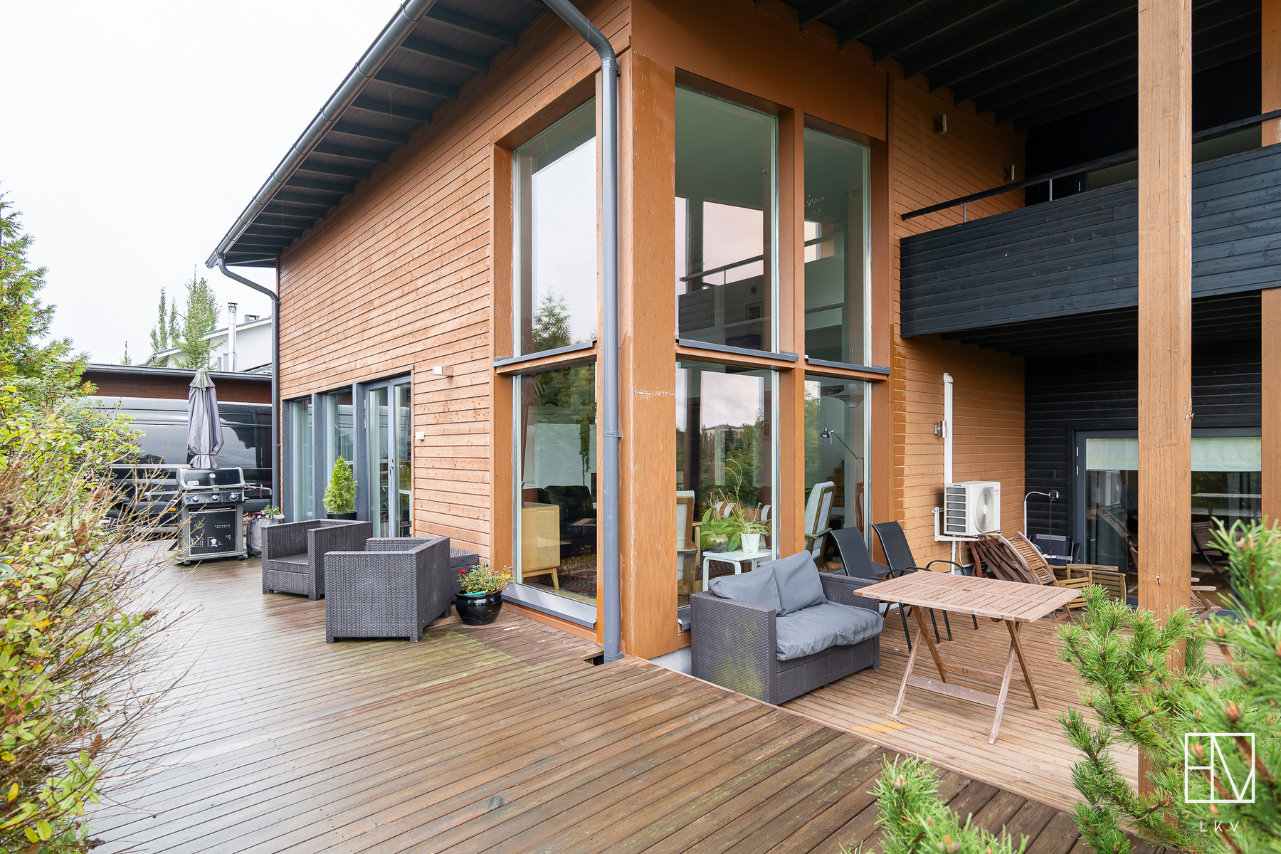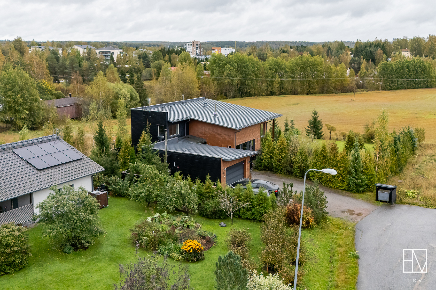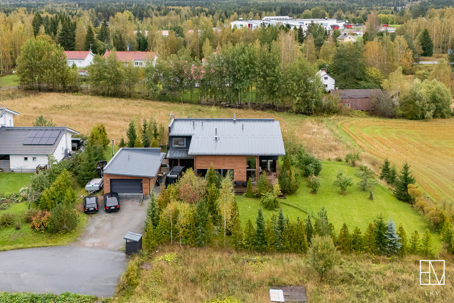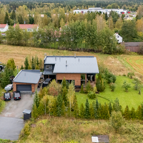 60 m²:n suuruinen autotalli-varastoyhdistelmä tarjoaa reilusti tilaa niin autoille kuin harrastuksille. Pihapiiri on tilava ja suojaisa – terasseilta löytyy myös palju rentoutumishetkiin.