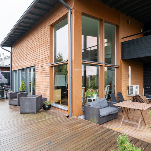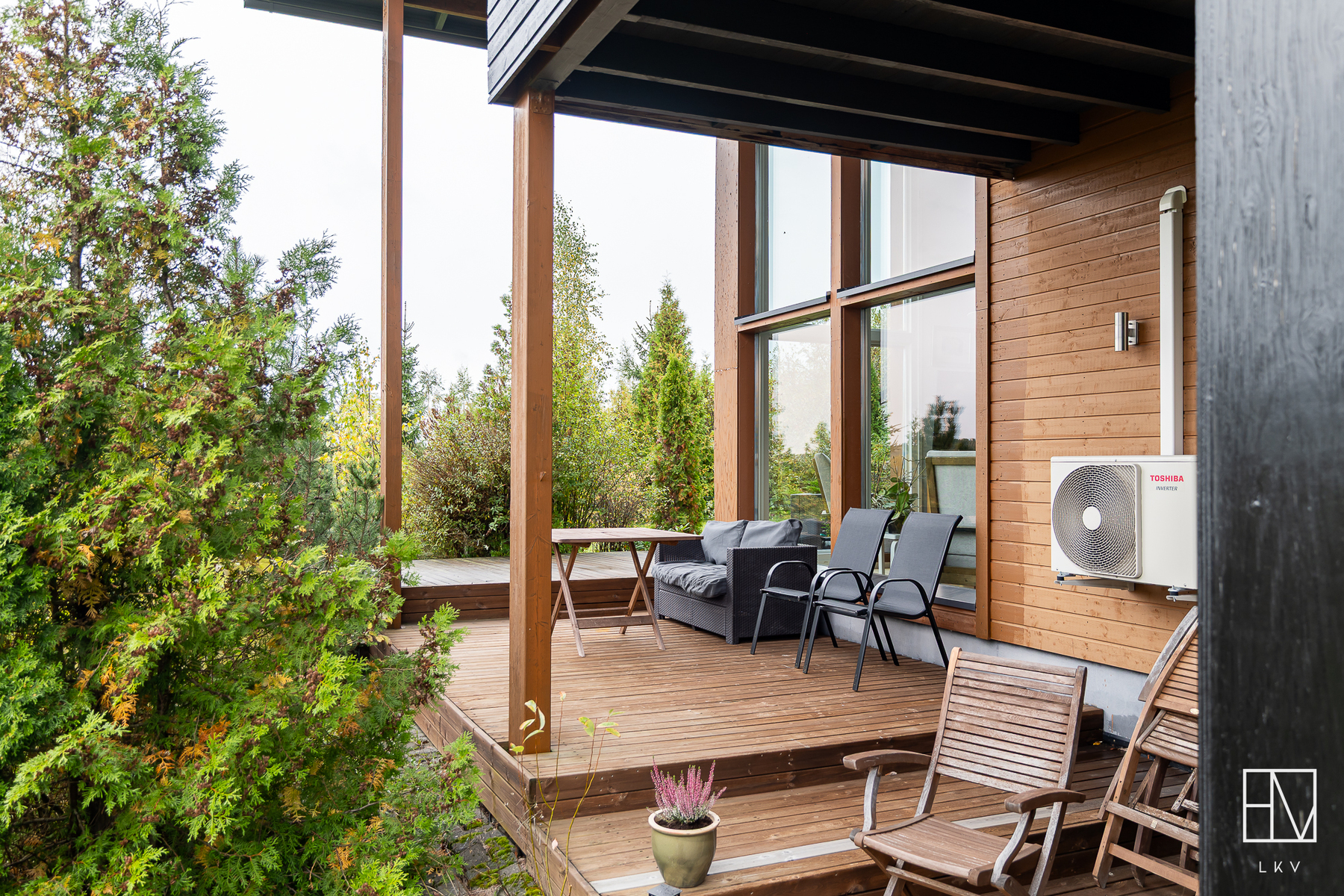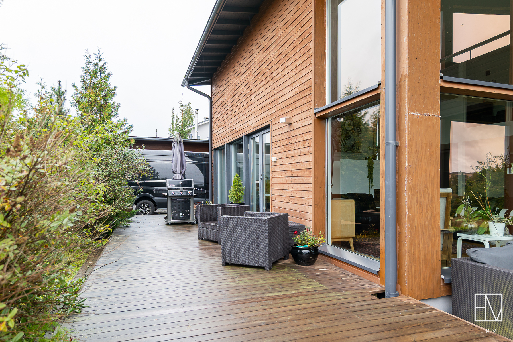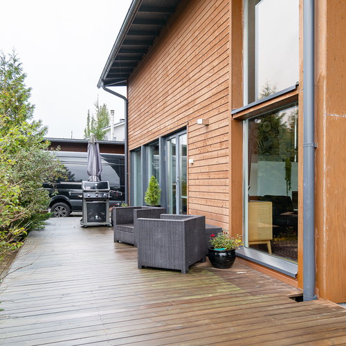 60 m²:n suuruinen autotalli-varastoyhdistelmä tarjoaa reilusti tilaa niin autoille kuin harrastuksille. Pihapiiri on tilava ja suojaisa – terasseilta löytyy myös palju rentoutumishetkiin.
