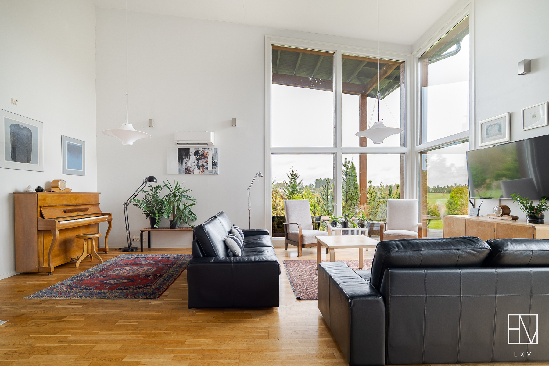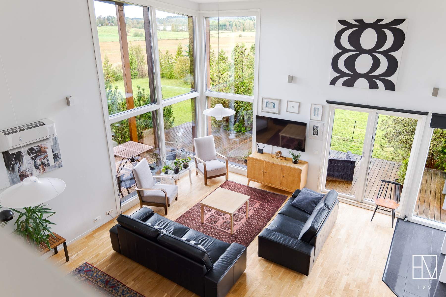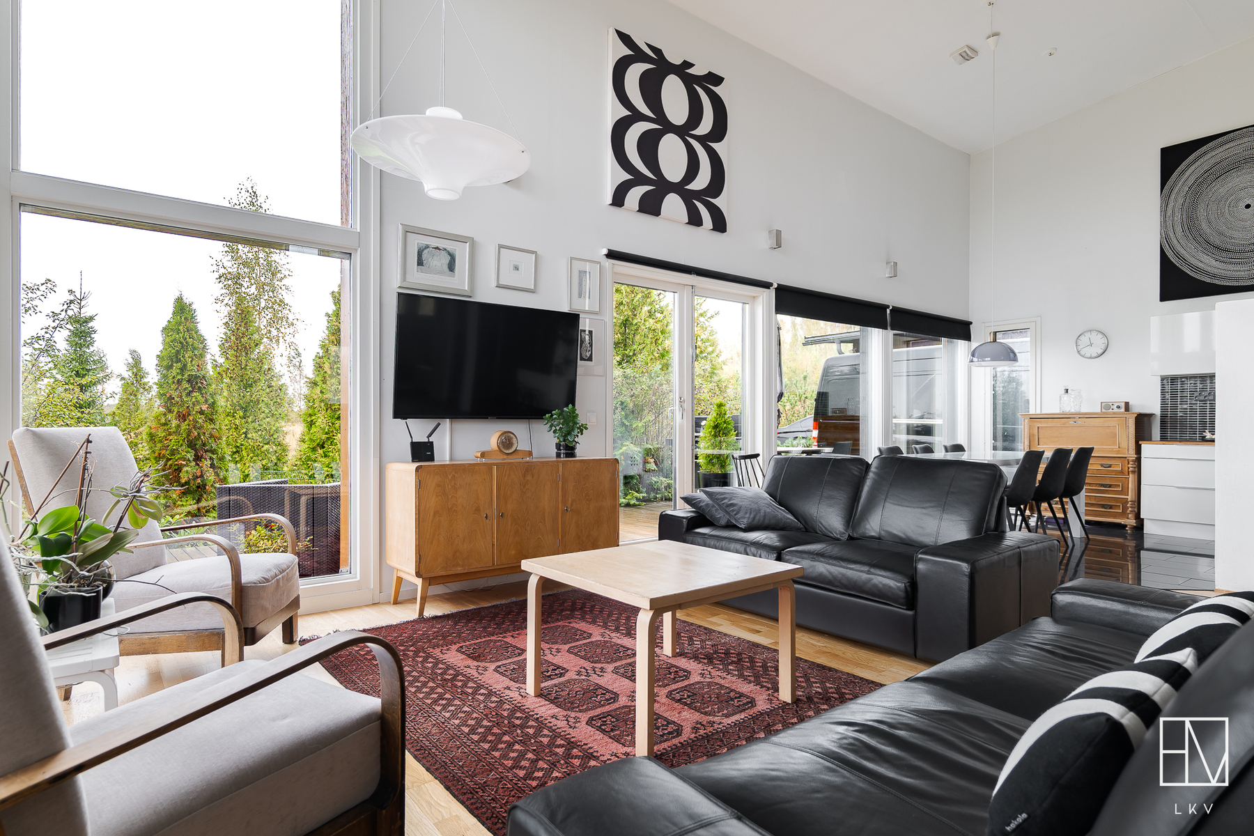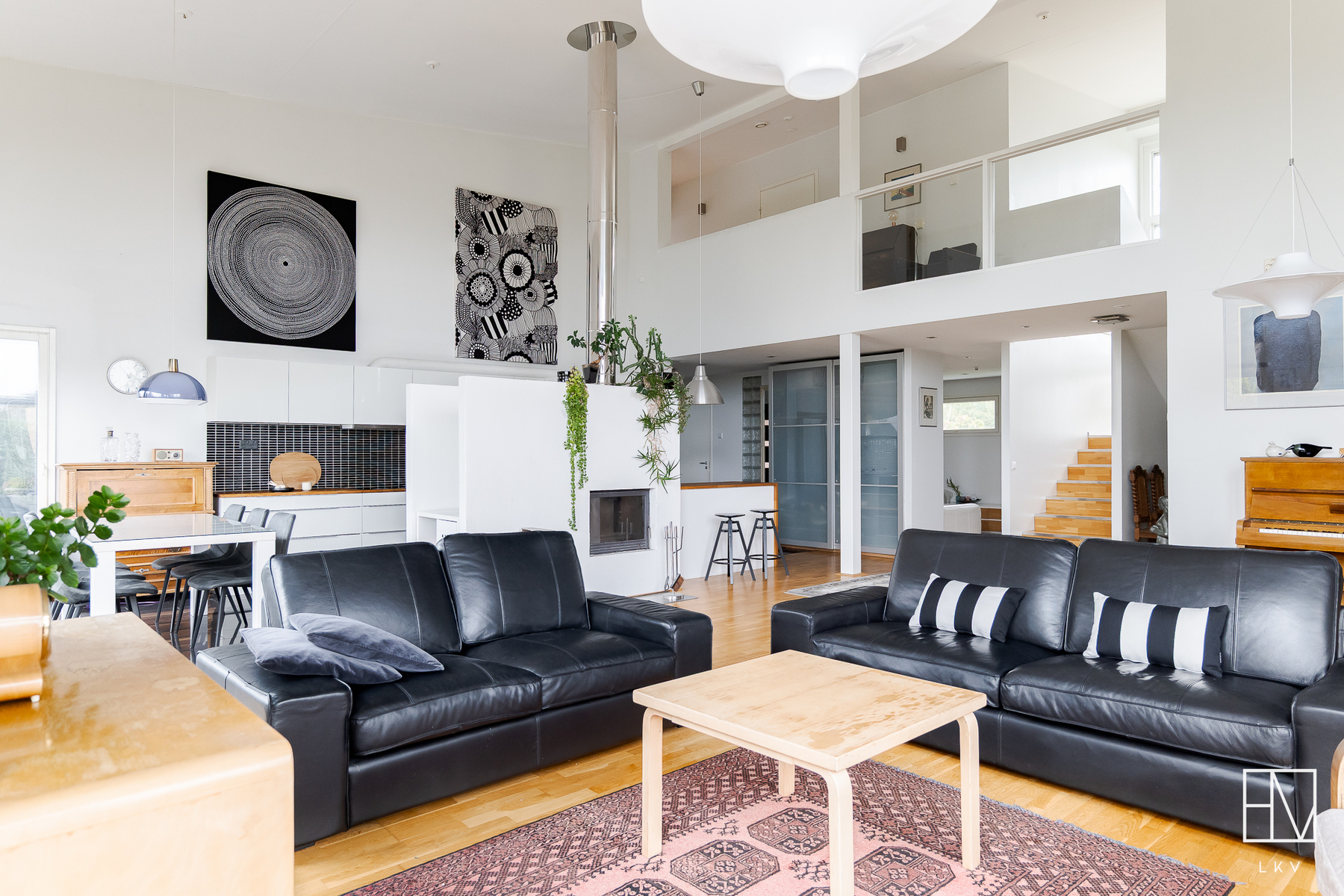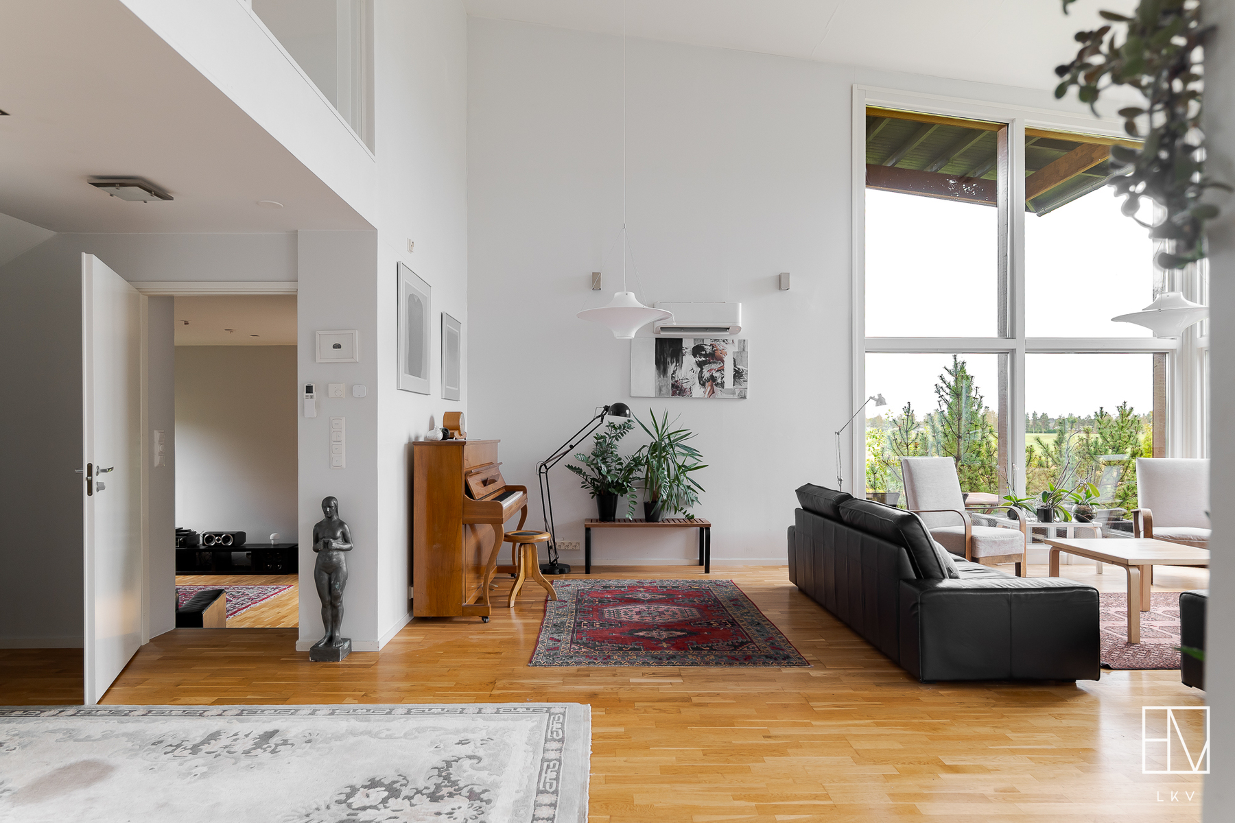 Kodissa korostuu avaruus ja valo. Olohuone ja keittiö muodostavat yhtenäisen, erittäin korkean tilan, jota suuret ikkunat tulvivat luonnonvalolla. Maisemat avautuvat pelloille ja järven pilkahdus täydentää idyllin.