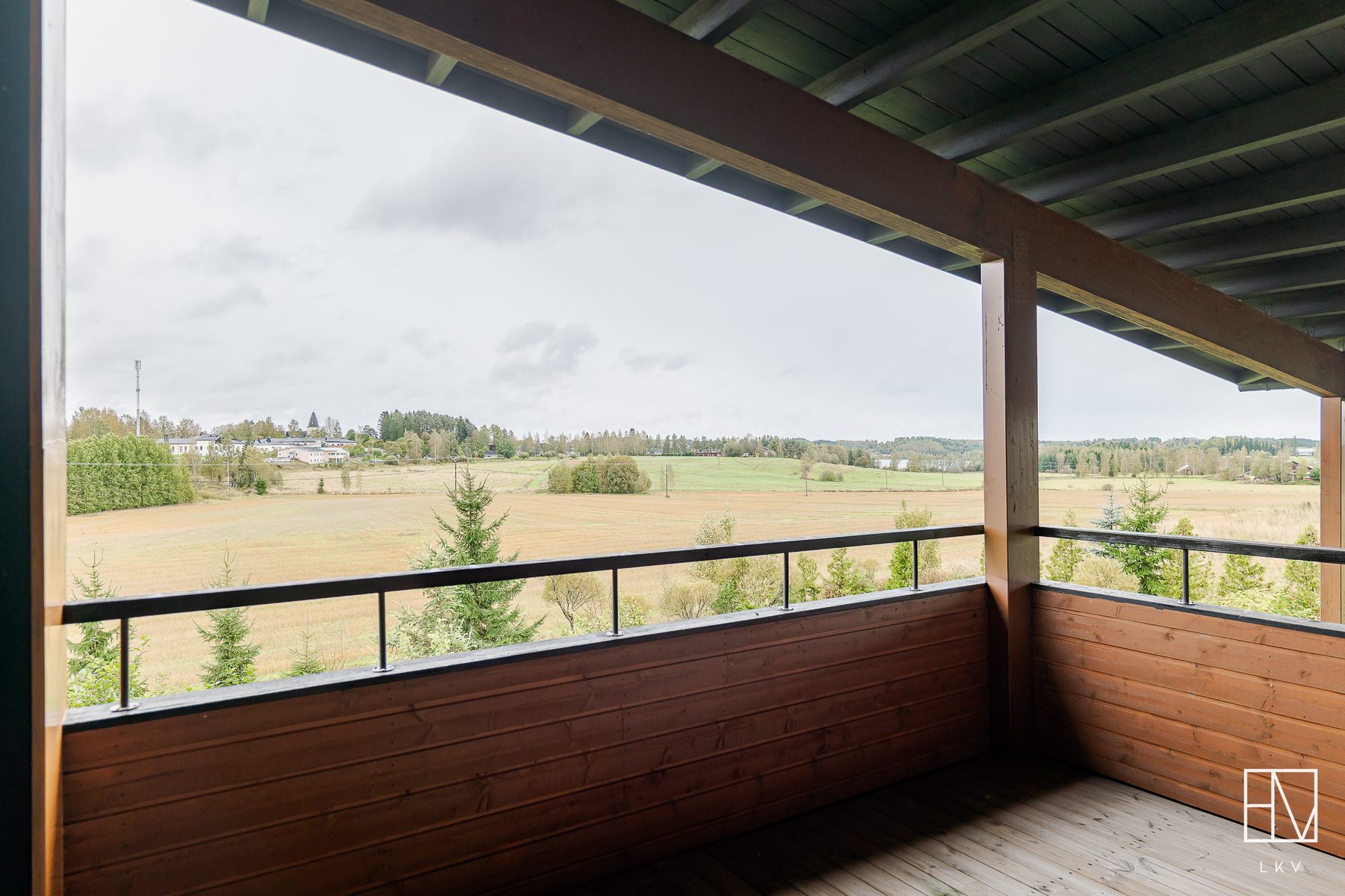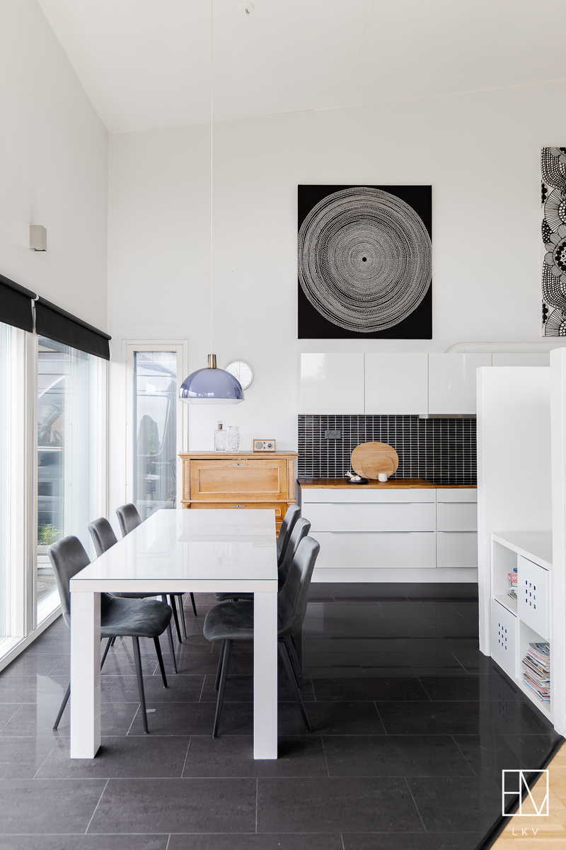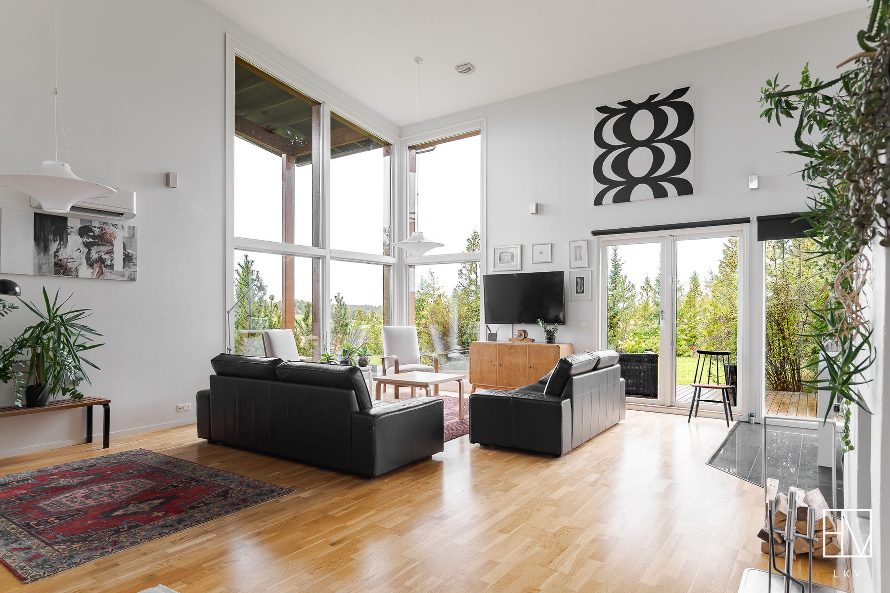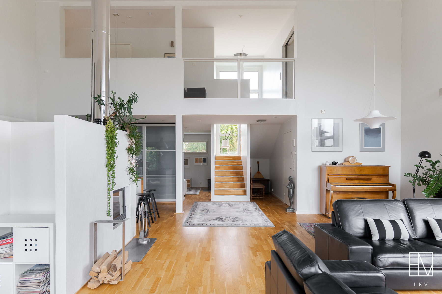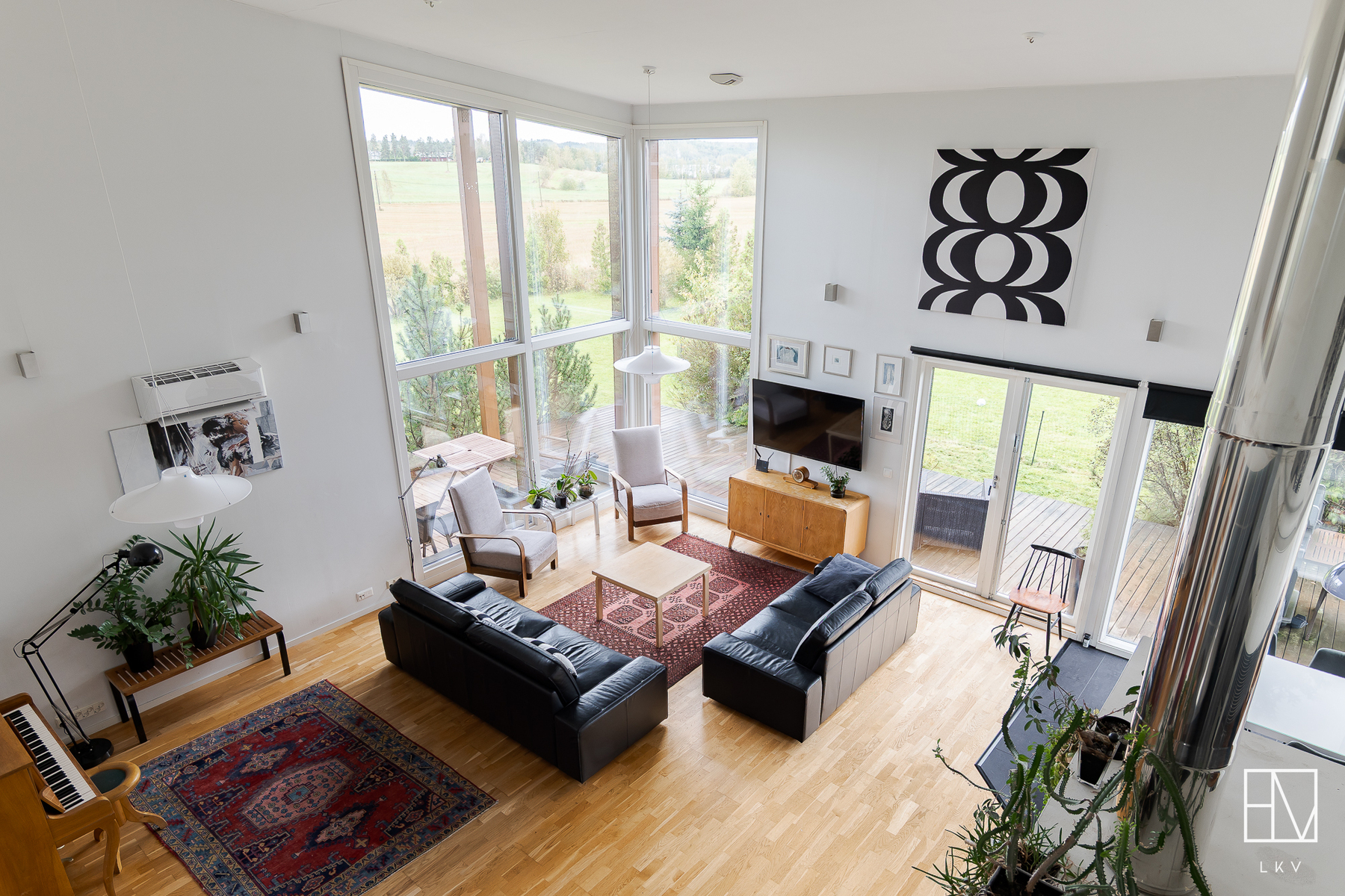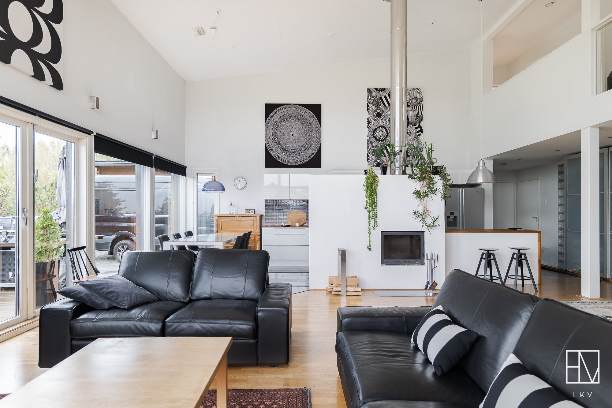 Kodissa korostuu avaruus ja valo. Olohuone ja keittiö muodostavat yhtenäisen, erittäin korkean tilan, jota suuret ikkunat tulvivat luonnonvalolla. Maisemat avautuvat pelloille ja järven pilkahdus täydentää idyllin.