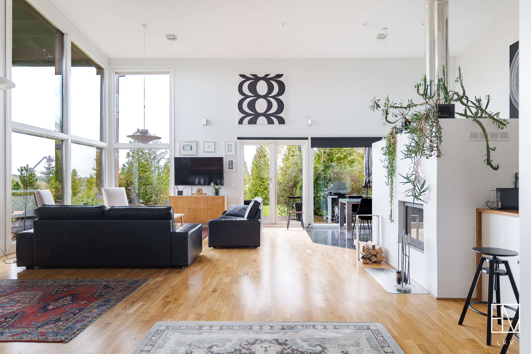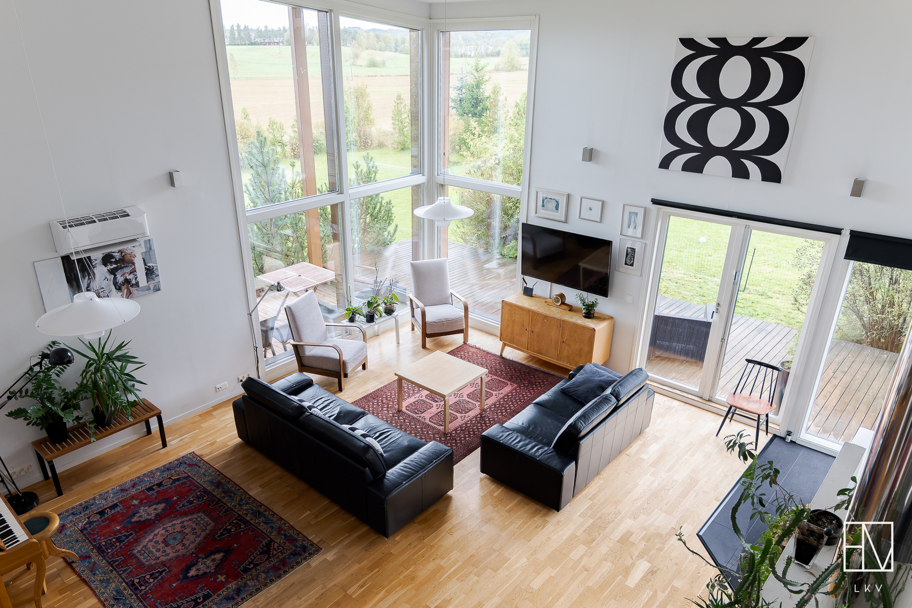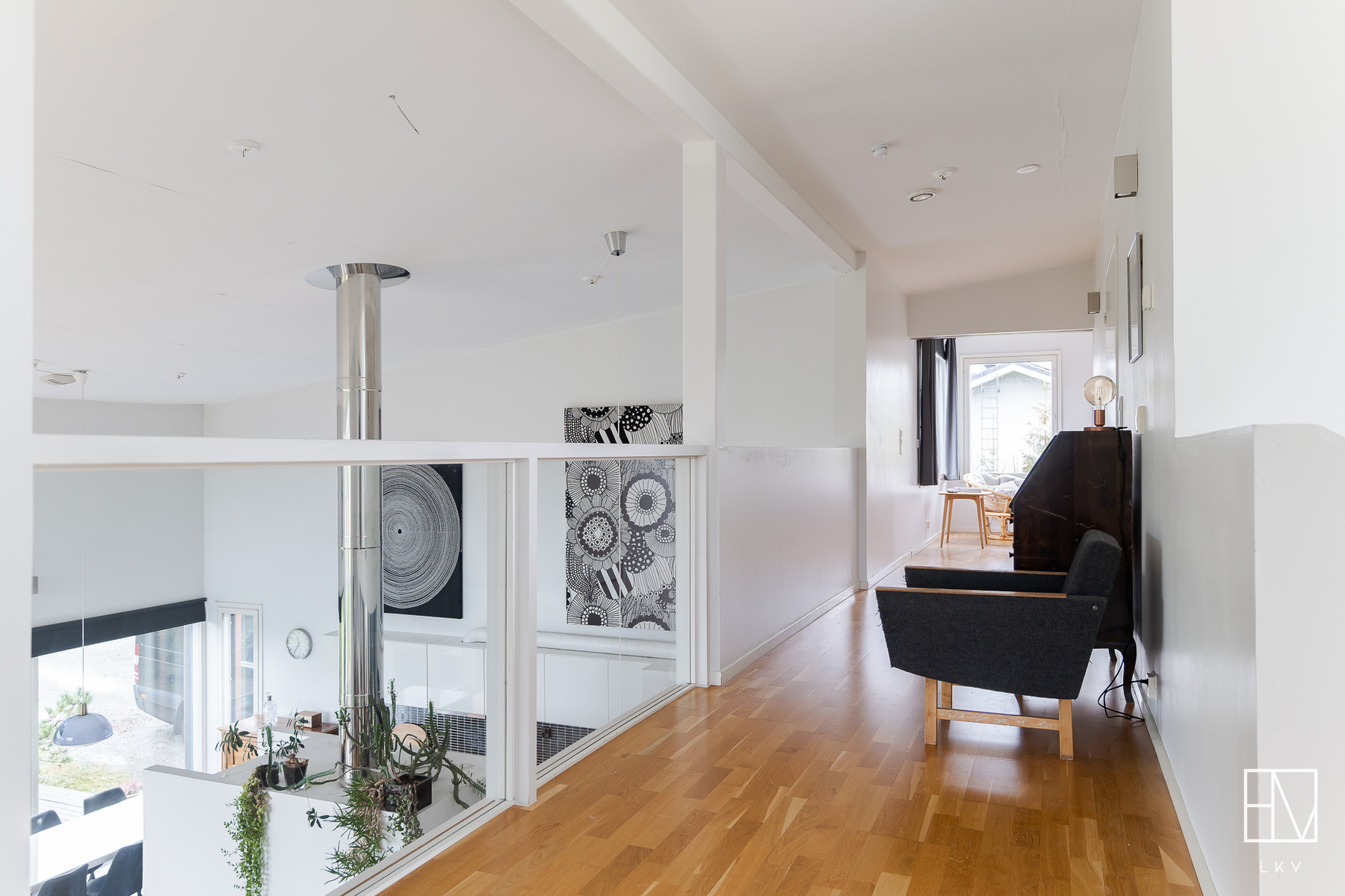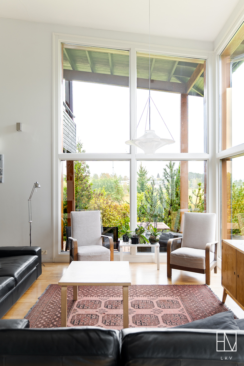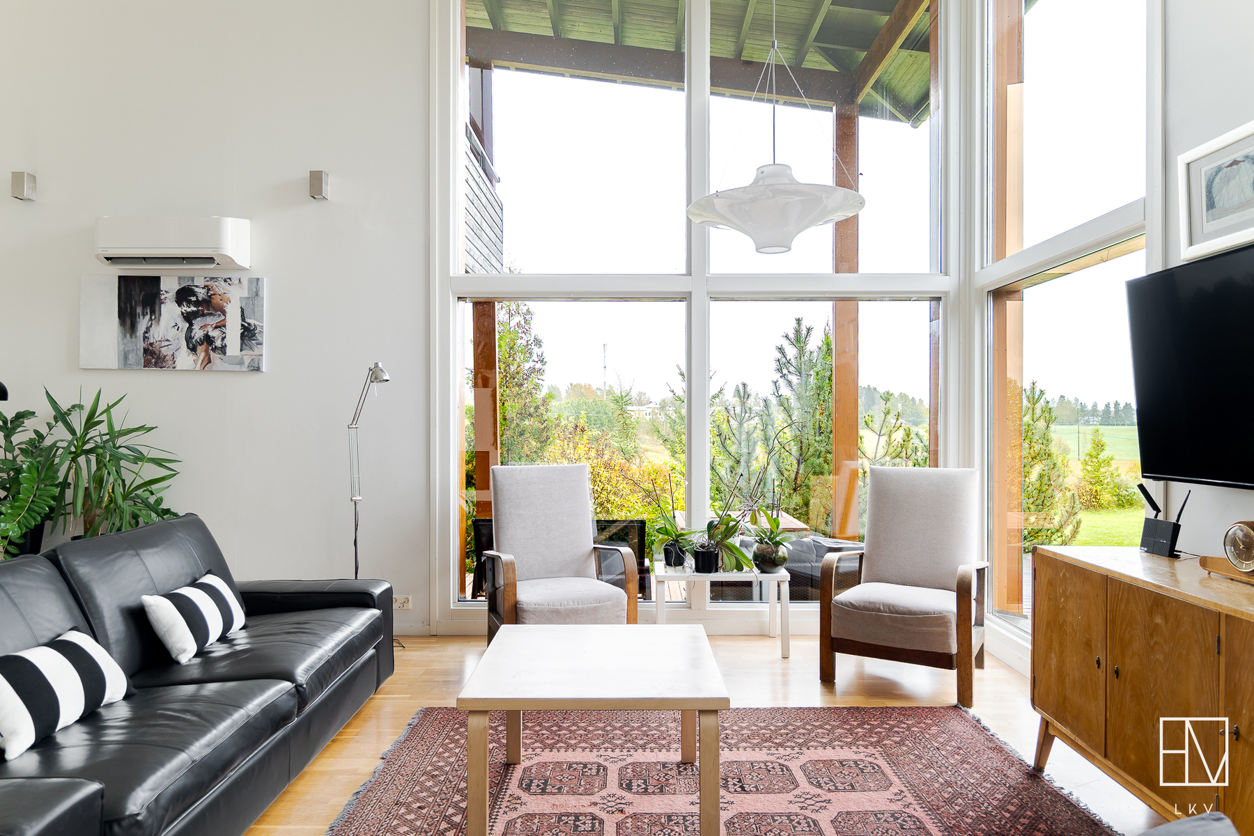 Kodissa korostuu avaruus ja valo. Olohuone ja keittiö muodostavat yhtenäisen, erittäin korkean tilan, jota suuret ikkunat tulvivat luonnonvalolla. Maisemat avautuvat pelloille ja järven pilkahdus täydentää idyllin.