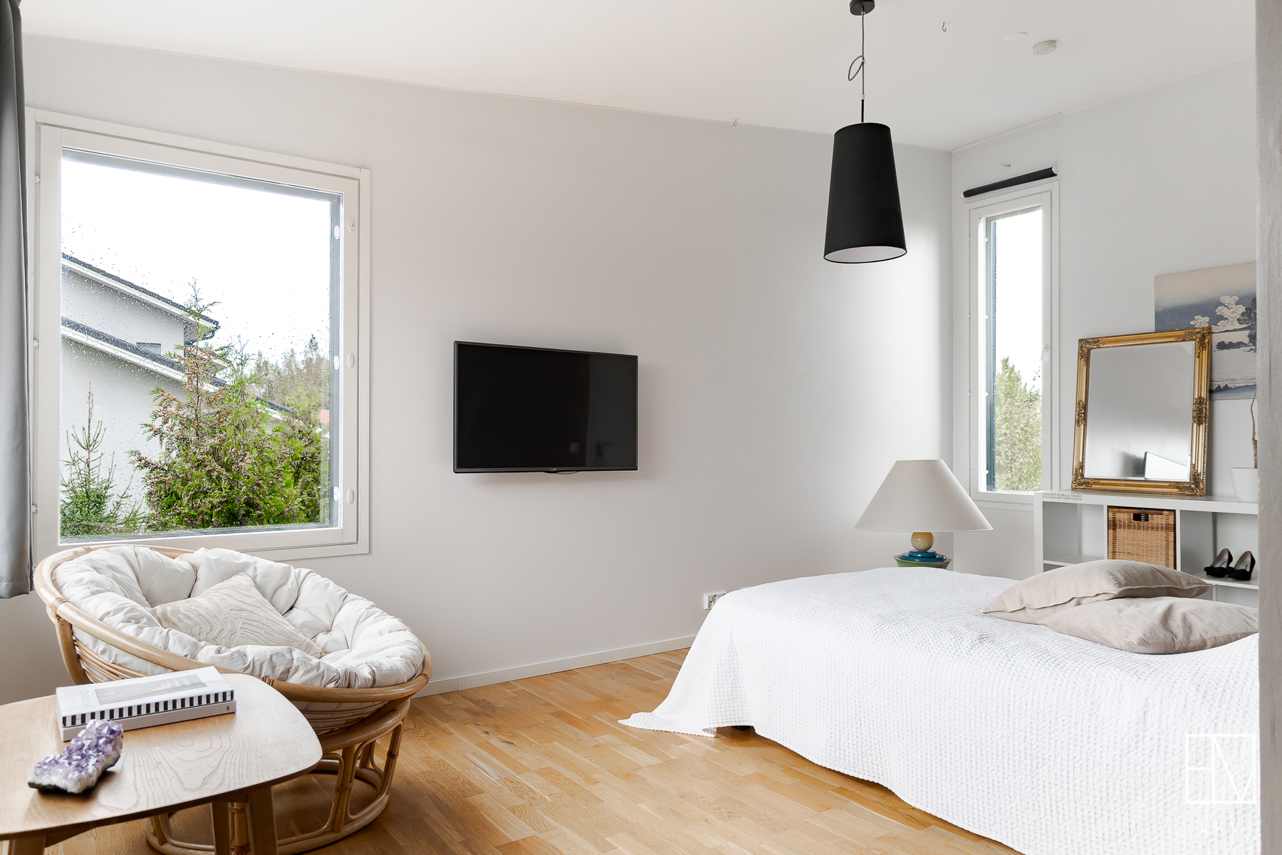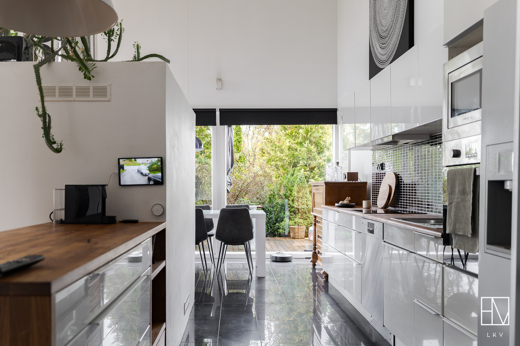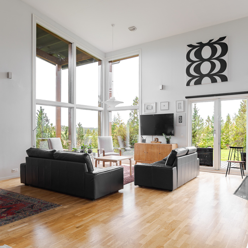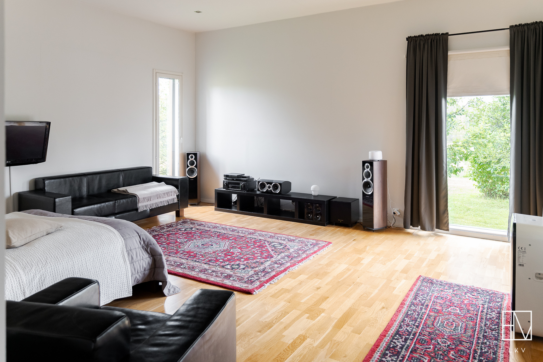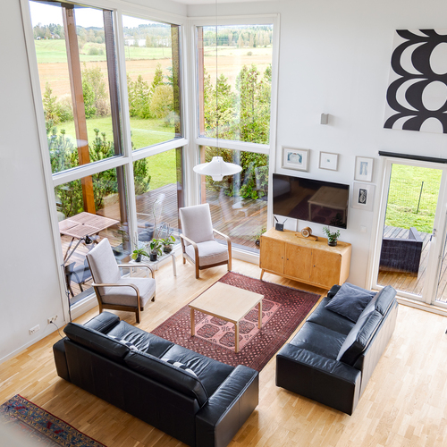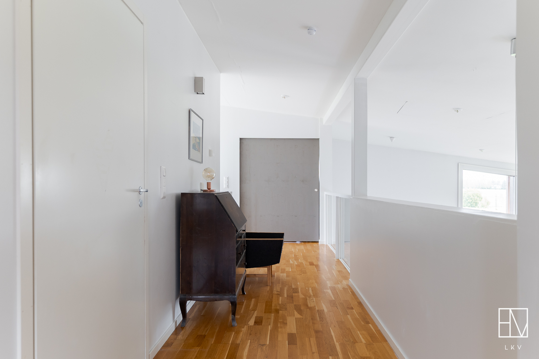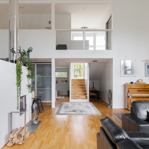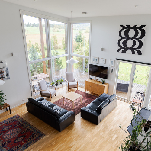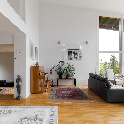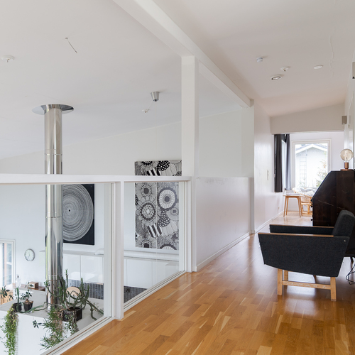 Kodissa korostuu avaruus ja valo. Olohuone ja keittiö muodostavat yhtenäisen, erittäin korkean tilan, jota suuret ikkunat tulvivat luonnonvalolla. Maisemat avautuvat pelloille ja järven pilkahdus täydentää idyllin.