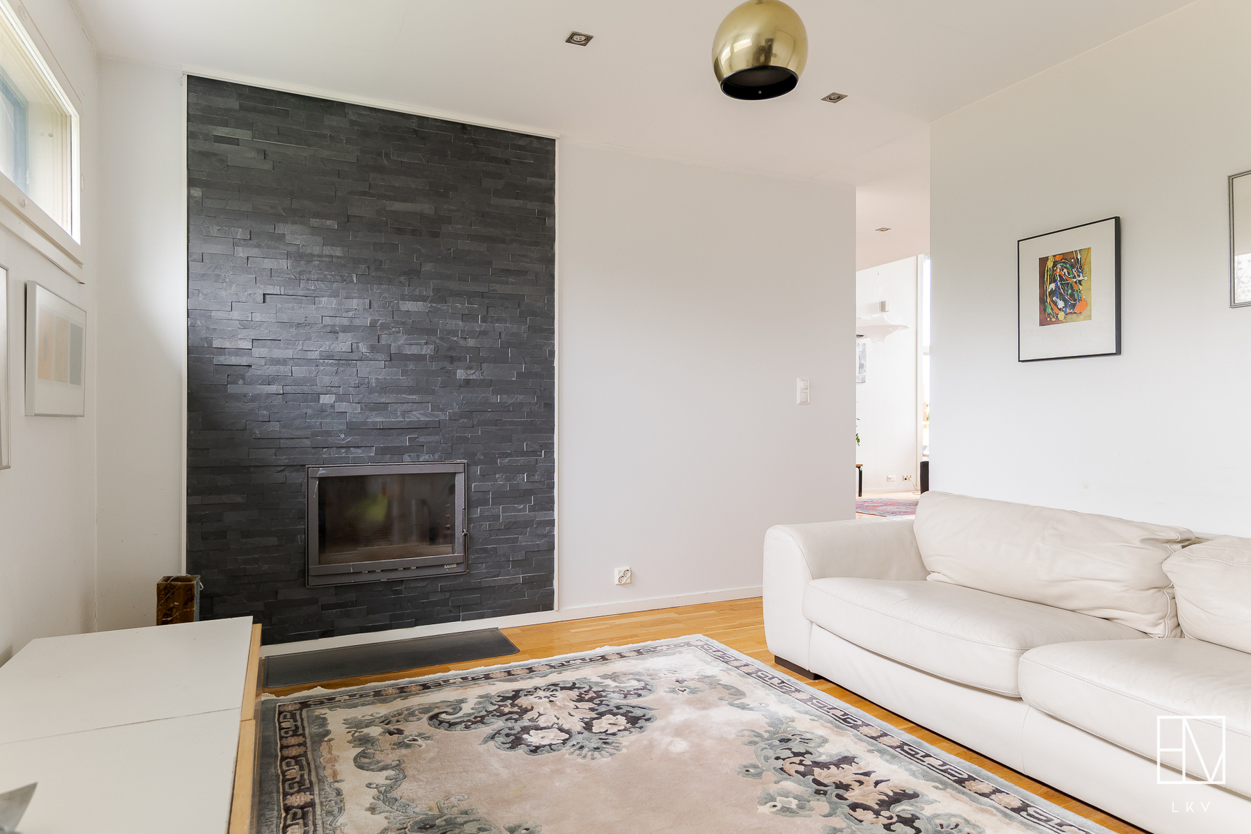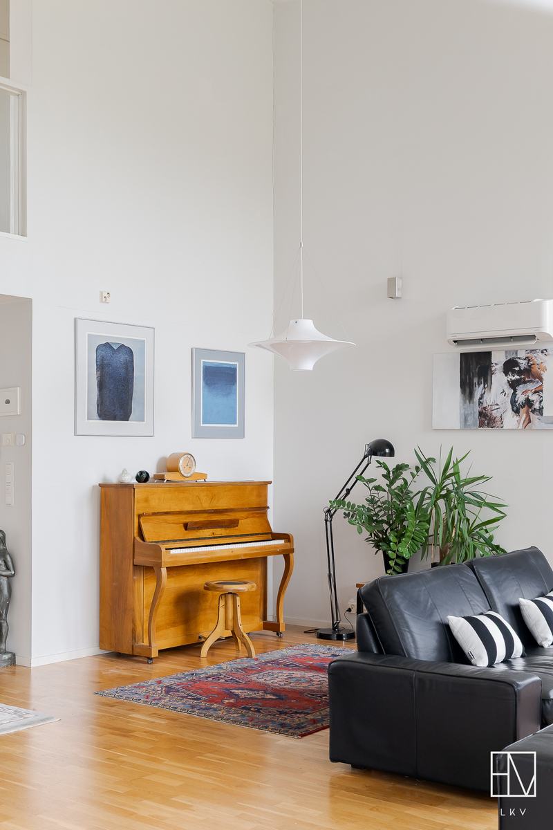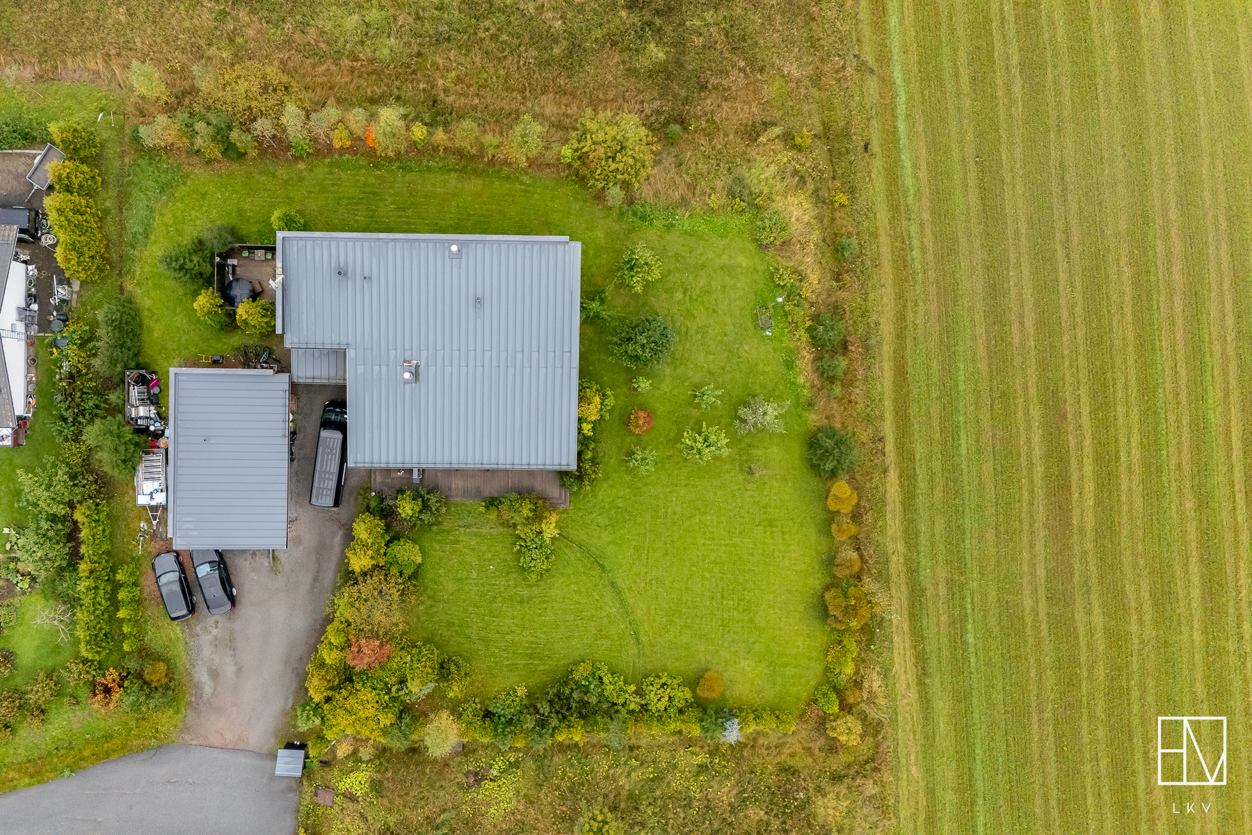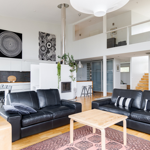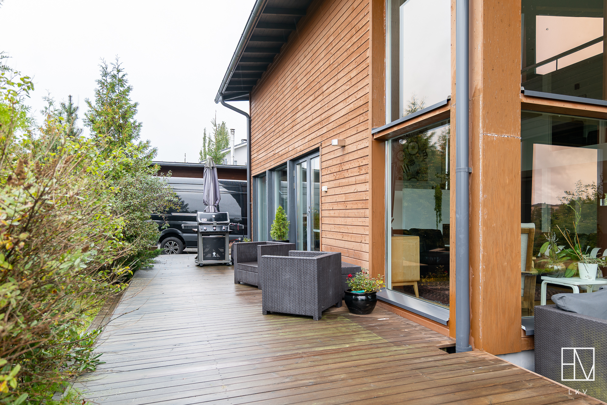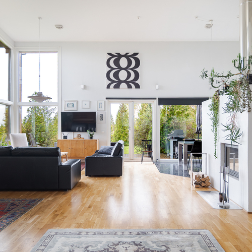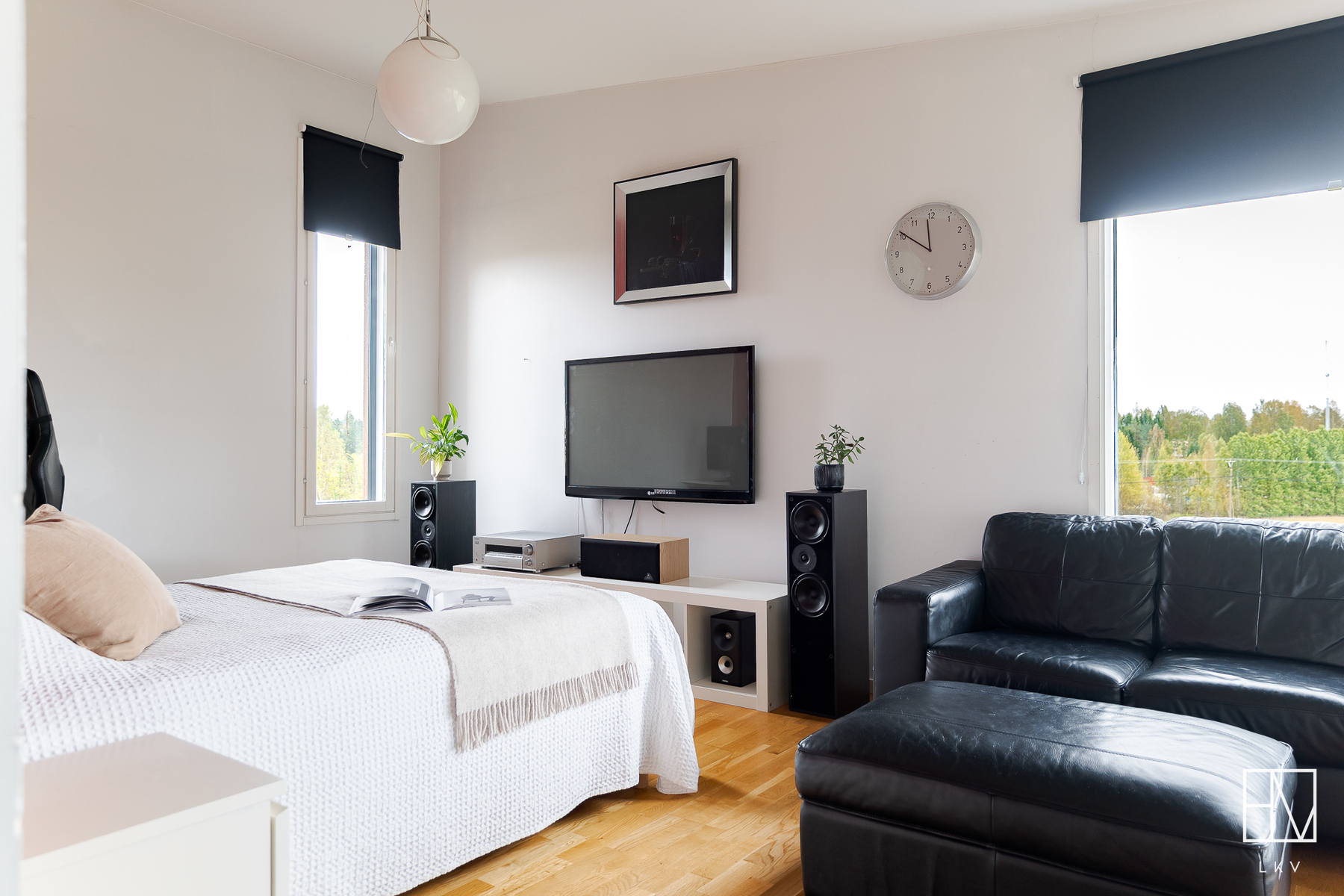 Kodissa korostuu avaruus ja valo. Olohuone ja keittiö muodostavat yhtenäisen, erittäin korkean tilan, jota suuret ikkunat tulvivat luonnonvalolla. Maisemat avautuvat pelloille ja järven pilkahdus täydentää idyllin.