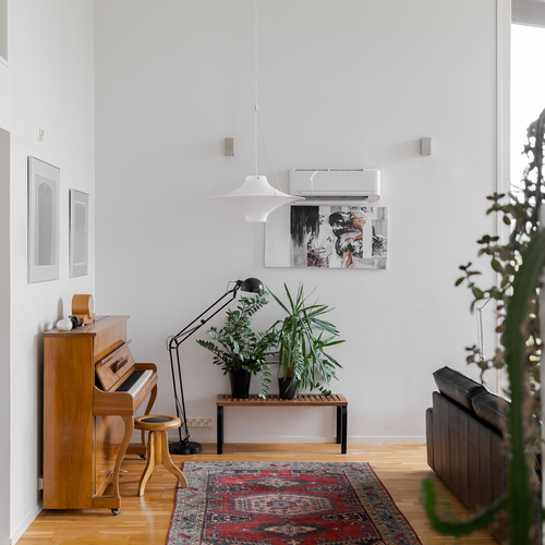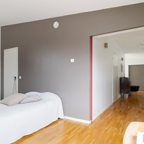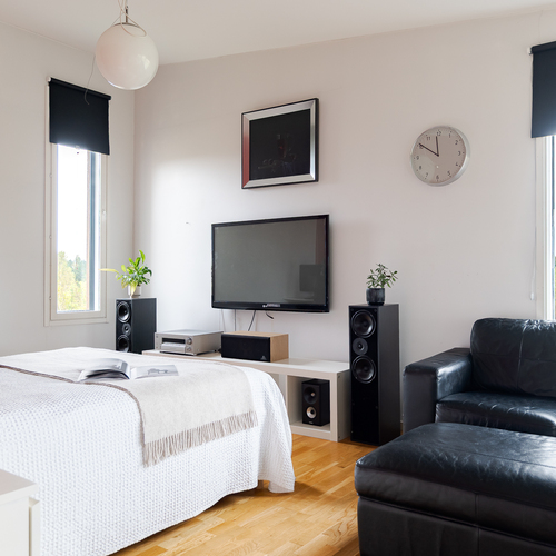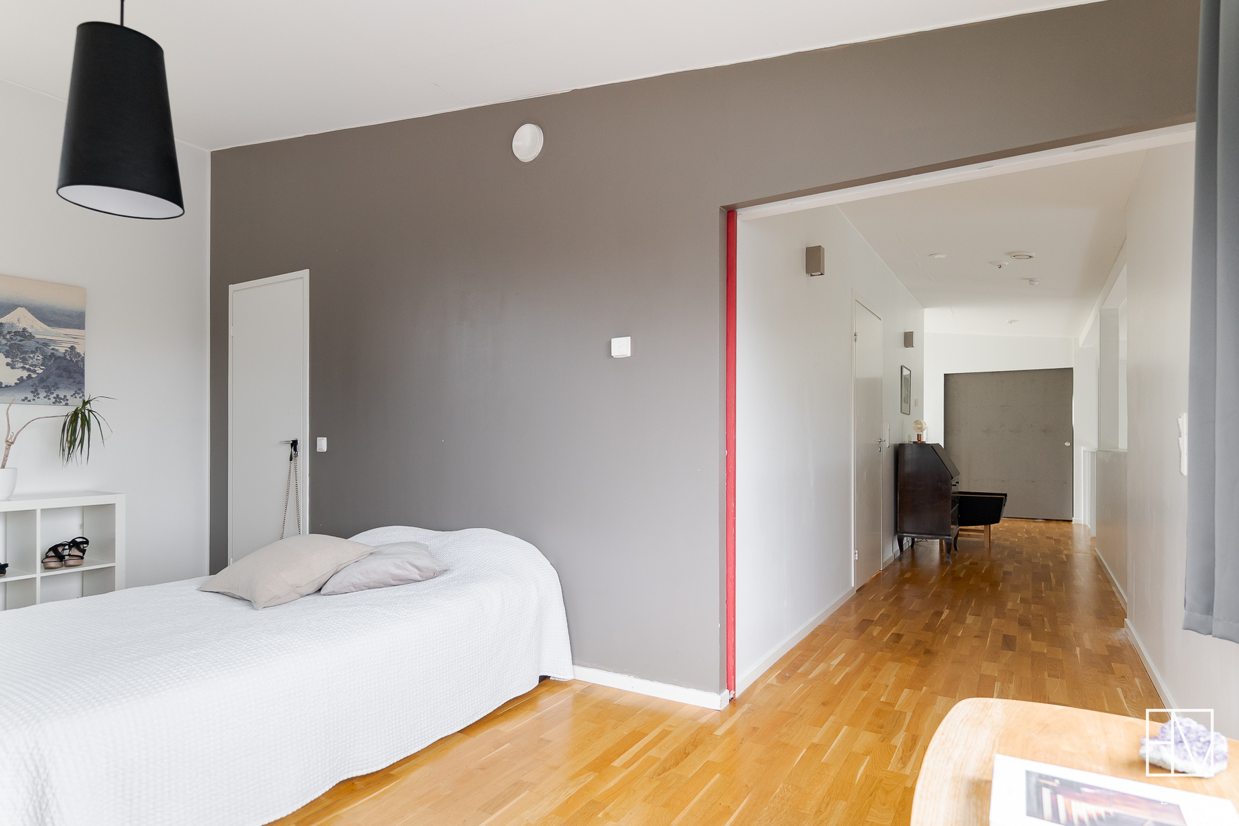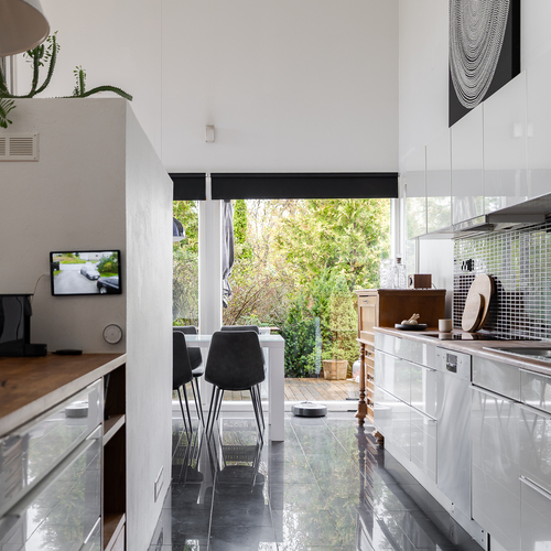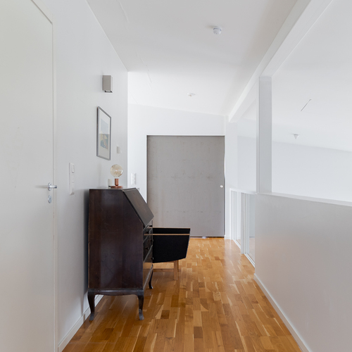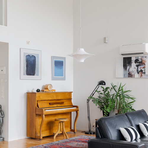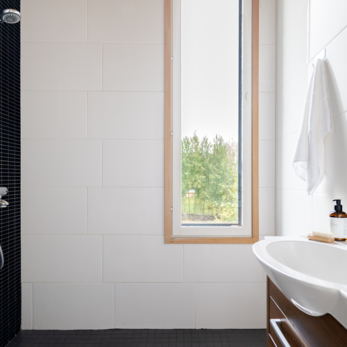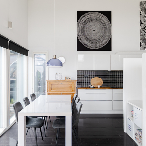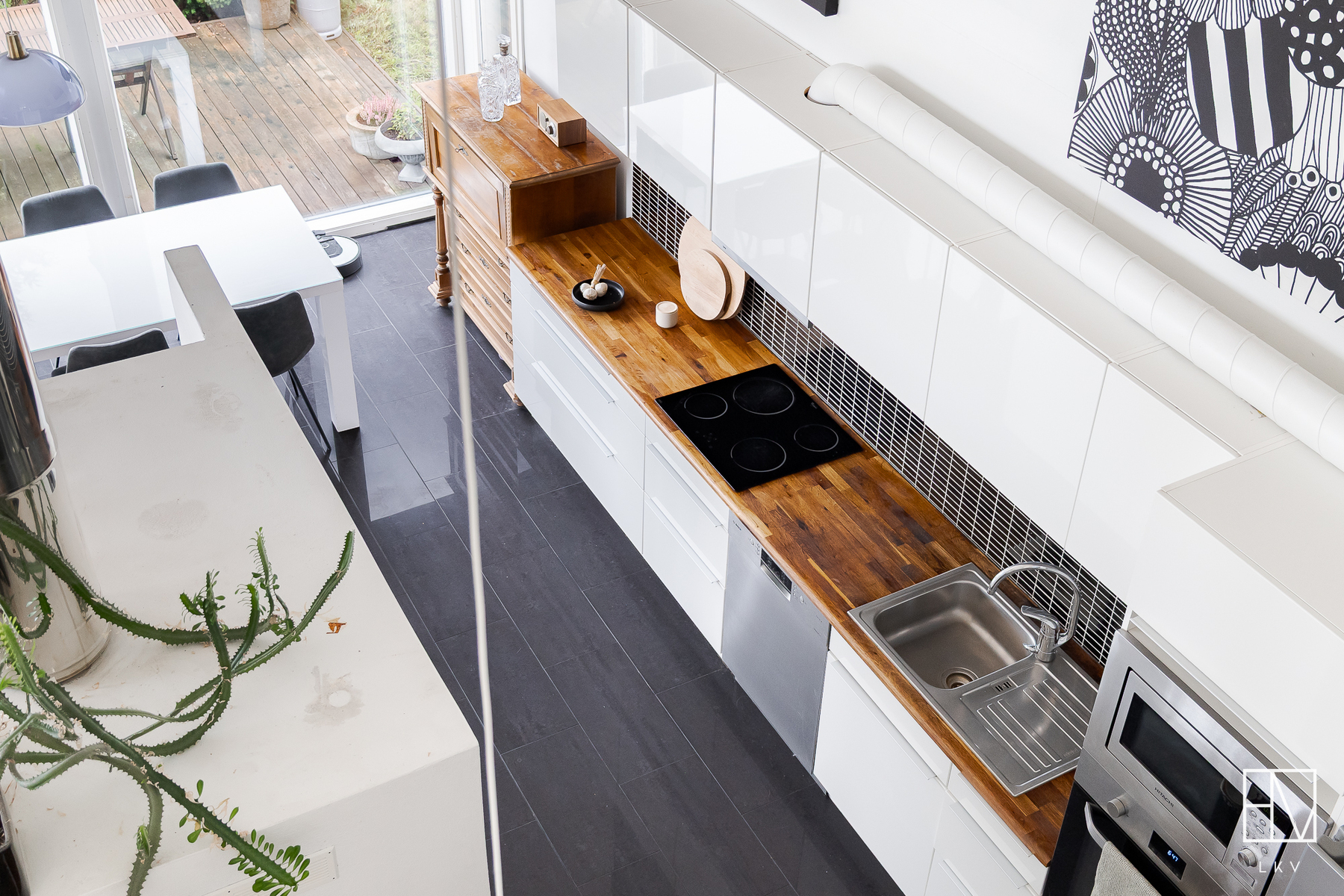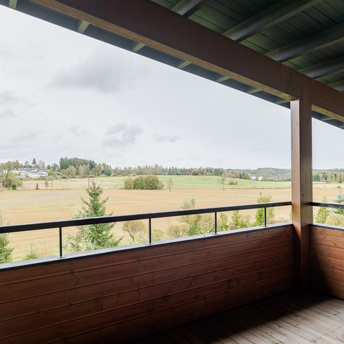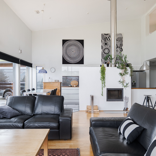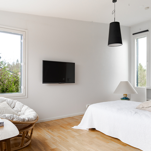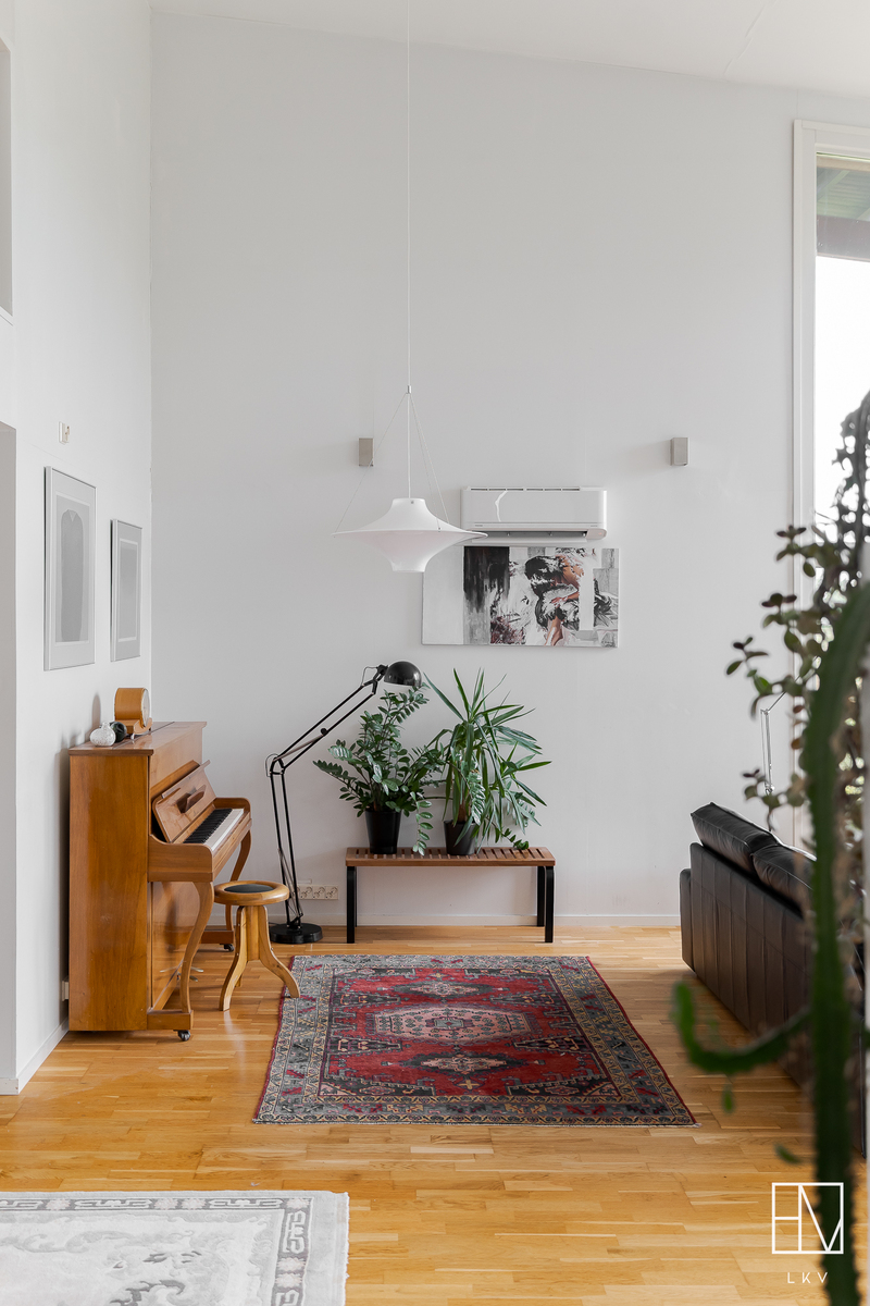 Kodissa korostuu avaruus ja valo. Olohuone ja keittiö muodostavat yhtenäisen, erittäin korkean tilan, jota suuret ikkunat tulvivat luonnonvalolla. Maisemat avautuvat pelloille ja järven pilkahdus täydentää idyllin.