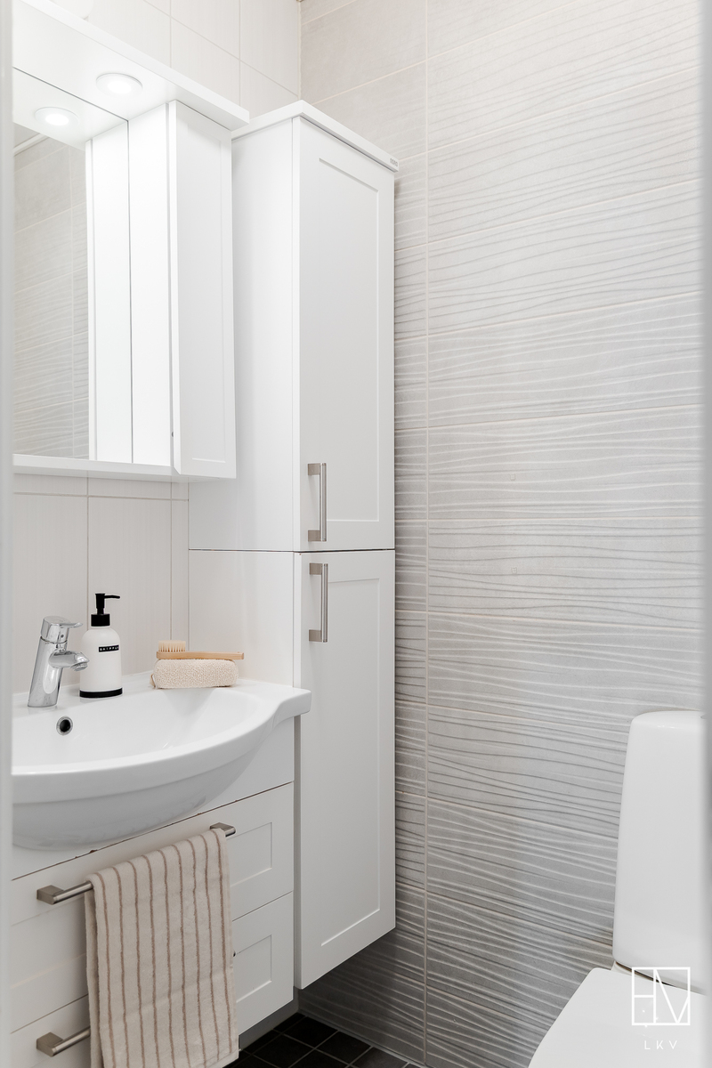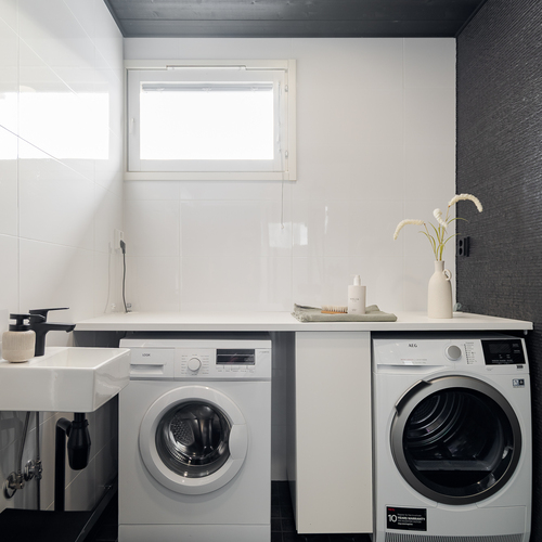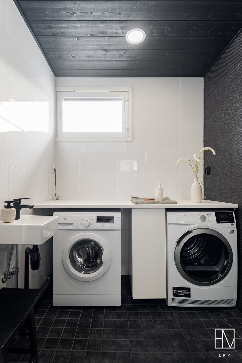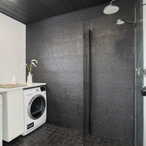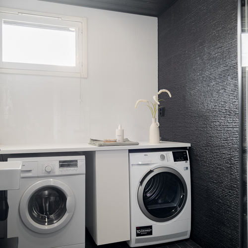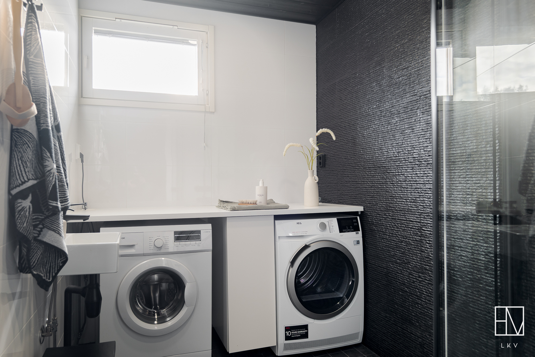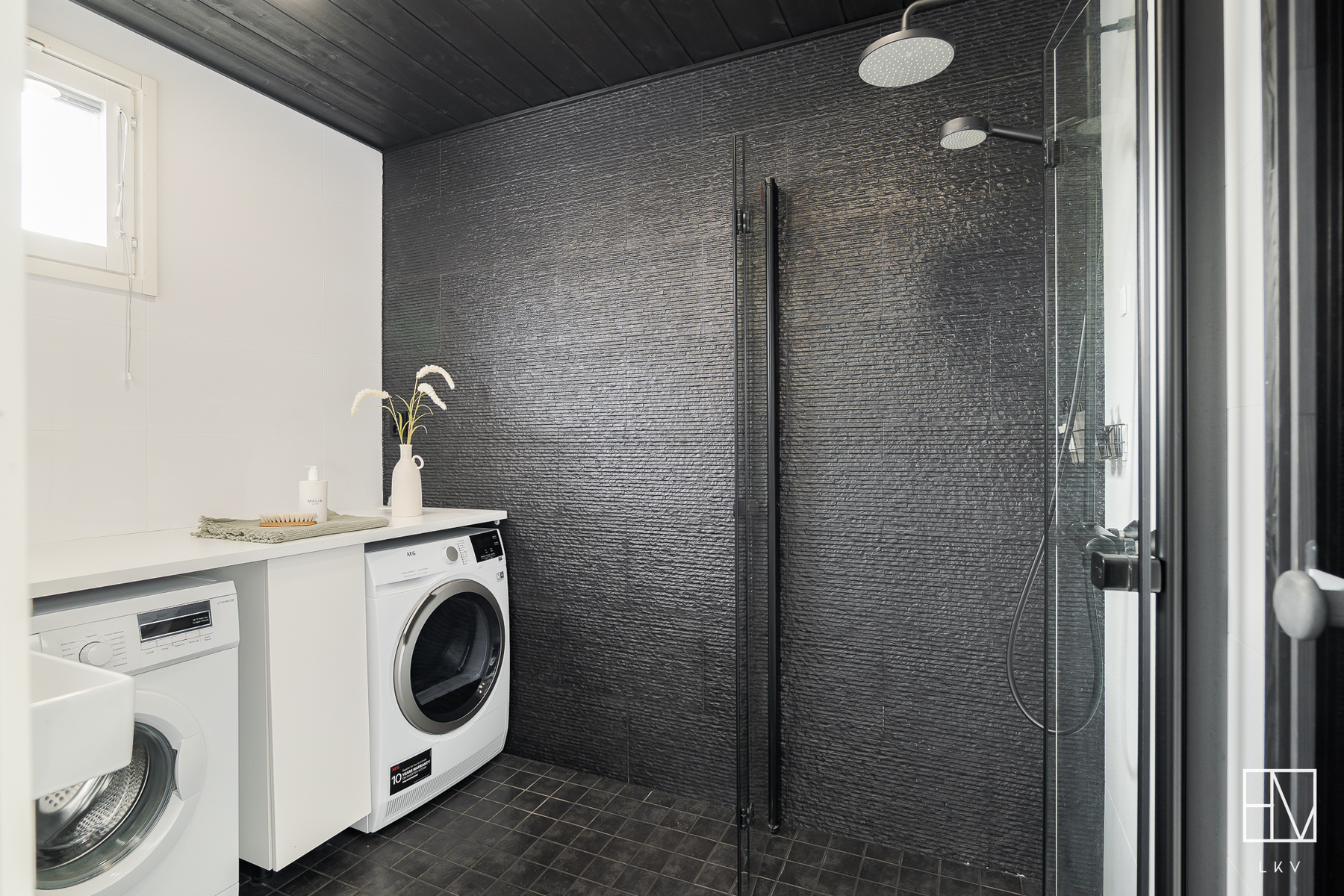 VARUSTUS: suihku, suihkuseinä, allas, pesukoneliitäntä.