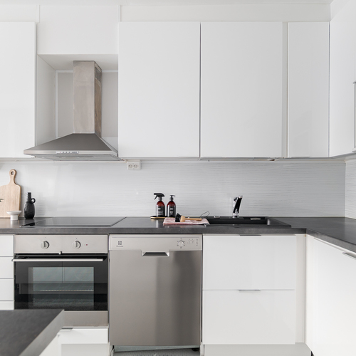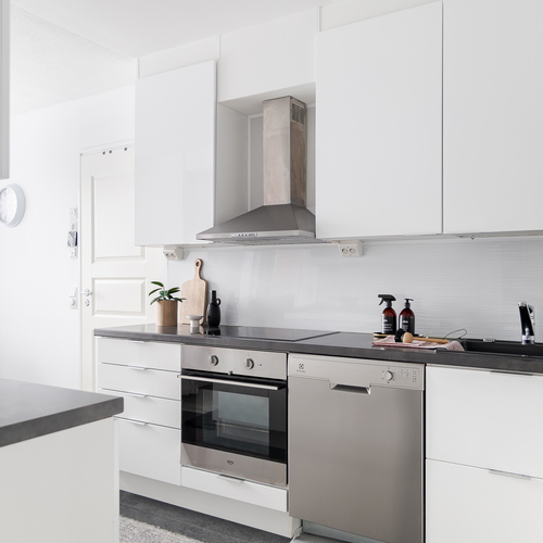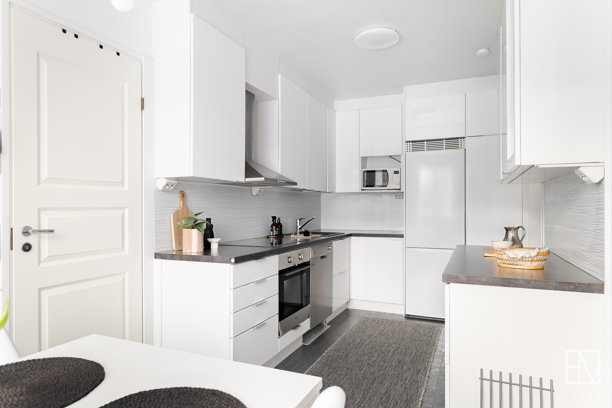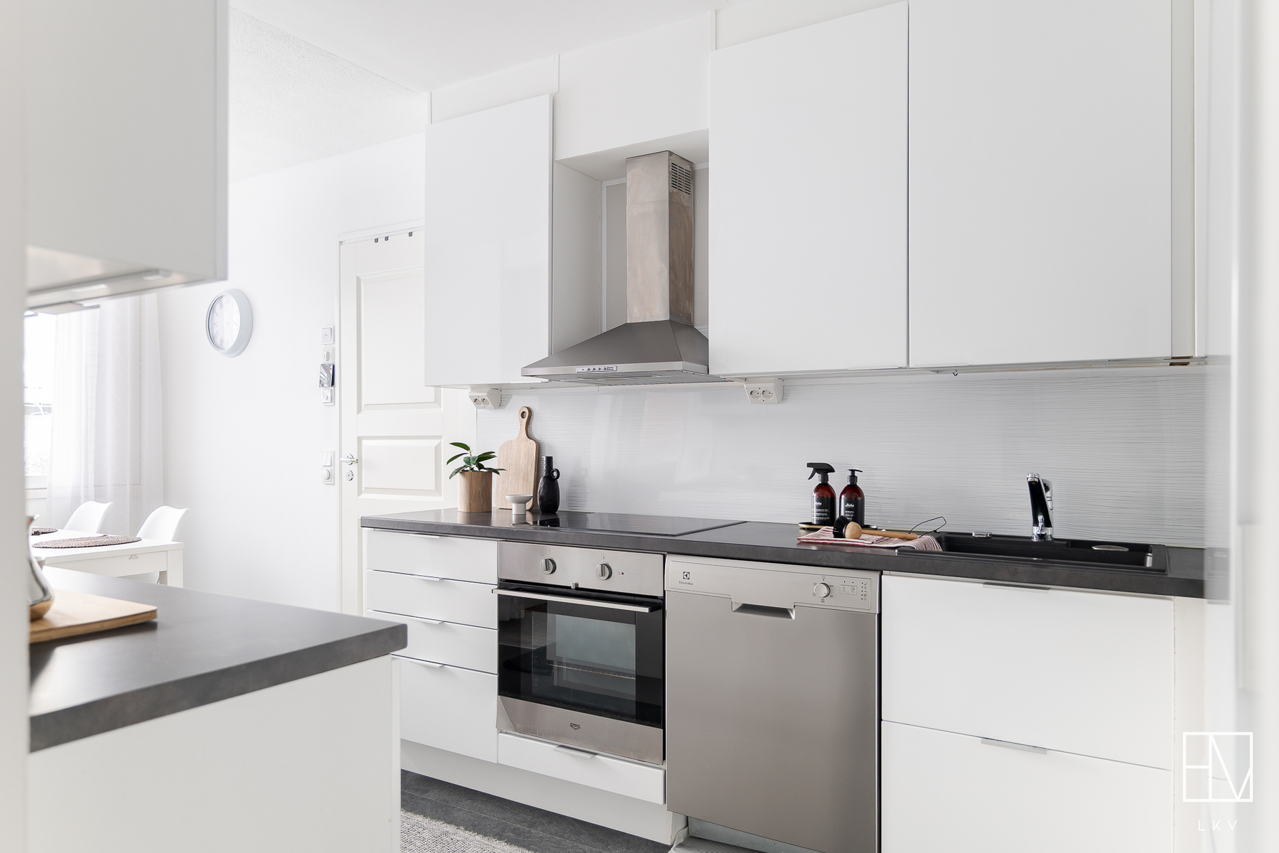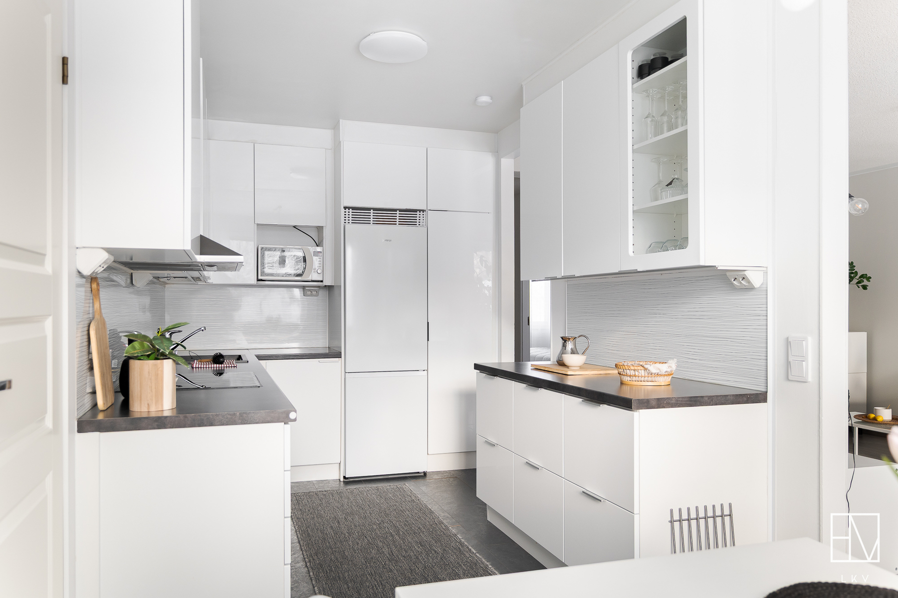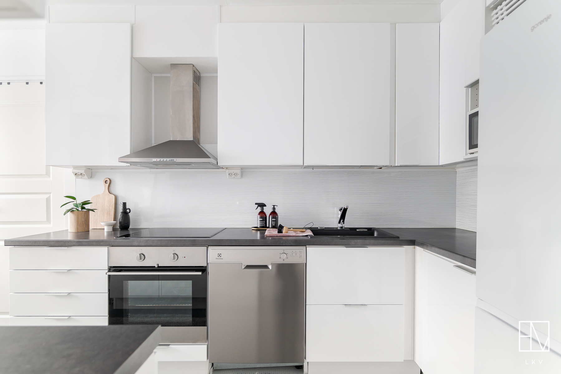 VARUSTUS: jääkaappi/pakastin, astianpesukone, induktioliesi, liesituuletin, erillisuuni, paikka mikroaaltouunille.