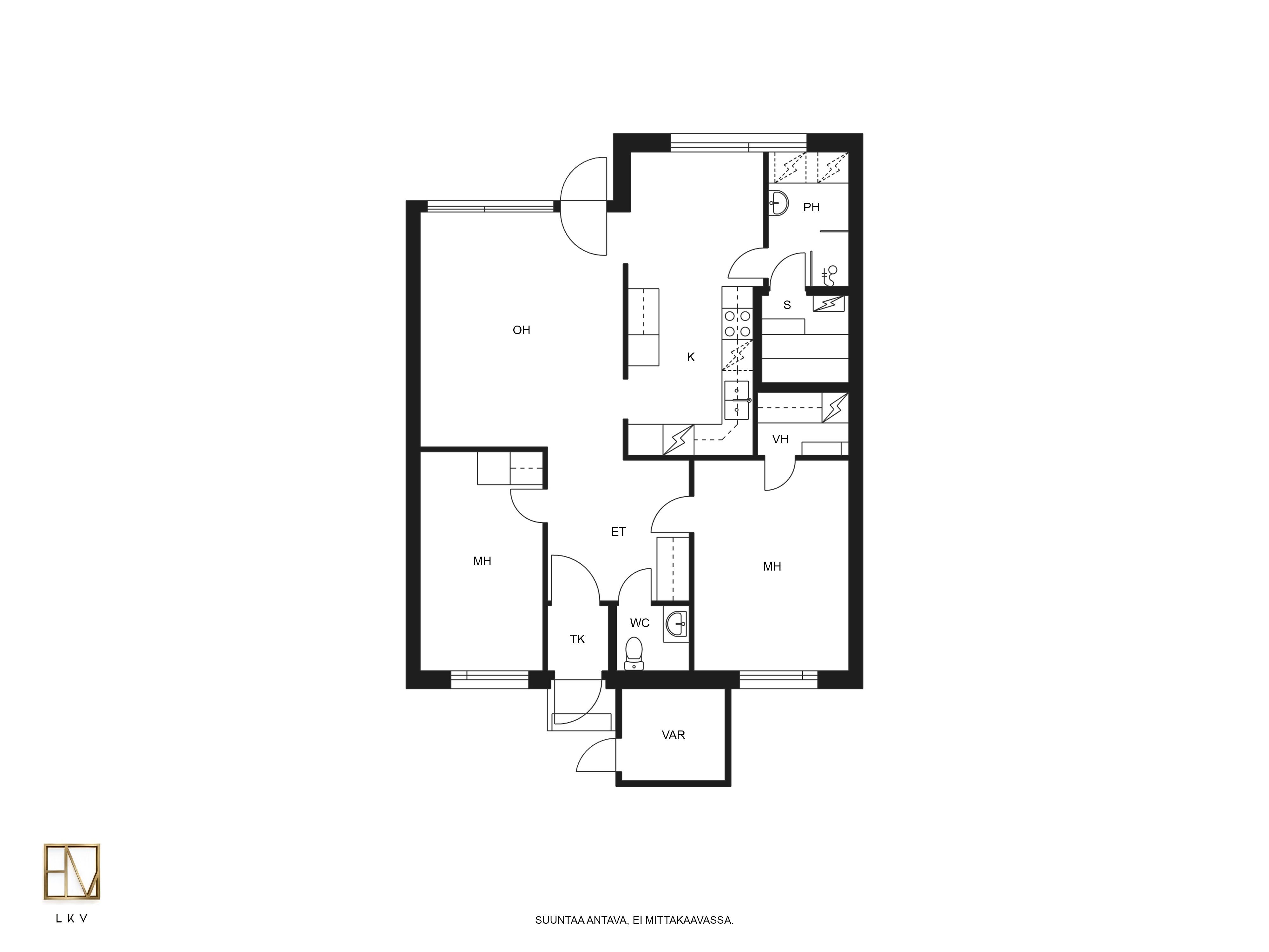 Asunnossa on kaksi makuuhuonetta, keittiö, kylpyhuone, erillinen wc sekä sauna, jossa on sekä sähkösauna että infrapunasauna. Asunto on remontoitu noin neljä vuotta sitten hyvällä maulla, ja keittiö on uusittu jo aiemmin, kuitenkin 2010-luvun loppupuolella. Säilytystilaa on runsaasti vaatehuoneen, kaapistojen ja huoneistolle kuuluvan ulkovaraston ansiosta.