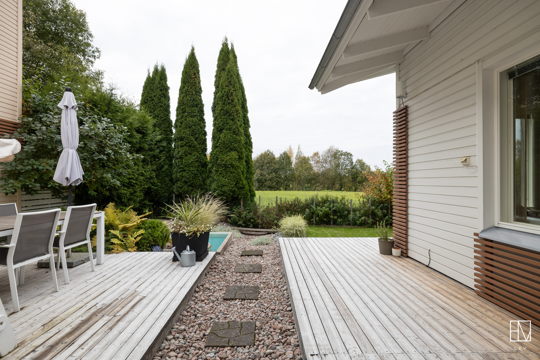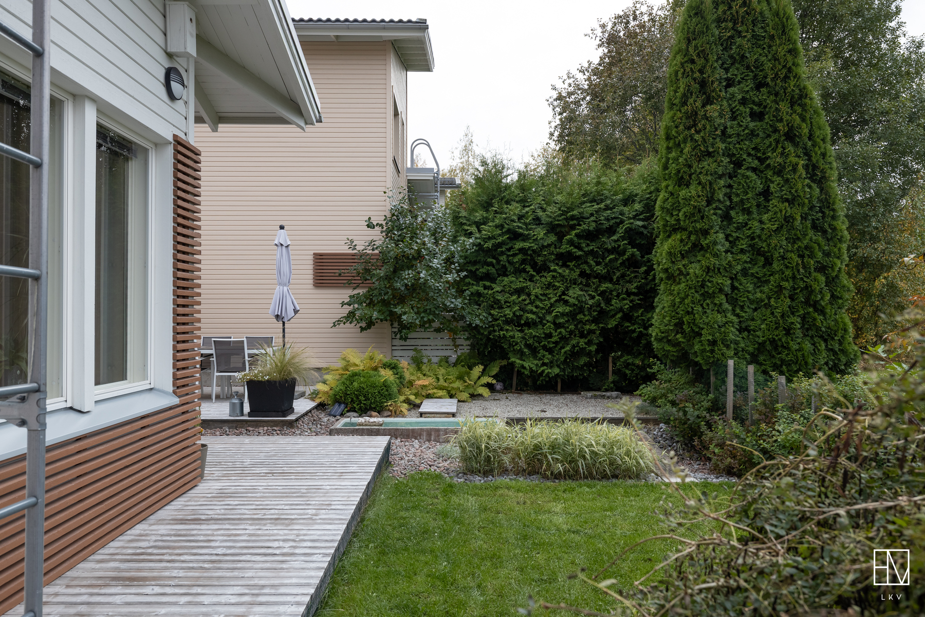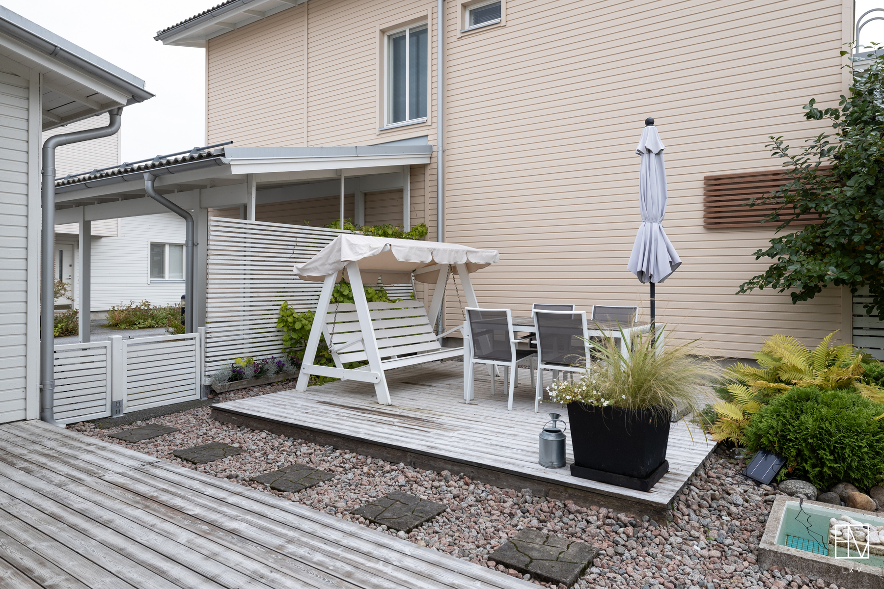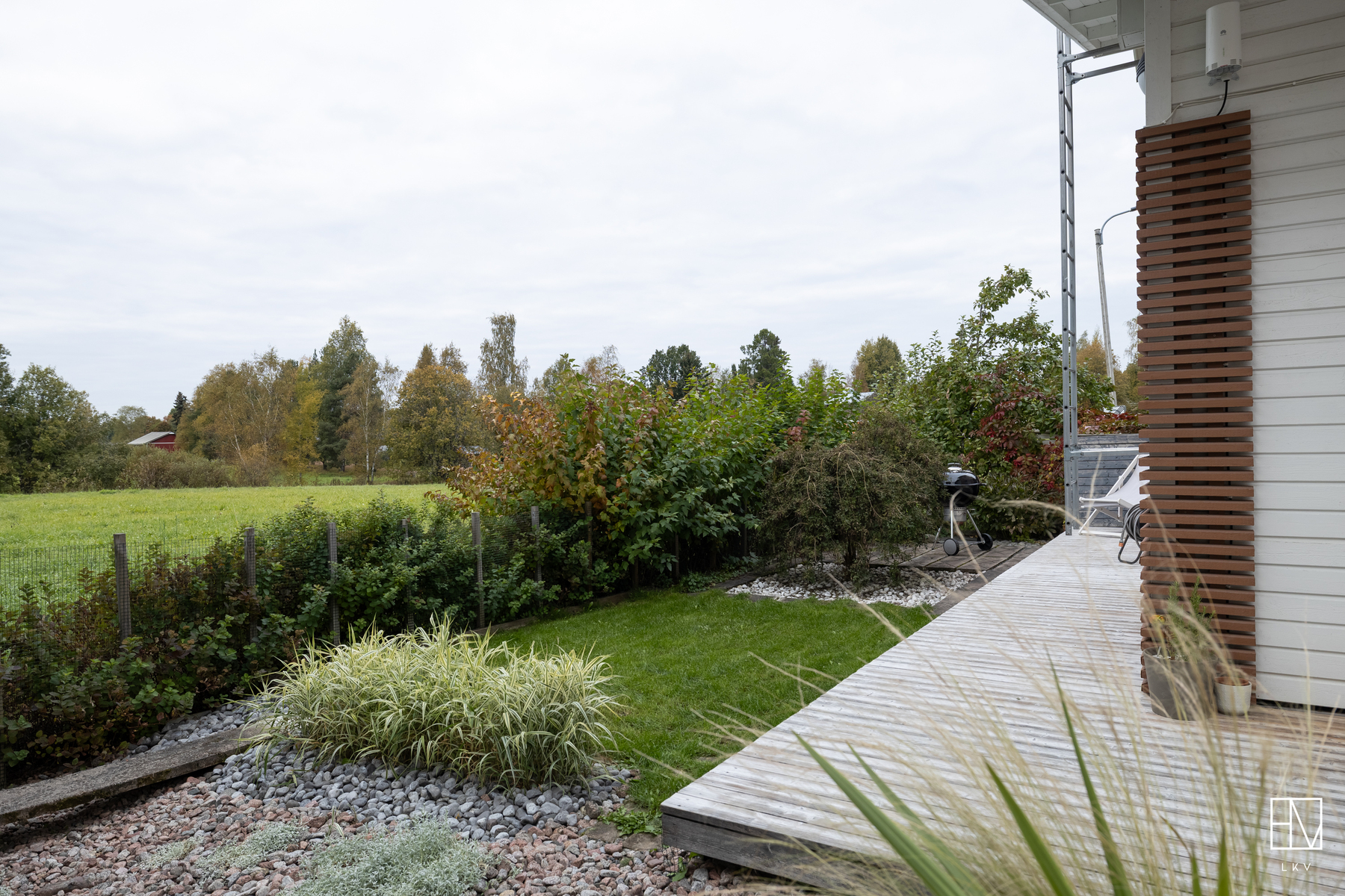 Etelän- ja lännensuuntaisella takapihalla löytyvät isot lehtikuusiterassit, koristekivialueet, pieni nurmialue, istutukset ja koristeallas. Kyseessä on yhtiön reunimmainen talo, jonka terassilla voi nauttia pellon yli laskevan ilta-auringon säteistä viimeiseen asti.