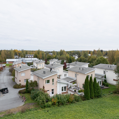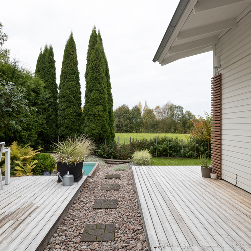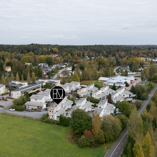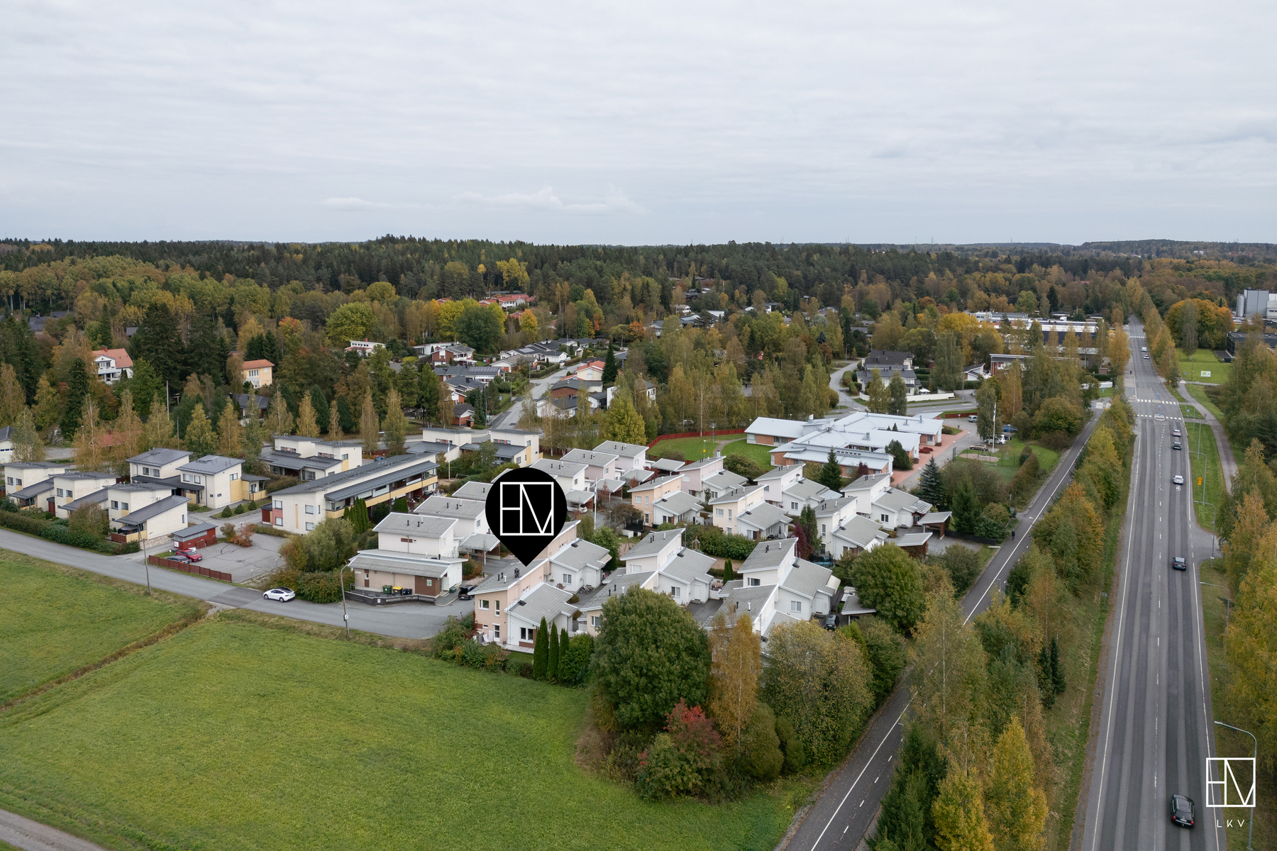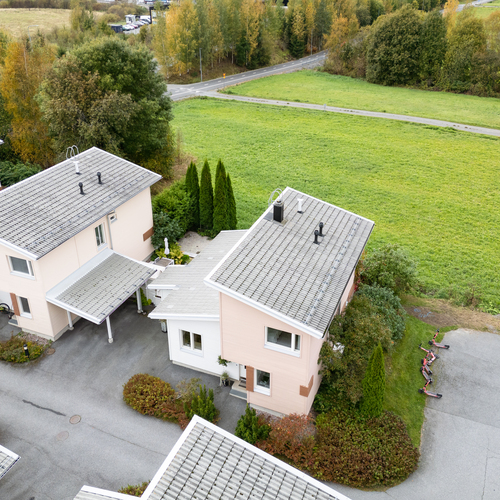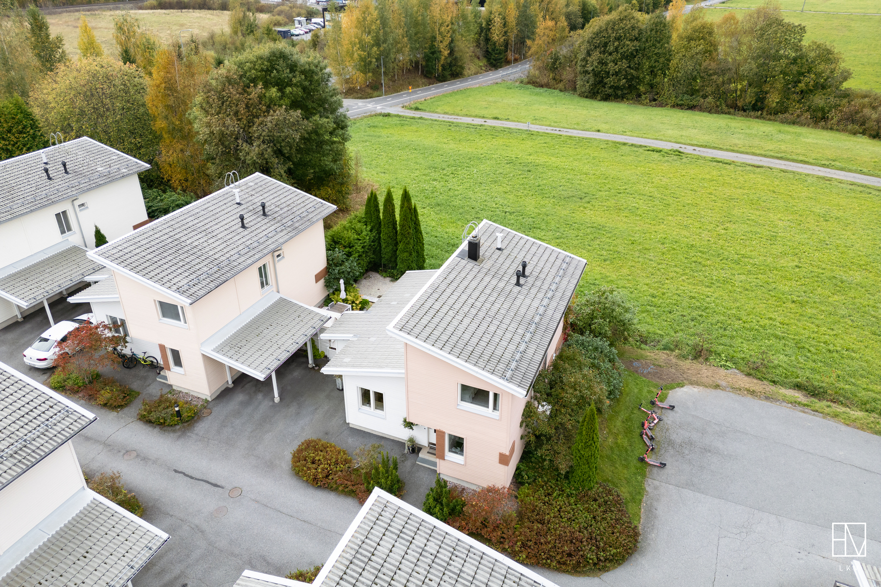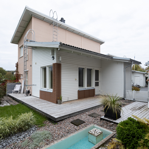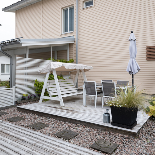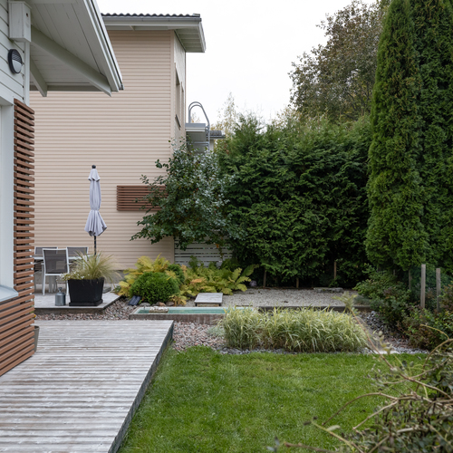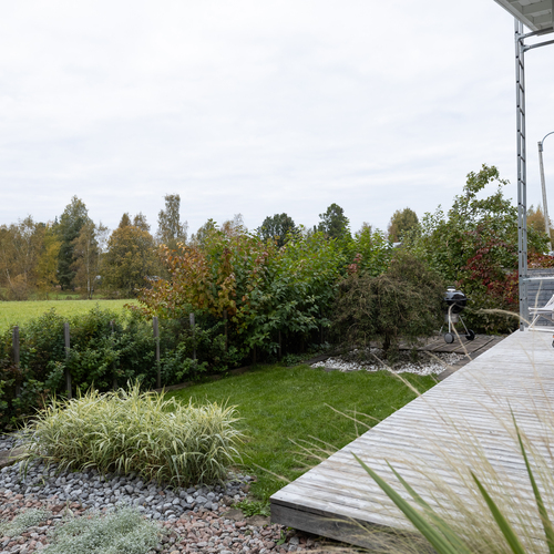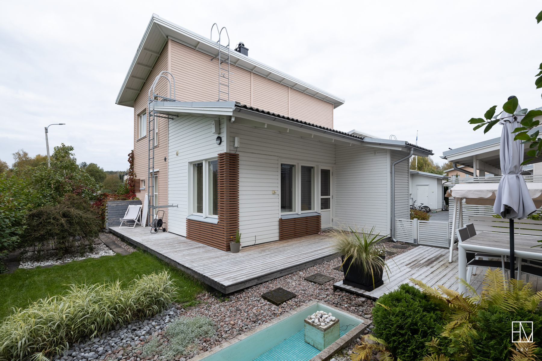 Etelän- ja lännensuuntaisella takapihalla löytyvät isot lehtikuusiterassit, koristekivialueet, pieni nurmialue, istutukset ja koristeallas. Kyseessä on yhtiön reunimmainen talo, jonka terassilla voi nauttia pellon yli laskevan ilta-auringon säteistä viimeiseen asti.