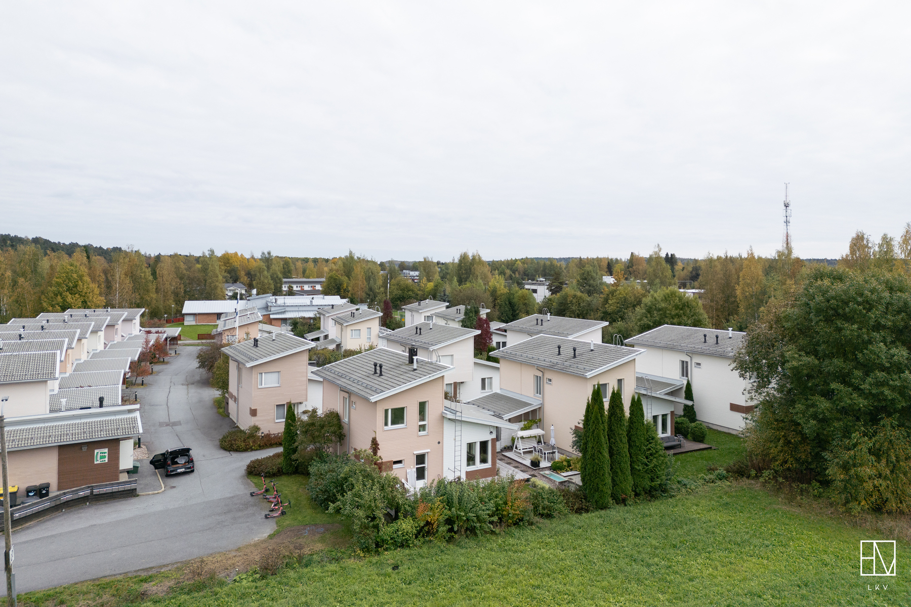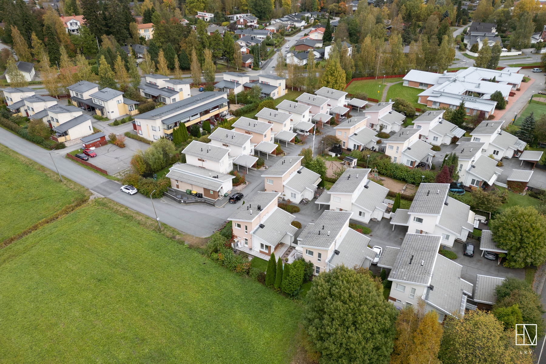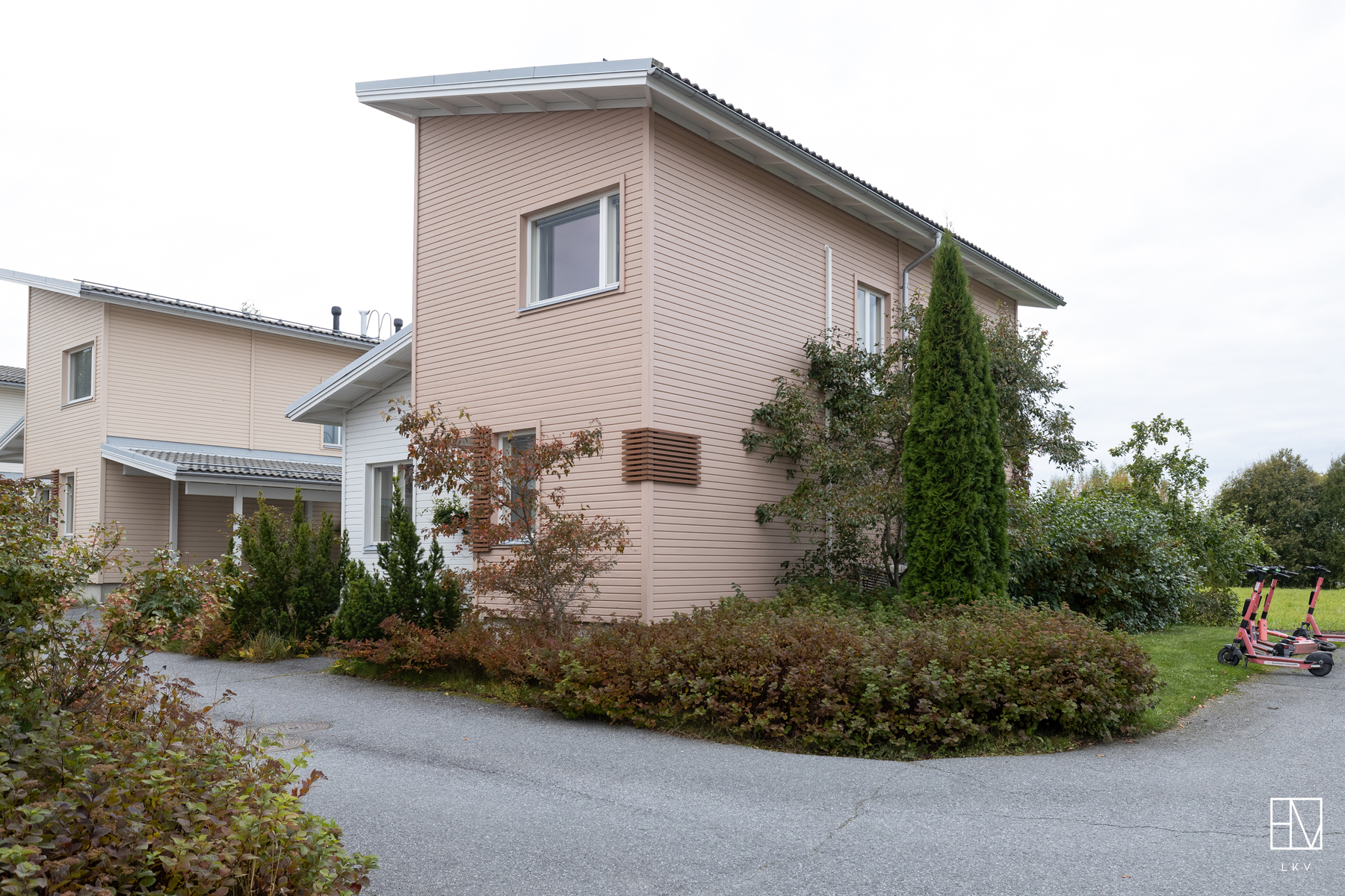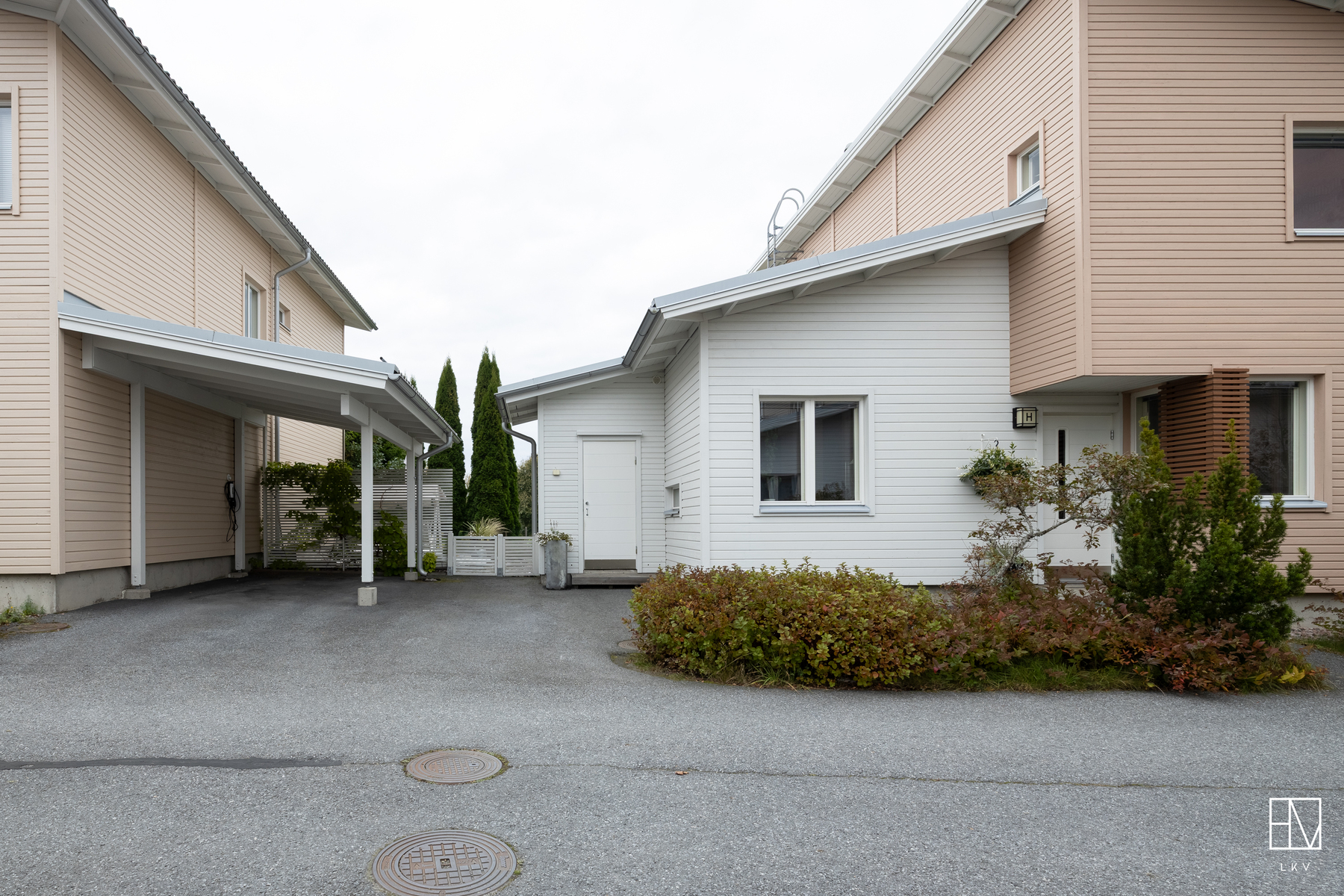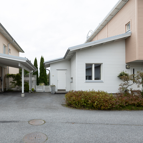 Säilytystilaa on riittävästi; oman ulkovaraston lisäksi asuntoon kuuluu yhtiön tiloissa oleva välinevarasto, jossa tilat polkupyörille, auton renkaille yms. kausitavaroille. Takapihalta löytyy puutarhatarvikkeiden säilytystä varten pieni varastokoppi. Pihassa on autopaikat kahdelle autolle, toinen näistä autokatos, jossa sähköauton latausasema.