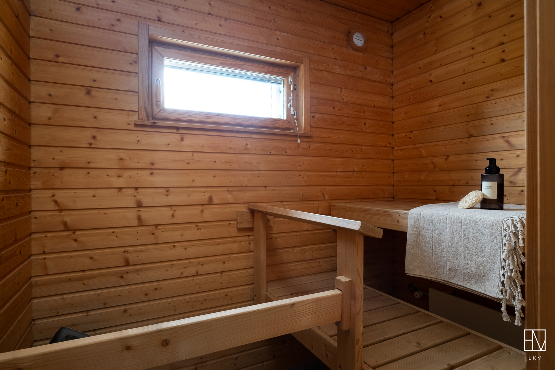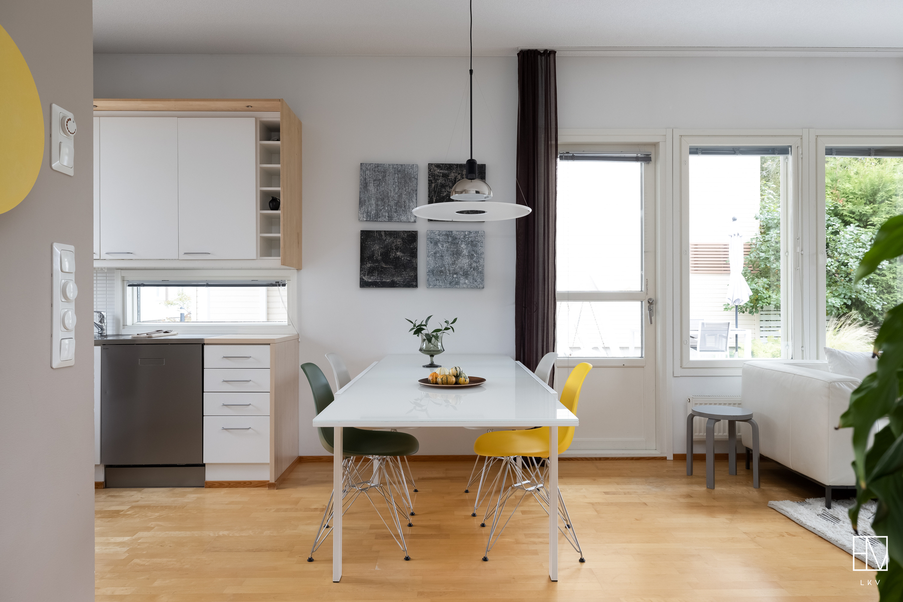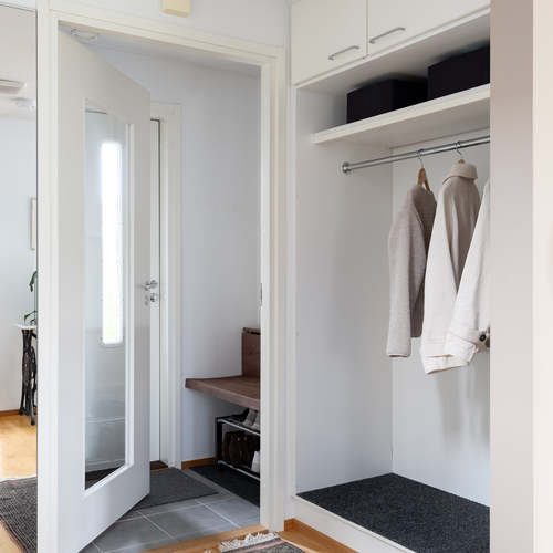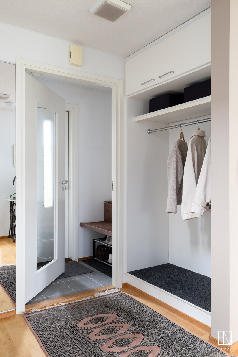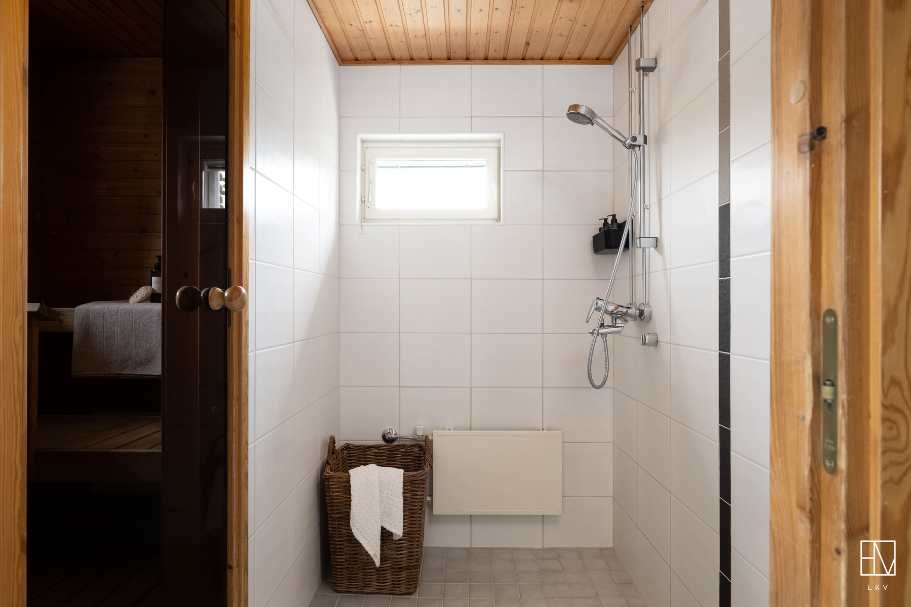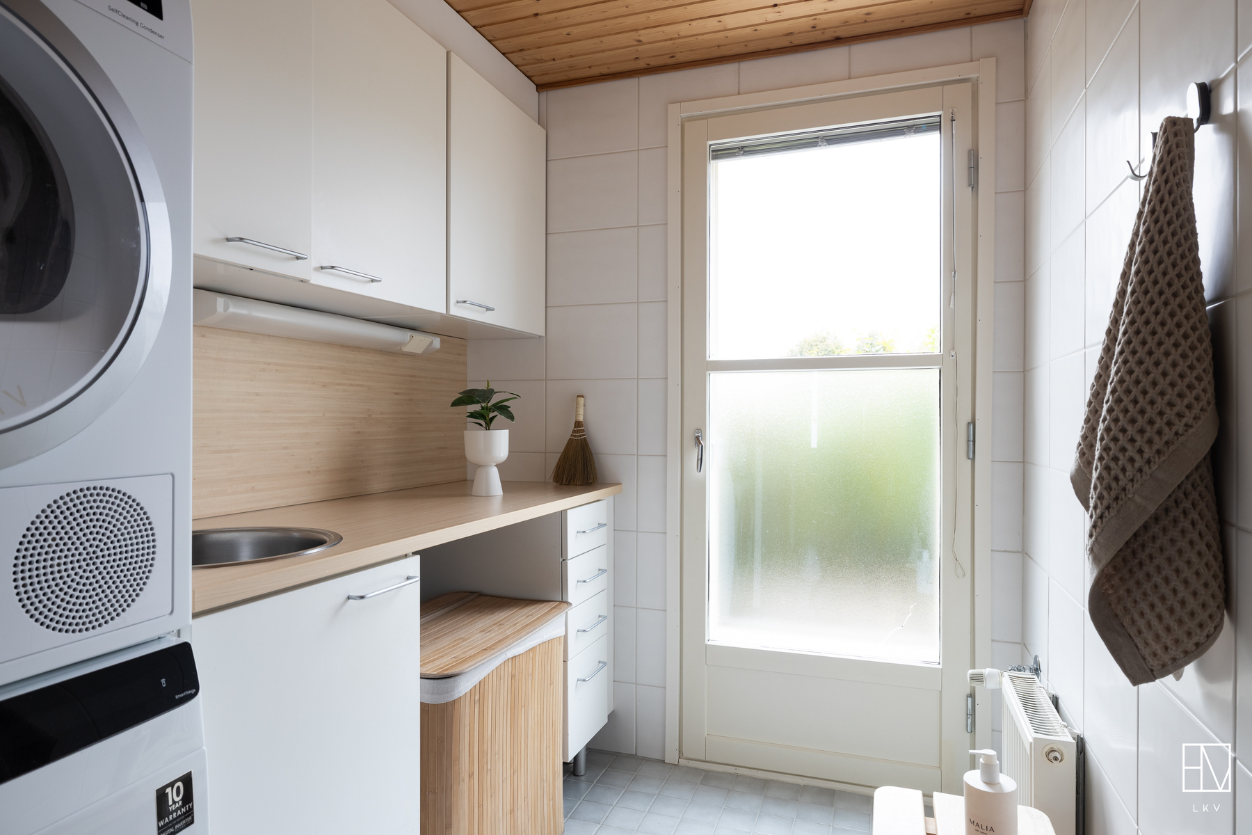 Säilytystilaa on riittävästi; oman ulkovaraston lisäksi asuntoon kuuluu yhtiön tiloissa oleva välinevarasto, jossa tilat polkupyörille, auton renkaille yms. kausitavaroille. Takapihalta löytyy puutarhatarvikkeiden säilytystä varten pieni varastokoppi. Pihassa on autopaikat kahdelle autolle, toinen näistä autokatos, jossa sähköauton latausasema.