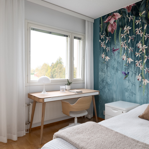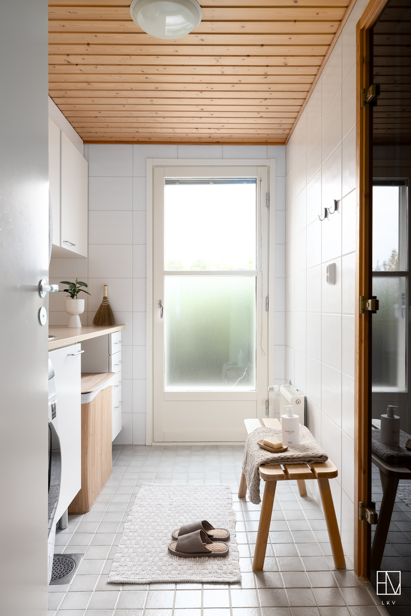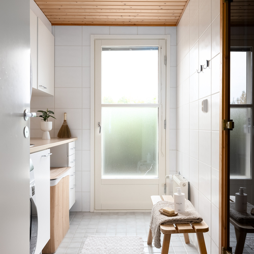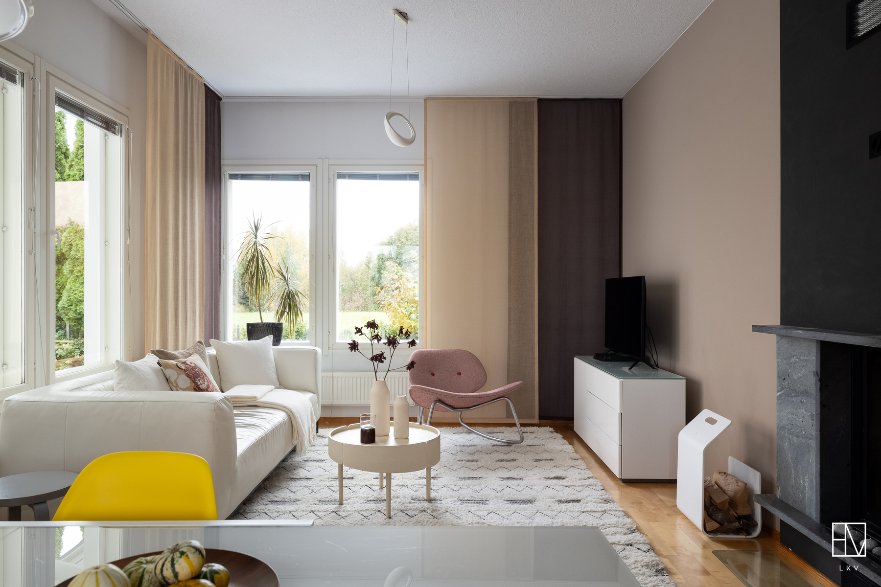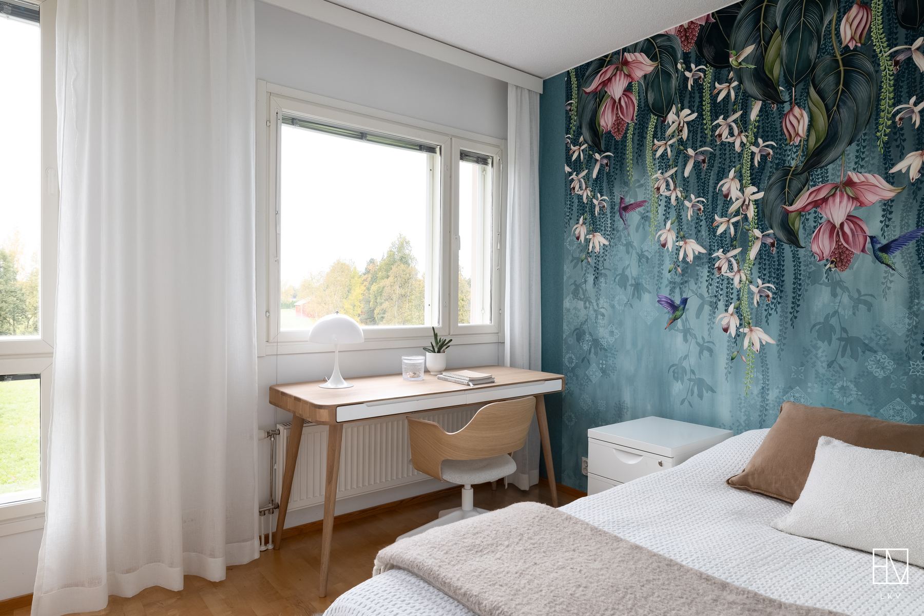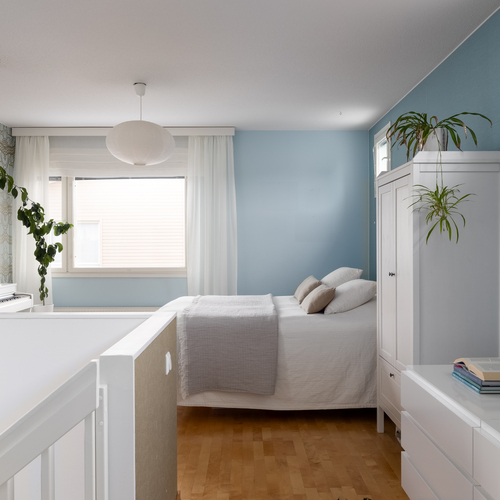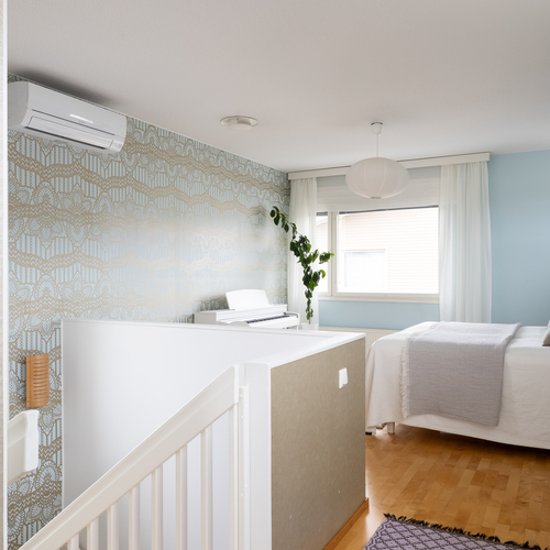 Seinämateriaali: Maalatut seinät, yläkerran makuuhuoneissa osalla seinistä tapetti