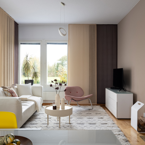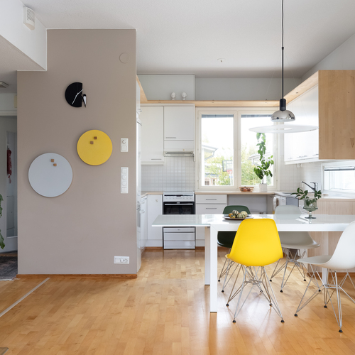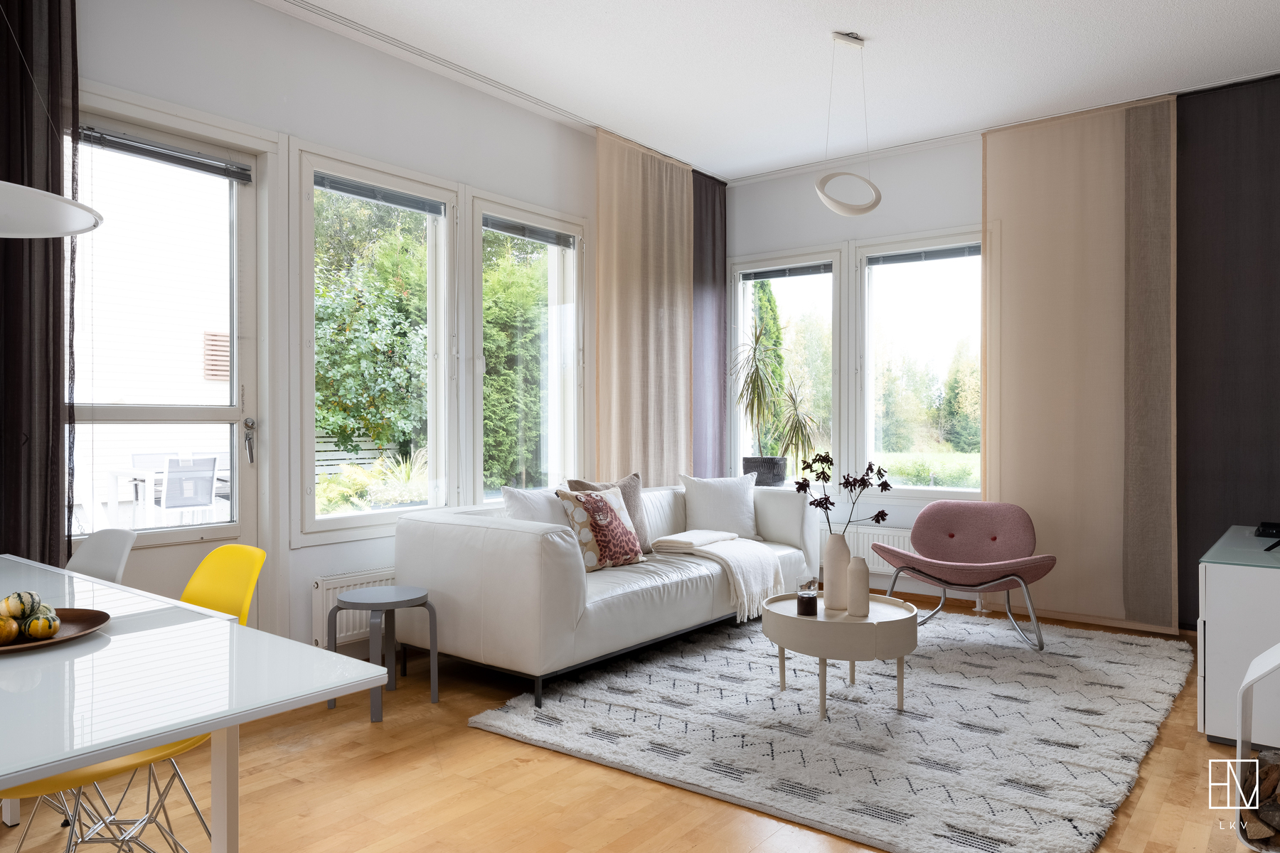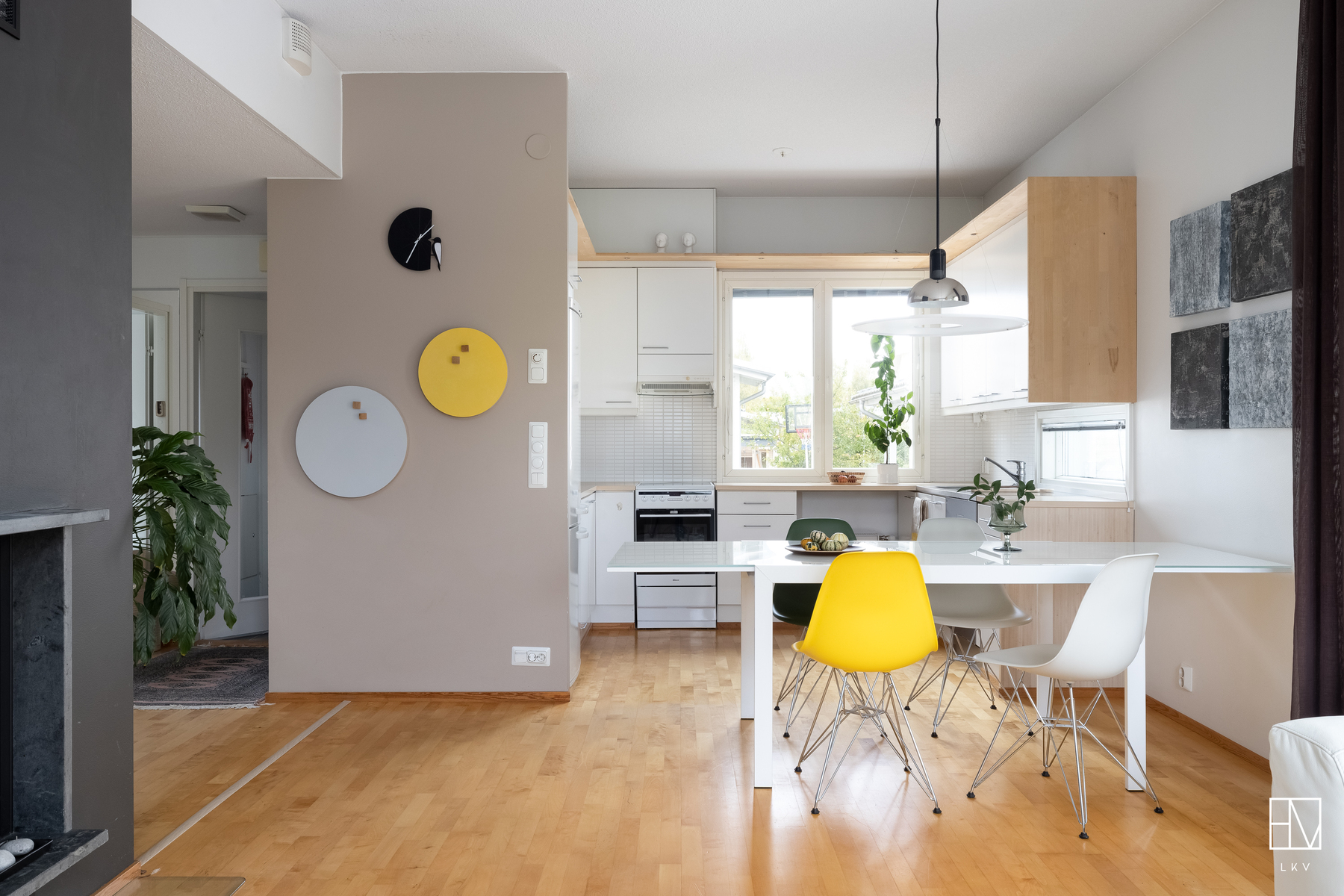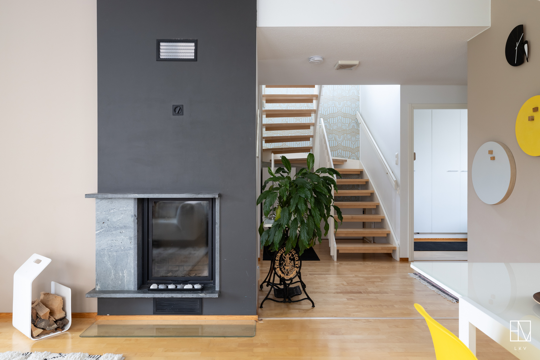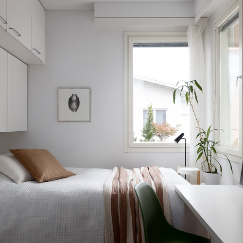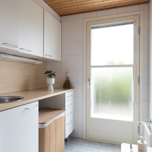 Seinämateriaali: Maalatut seinät, yläkerran makuuhuoneissa osalla seinistä tapetti