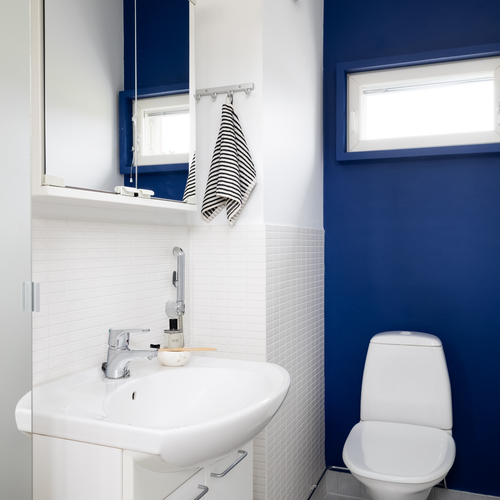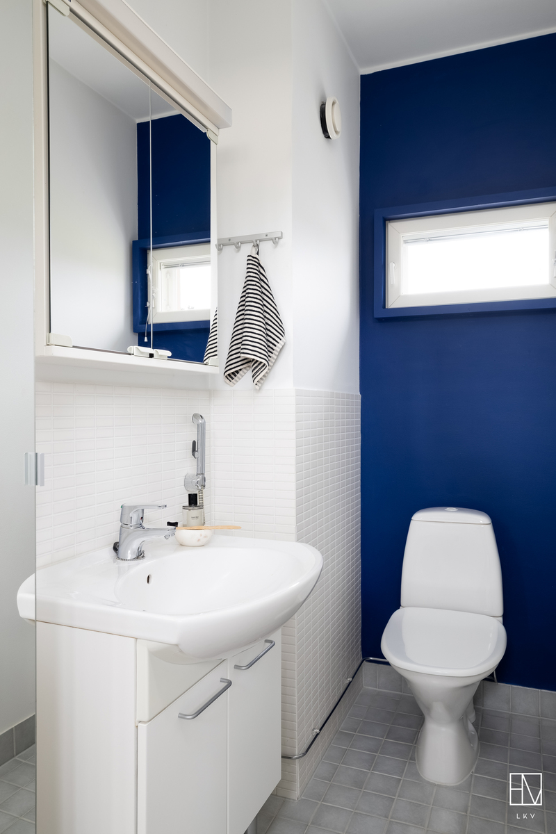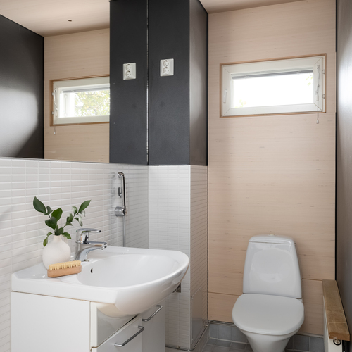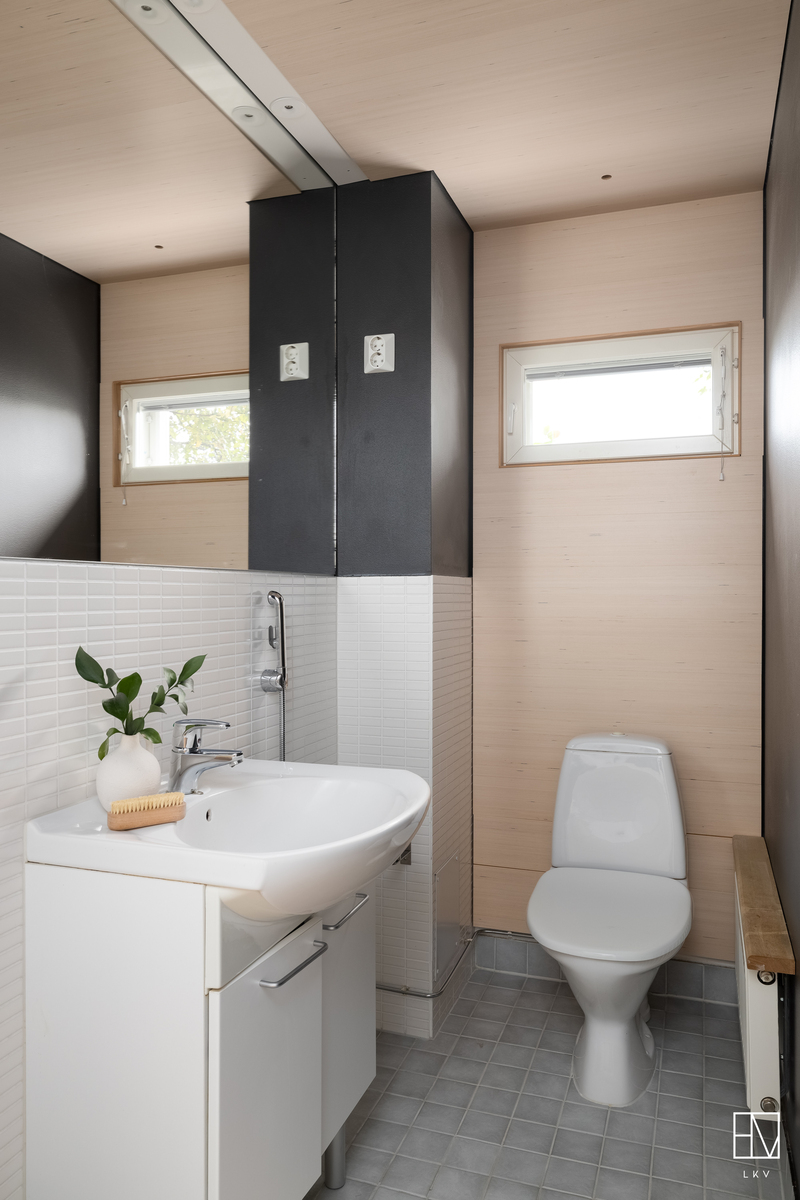 Alakerran WC:ssä led-valaistus katossa ja koristeseinä istuimen takana