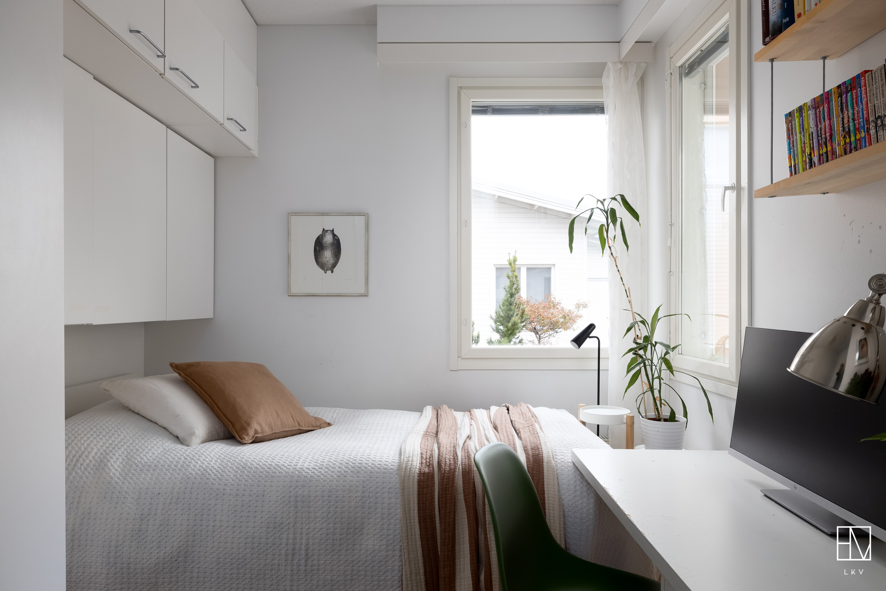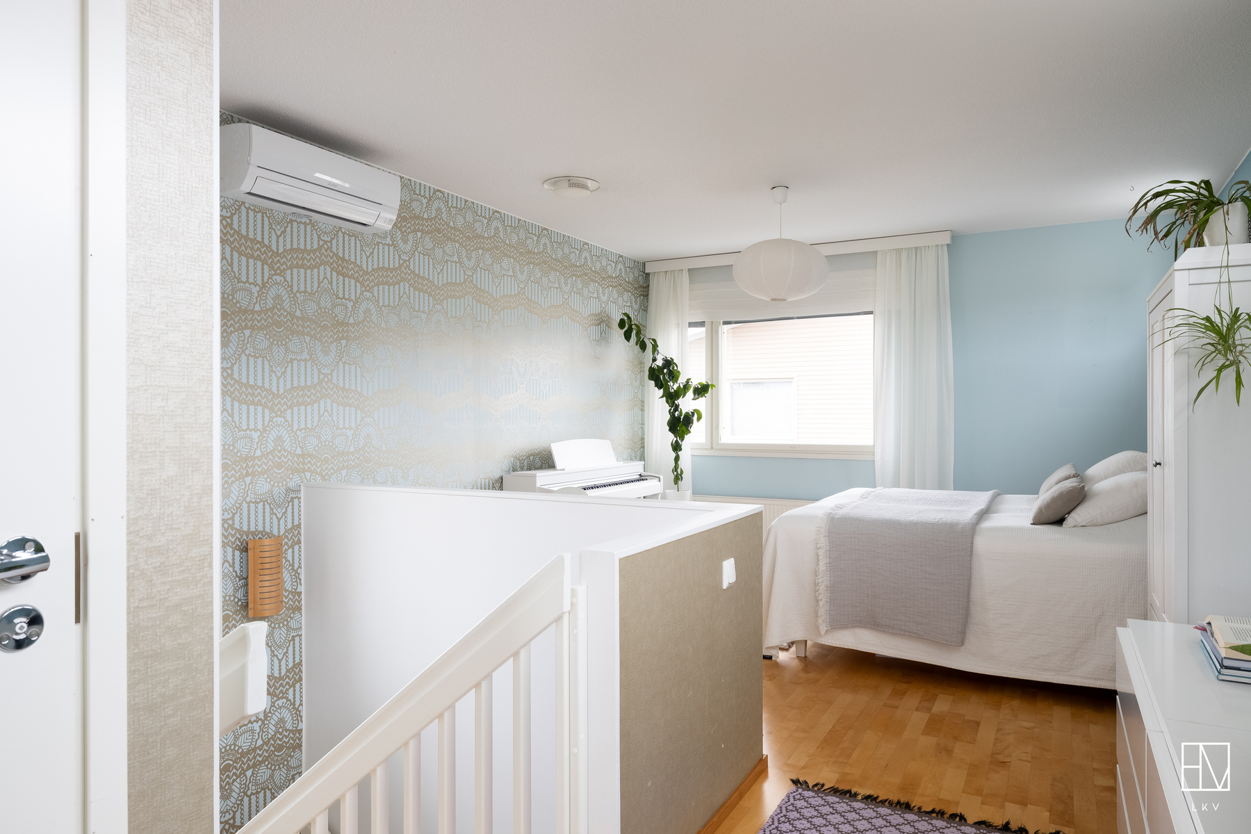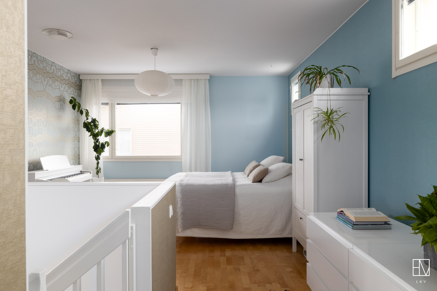 Yläkerrassa sijaitsee kaksi mukavan kokoista makuuhuonetta ja WC. Isomman makuuhuoneen seinä on avattu aulatilaan niin, että valo virtaa yläkertaan kaikista neljästä ilmansuunnasta.