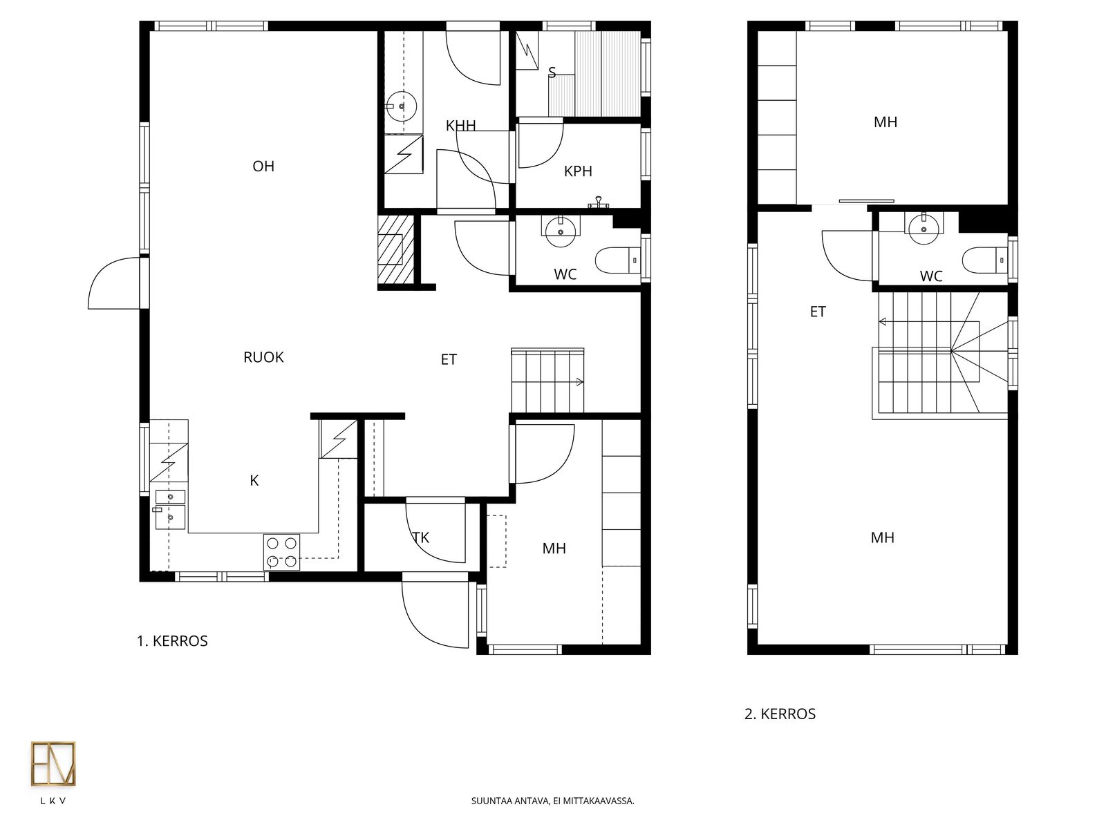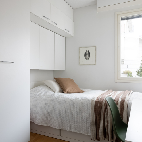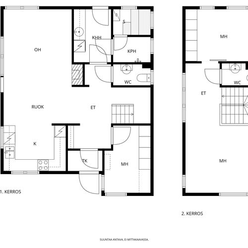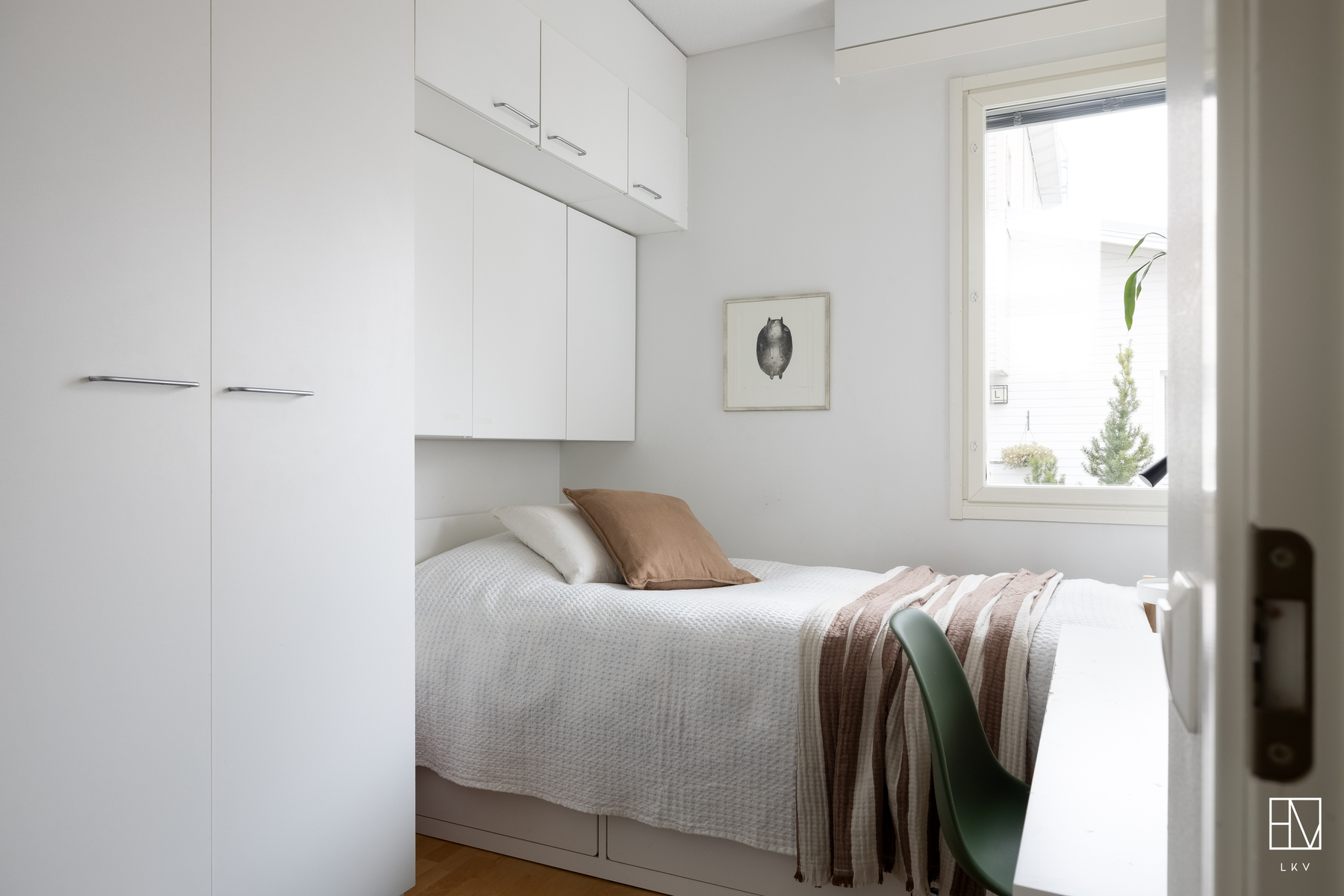 Yläkerrassa sijaitsee kaksi mukavan kokoista makuuhuonetta ja WC. Isomman makuuhuoneen seinä on avattu aulatilaan niin, että valo virtaa yläkertaan kaikista neljästä ilmansuunnasta.