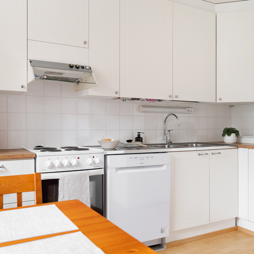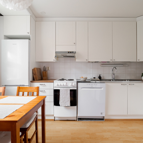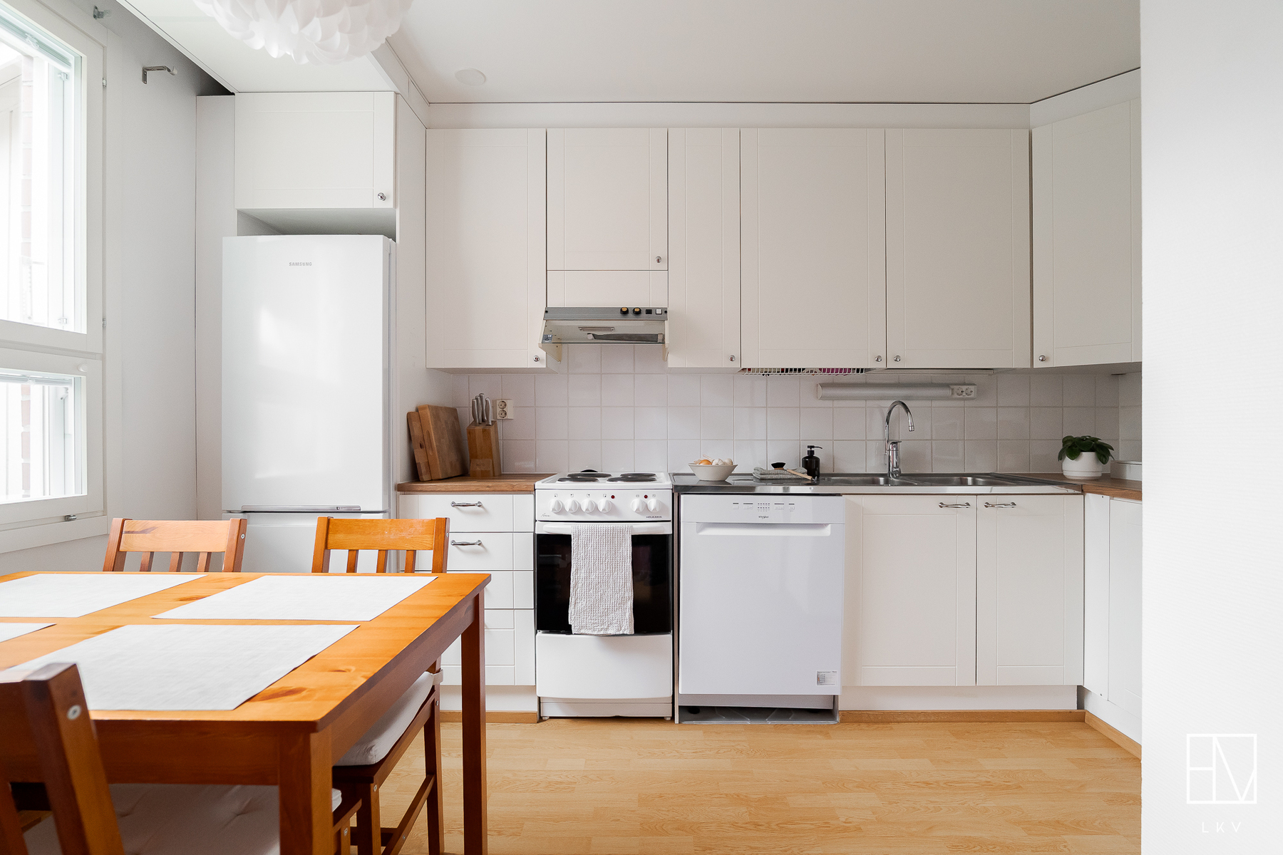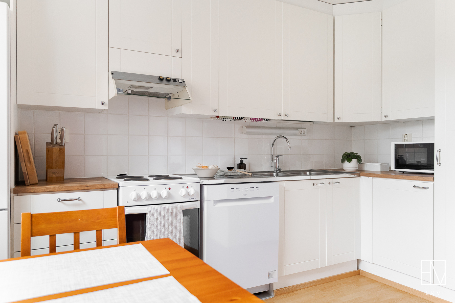 VARUSTUS: jääkaappi/pakastin, astianpesukone, sähköliesi, liesikupu.