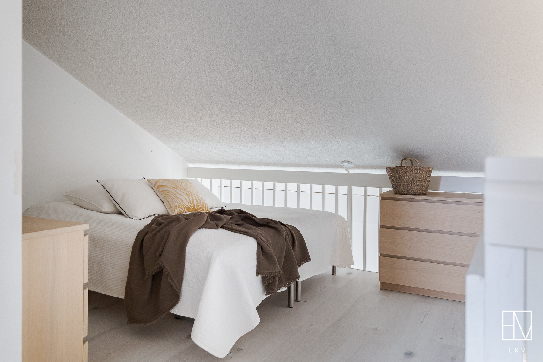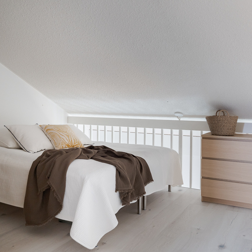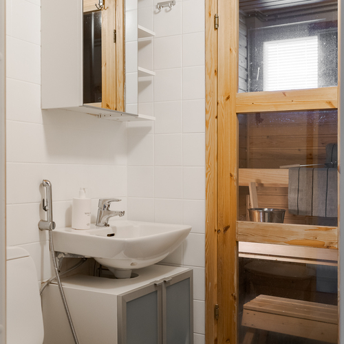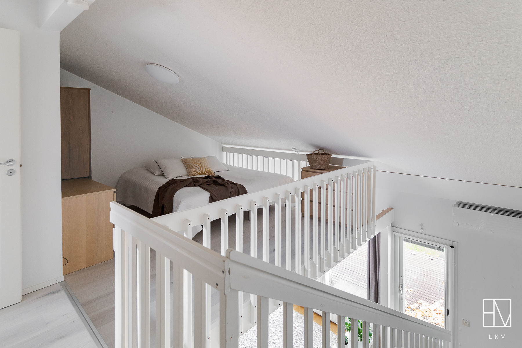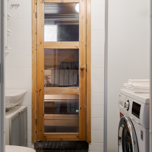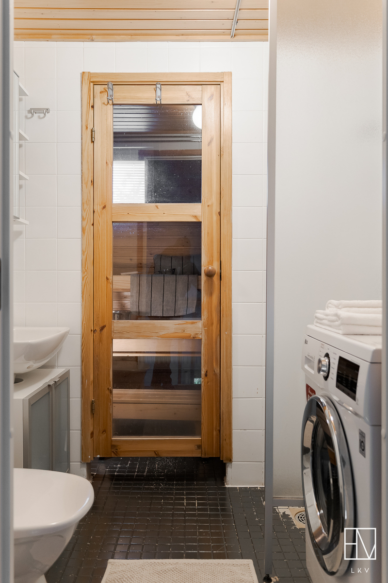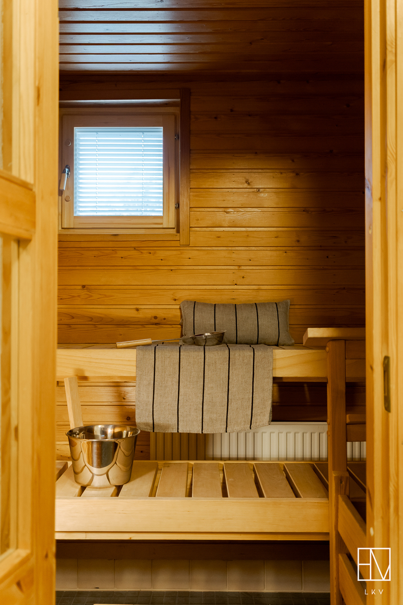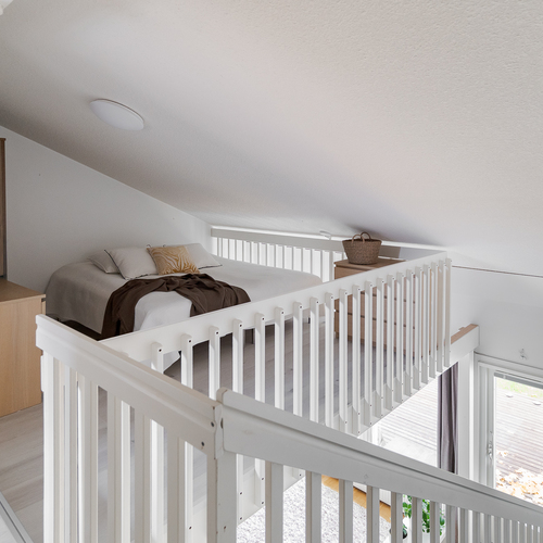 Yläkerrassa sijaitsee makuuhuone, avoin parvitila (esim. makuutilaksi tai työ- ja lisäoleskelutilaksi) sekä kylpyhuone ja oma sauna, joka kruunaa arjen rentoutumishetket. Makuuhuoneen yhteydessä on näppärä vaatehuone.