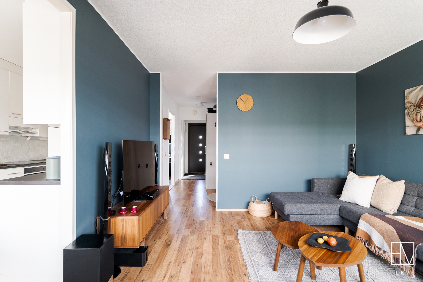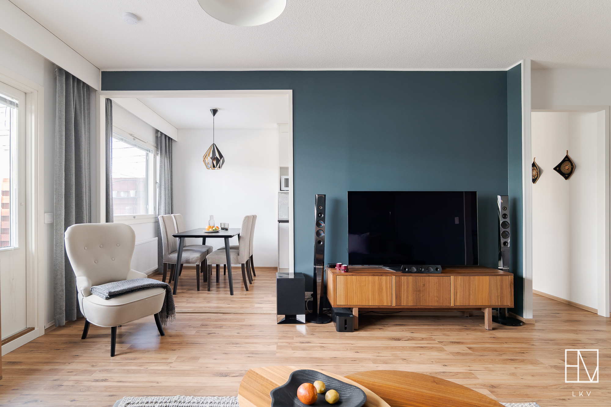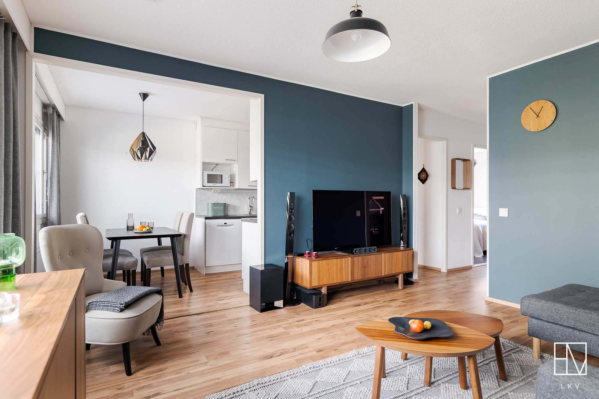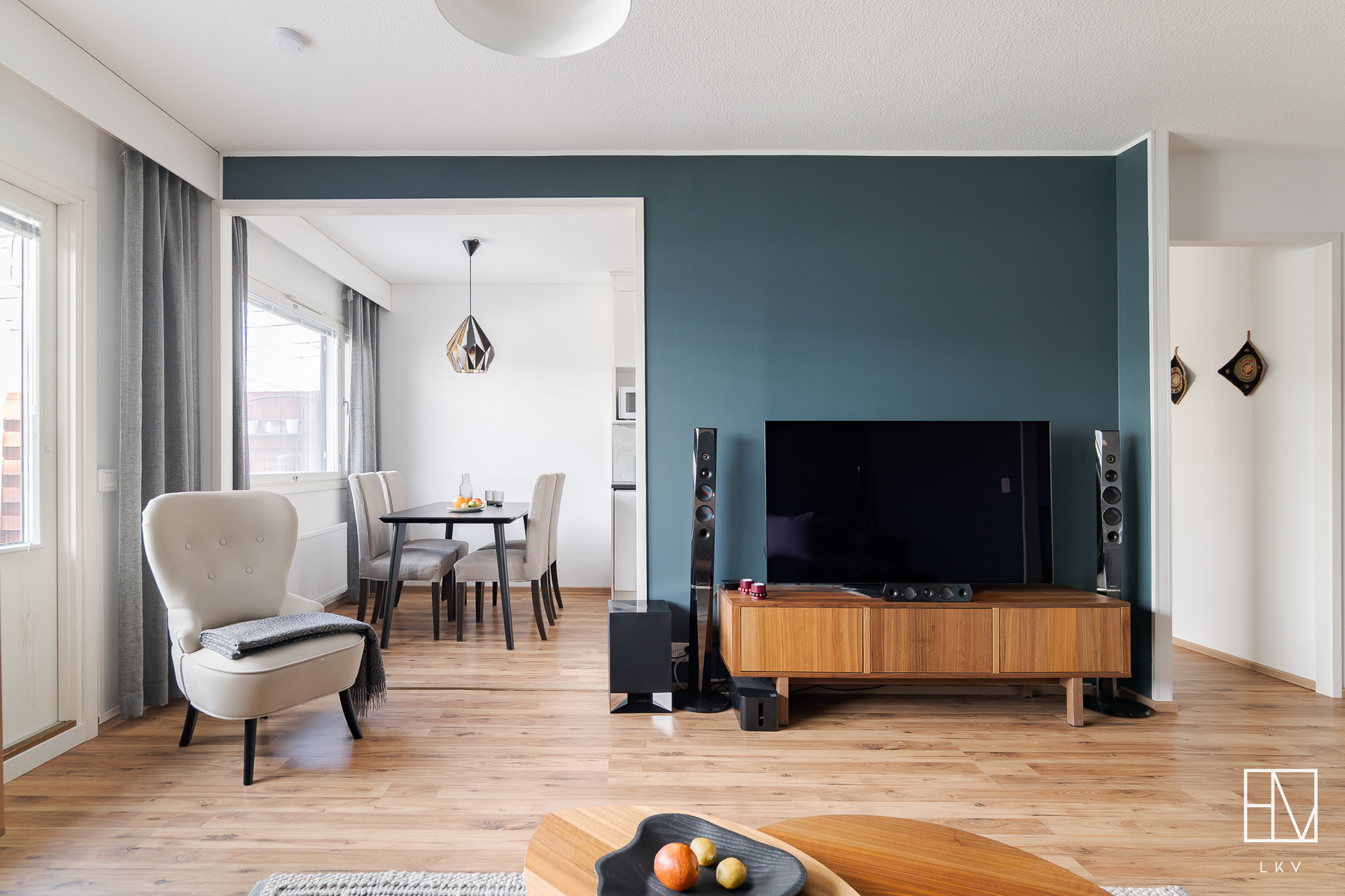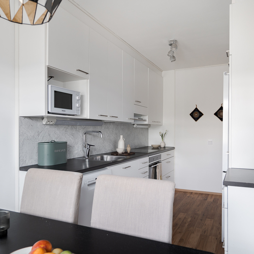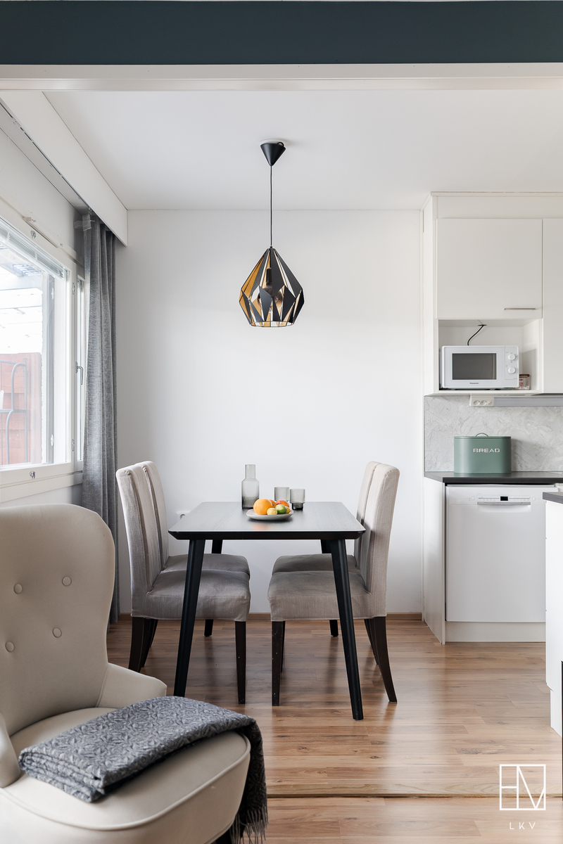 Avara olohuone avautuu valoisaa takapihaa kohti ja isoista ikkunoista luonnonvalo pääsee tulvimaan sisälle asuntoon. Olohuone yhdistyy ruokailutilan kautta vuonna 2019 uusittuun keittiöön, jonka varusteluun kuuluvat mm. jääkaappipakastin, induktioliesitaso ja erillisuuni, paikka mikrolle, astianpesukone sekä runsas kaappi- ja säilytystila. Keittiöön mahtuu iso ruokapöytä ja näkymä avautuu suojaisaa takapihaa kohti. Takapihalla on sekä iso katettu terassialue, että nurmialuetta, joka rajautuu aina kunnan omistaman alueen kautta Pyhäojaan asti. Lisäksi asunnolle kuuluu oma sähköpistokkeellinen autopaikka ja niin asunnon etu- kuin takapihalla on vielä kylmävarasto tuoden mukavasti lisäsäilytystilaa perheen tarpeisiin.