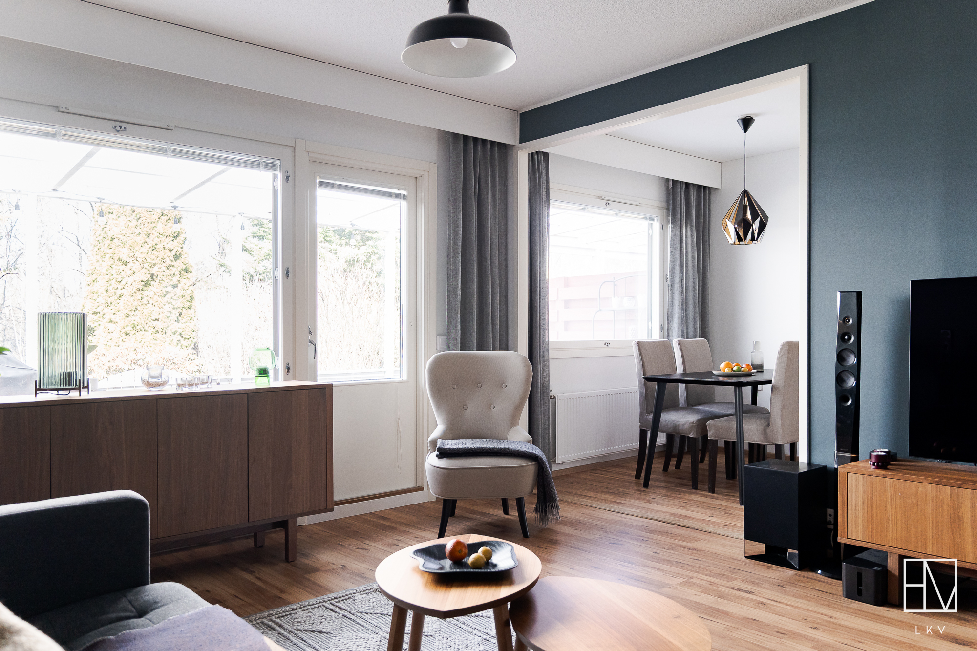 Asunnon olohuoneesta avautuvat vehreät näkymät takapihaa kohti ja makuuhuoneet avautuvat etupihalle päin.